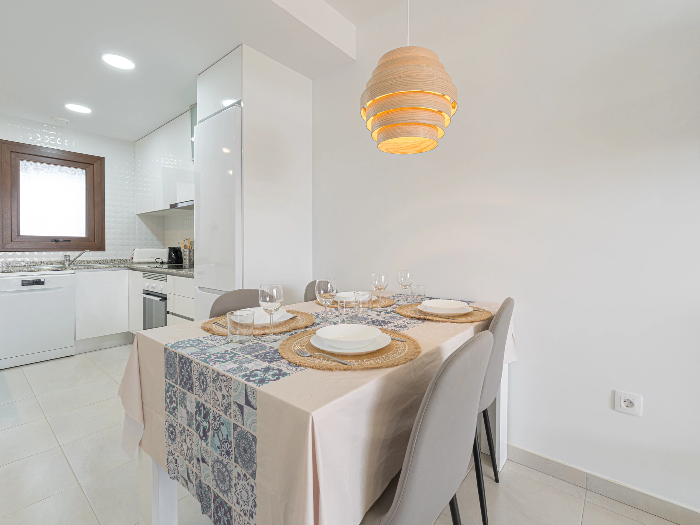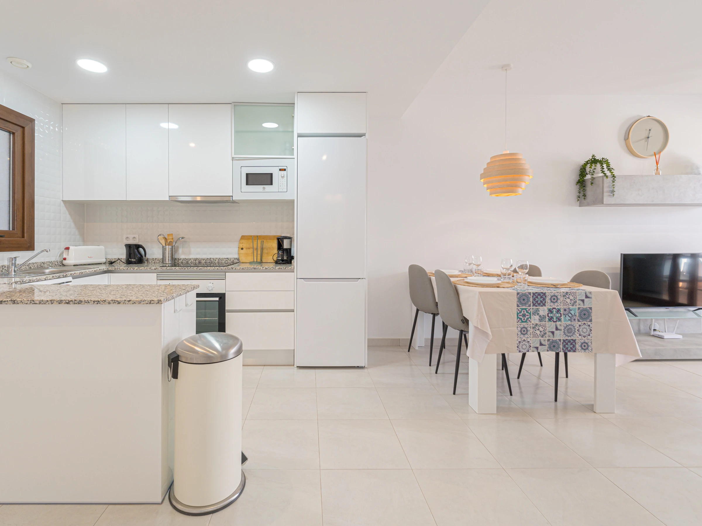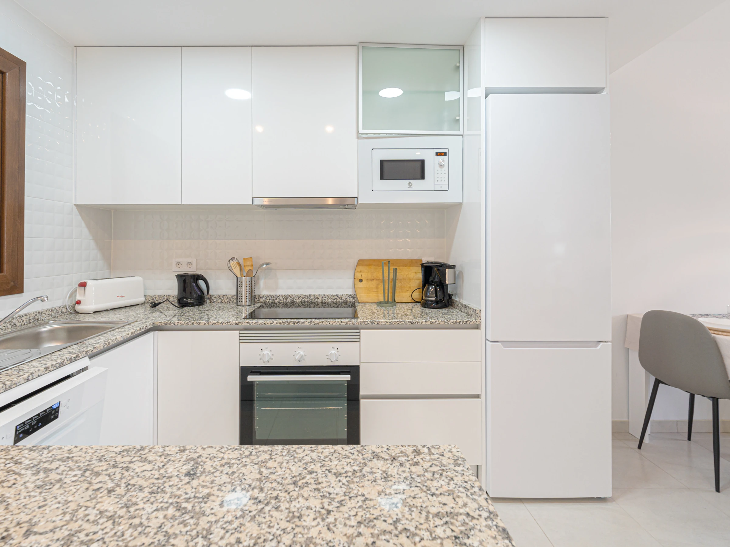 La cuisine américaine, à vitrocéramique, est équipée avec réfrigérateur, micro-ondes, four, congélateur, lave-vaisselle, vaisselle/couverts, ustensiles/cuisine, cafetière, grille pain et bouilloire.