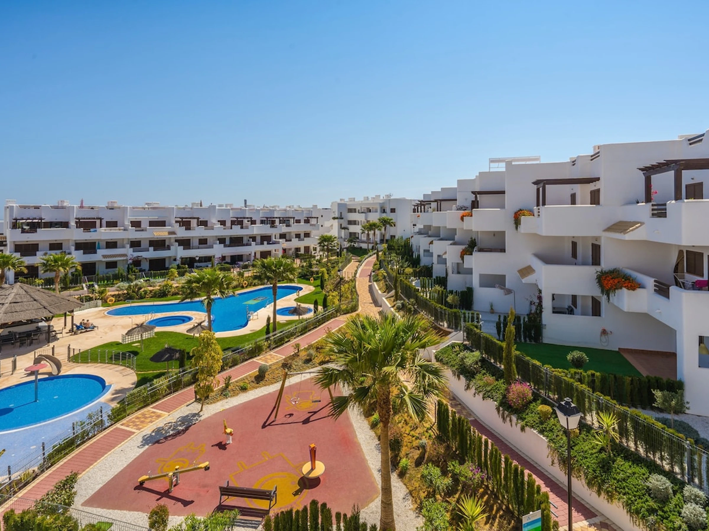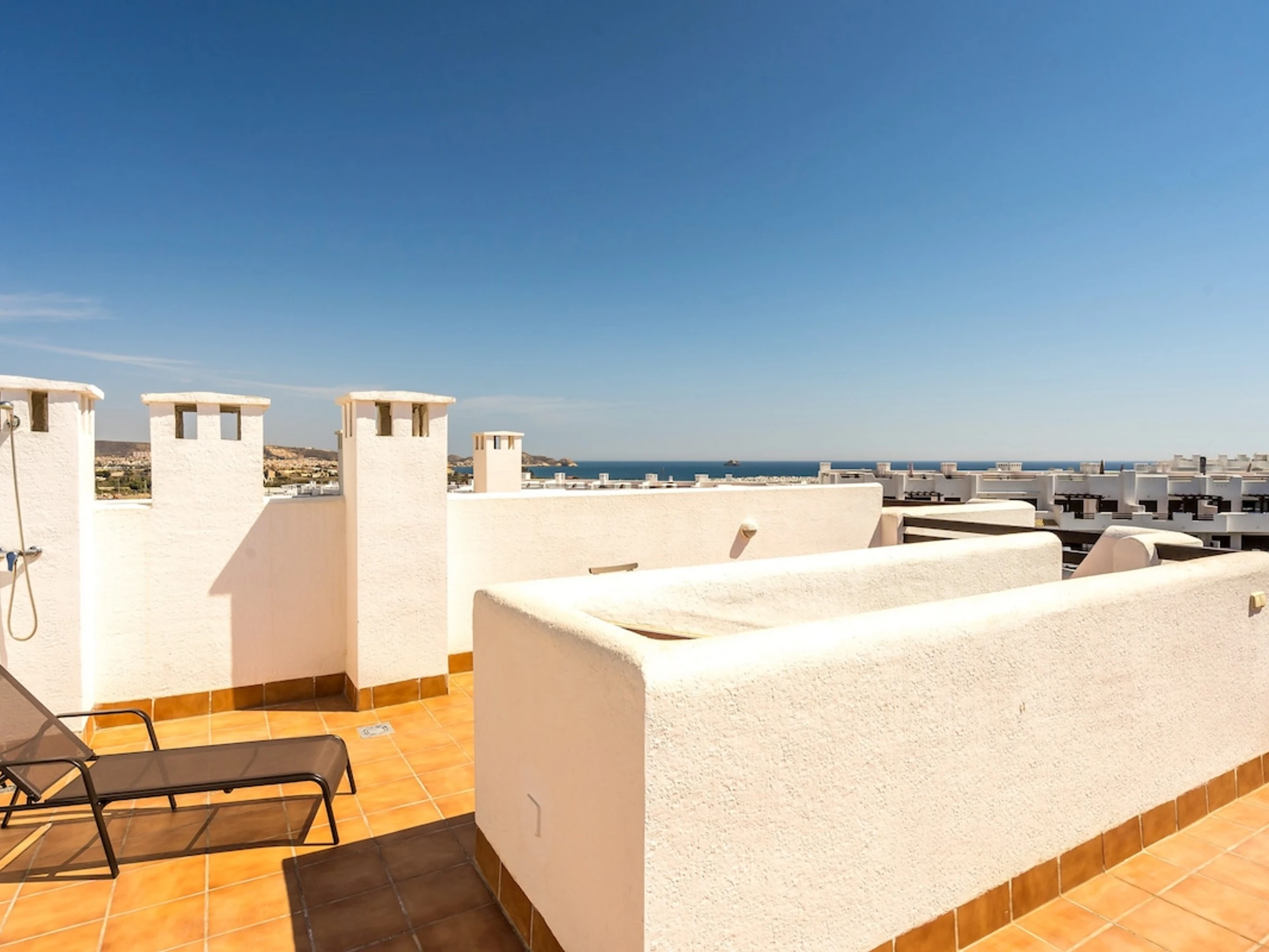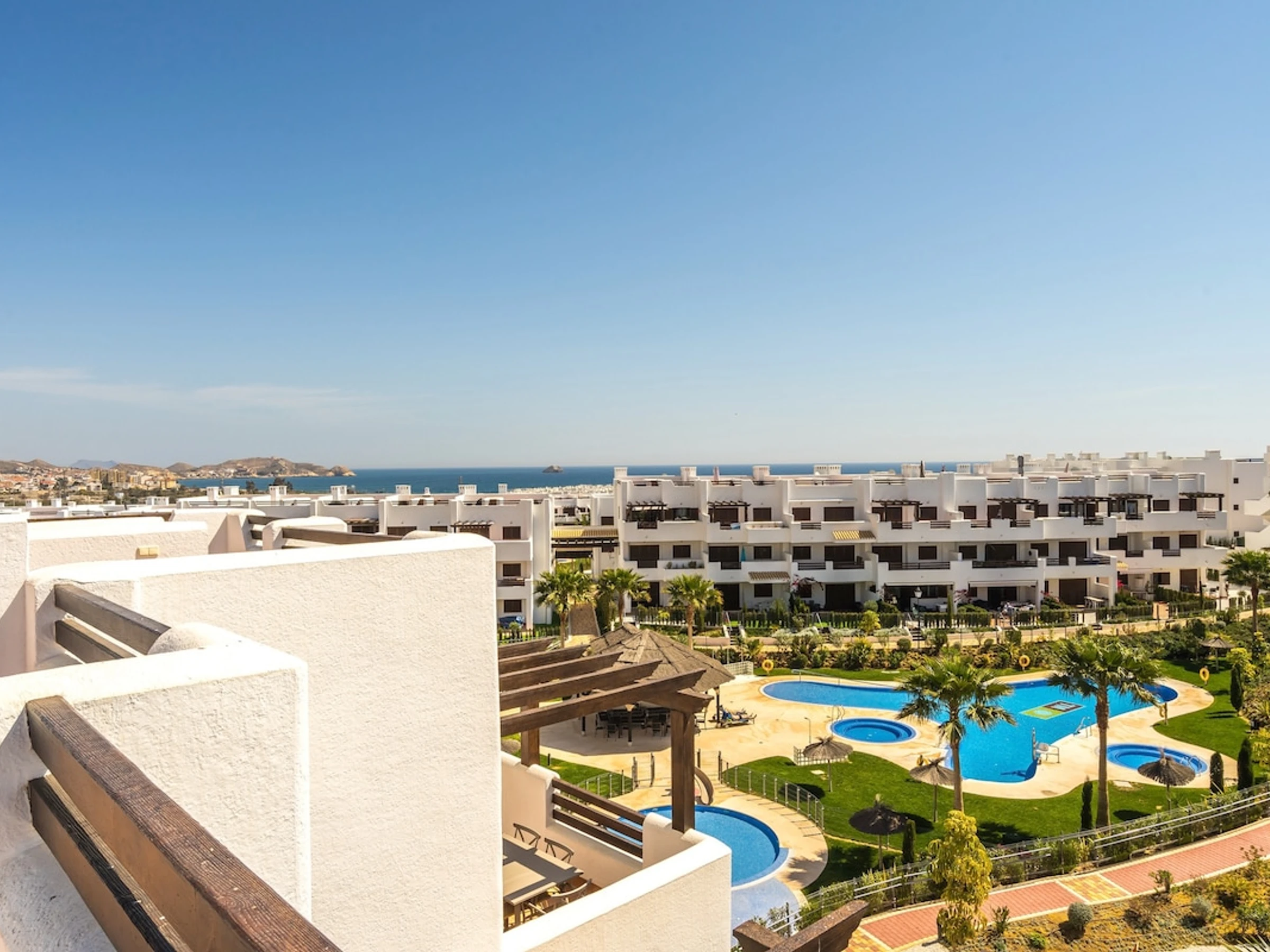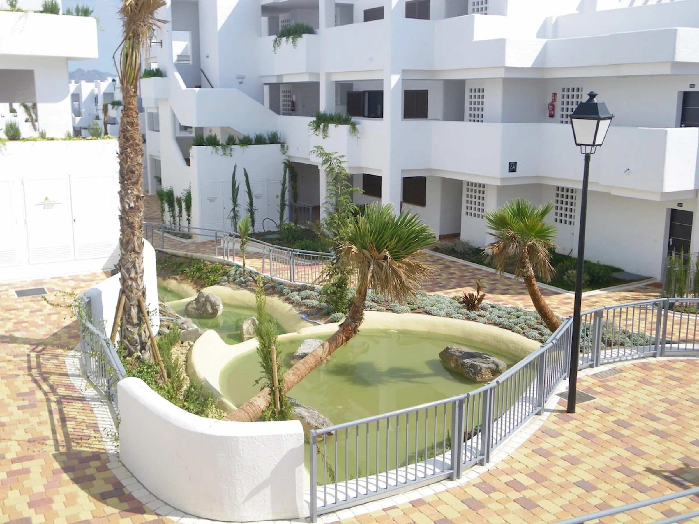Grand appartement avec piscine commune à San Juan de los Terreros, Andalousie, Espagne pour 4 personnes. Situé dans un complexe de vacances avec bar et restaurant, dans une région balnéaire et montagneuse, près de magasins et de supermarchés et à 500 m de la plage.