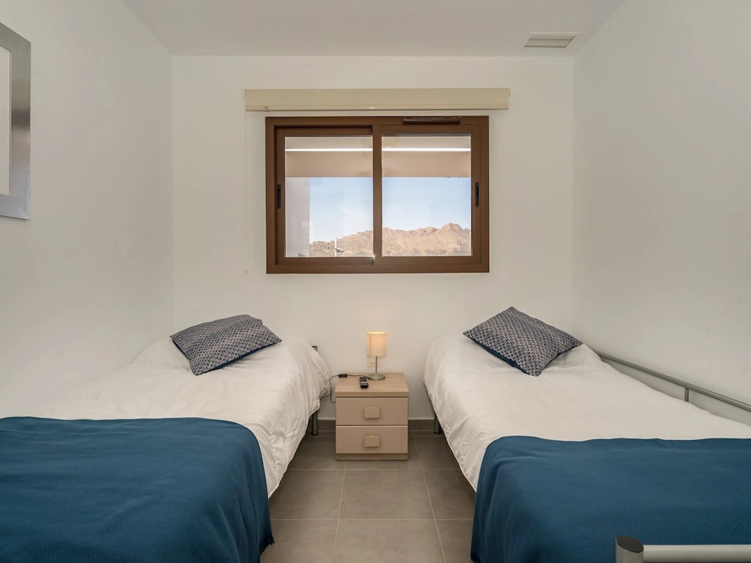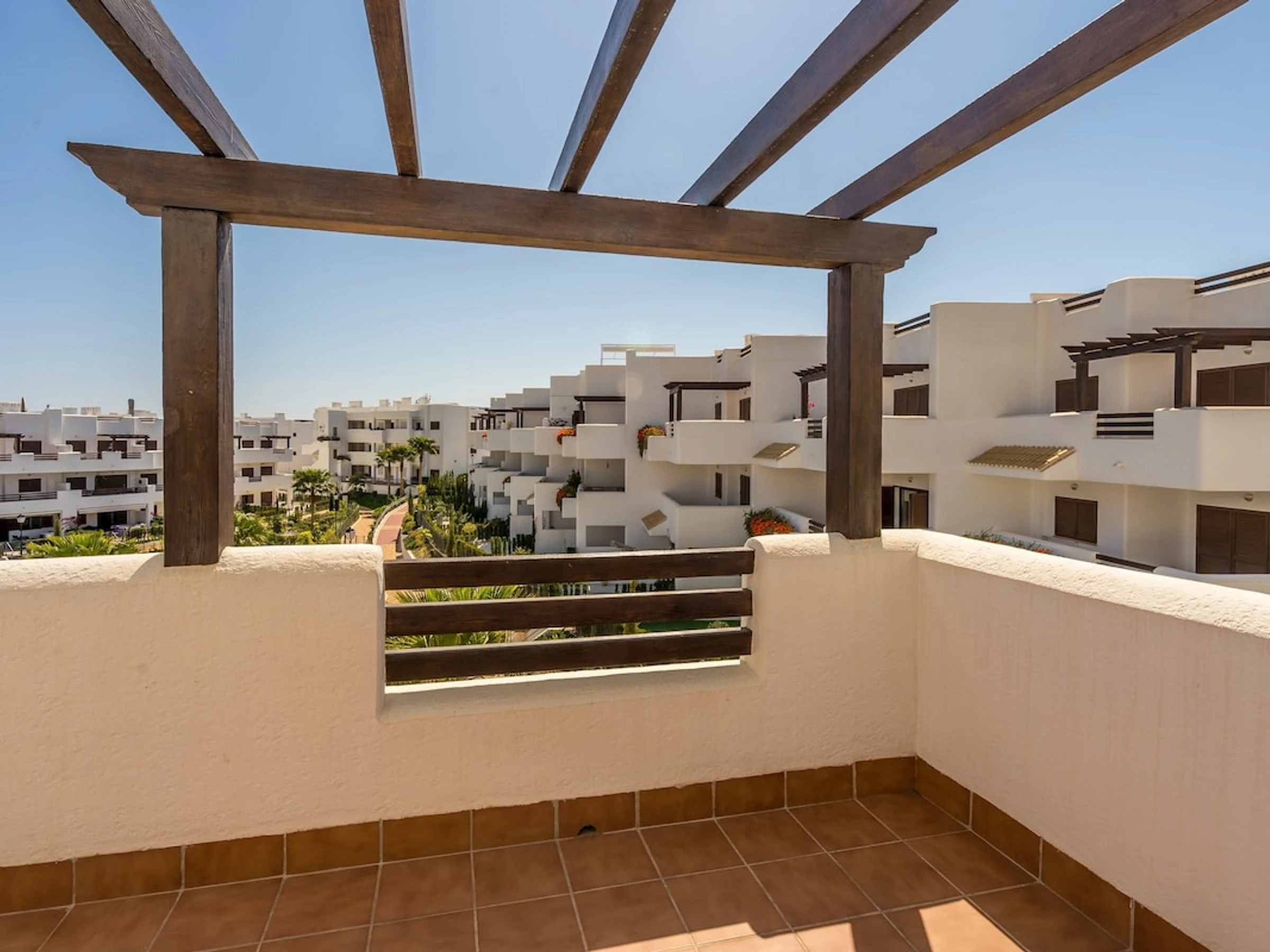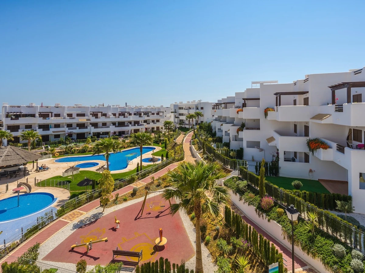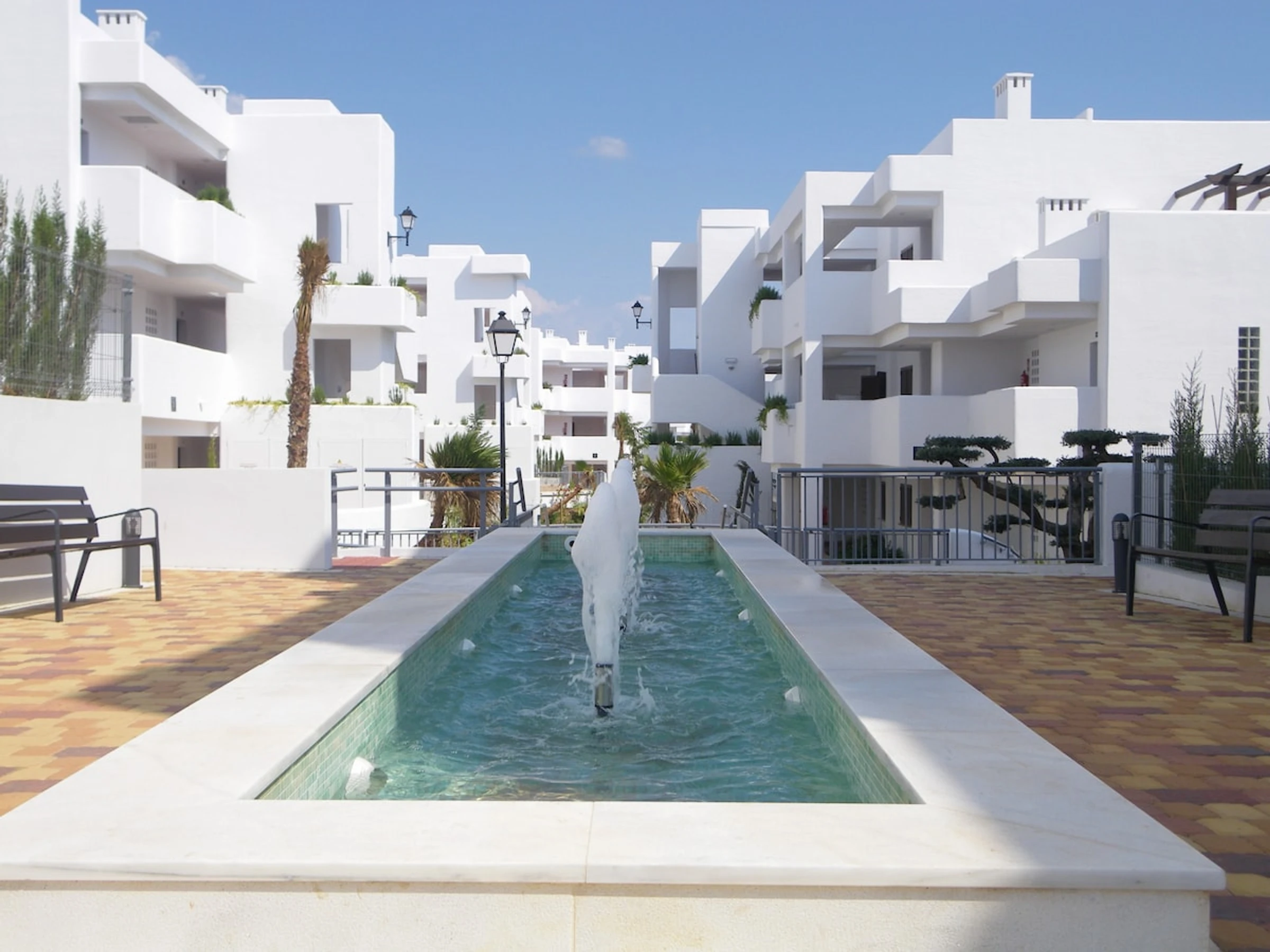 Grand appartement avec piscine commune à San Juan de los Terreros, Andalousie, Espagne pour 4 personnes. Situé dans un complexe de vacances avec bar et restaurant, dans une région balnéaire et montagneuse, près de magasins et de supermarchés et à 500 m de la plage.