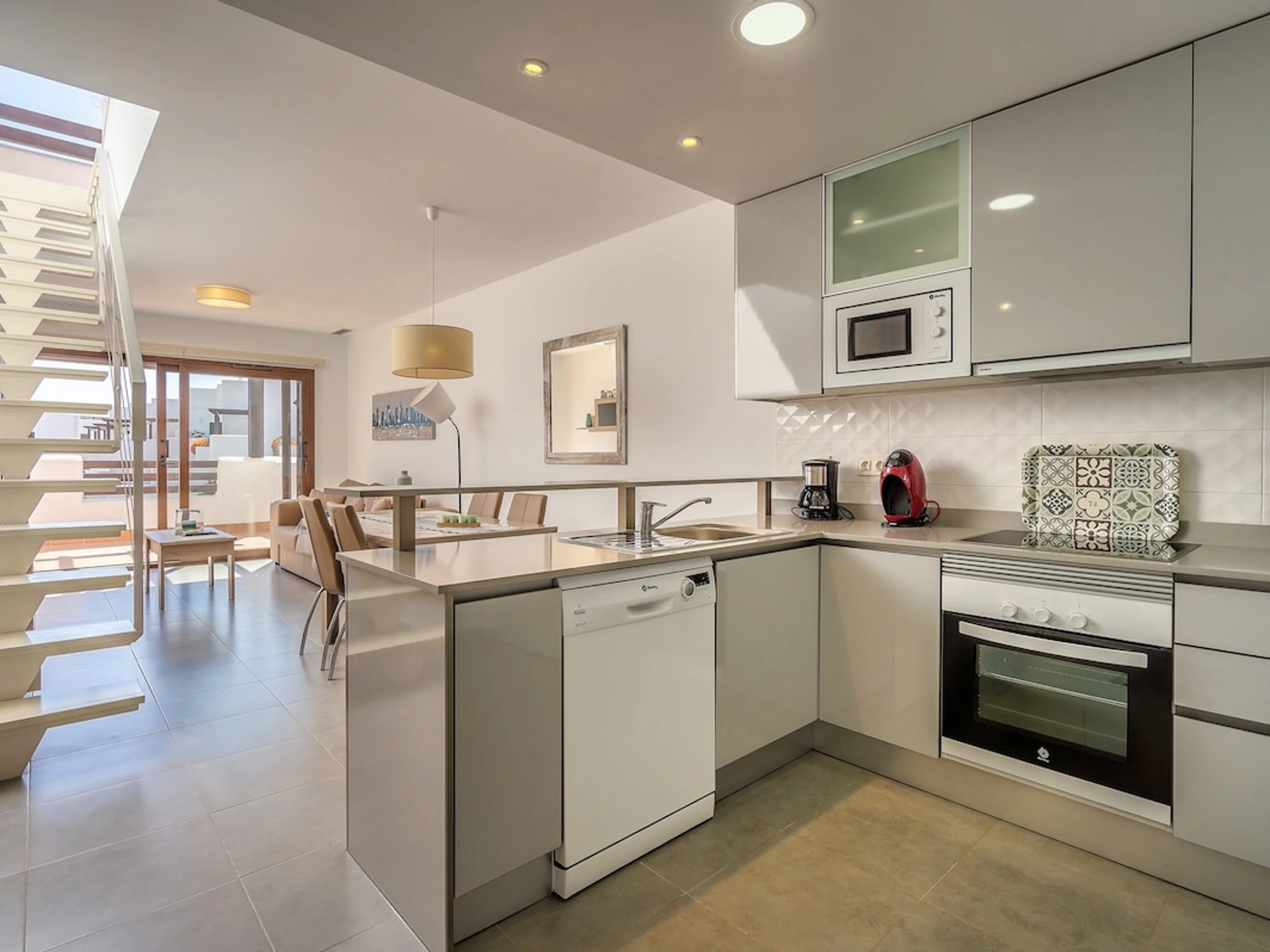 - cuisine américaine avec cuisinière à induction, four électrique, four à micro-ondes, lave-vaisselle, refrigérateur, congélateur, cafetière électrique, bouilloire et grille-pain