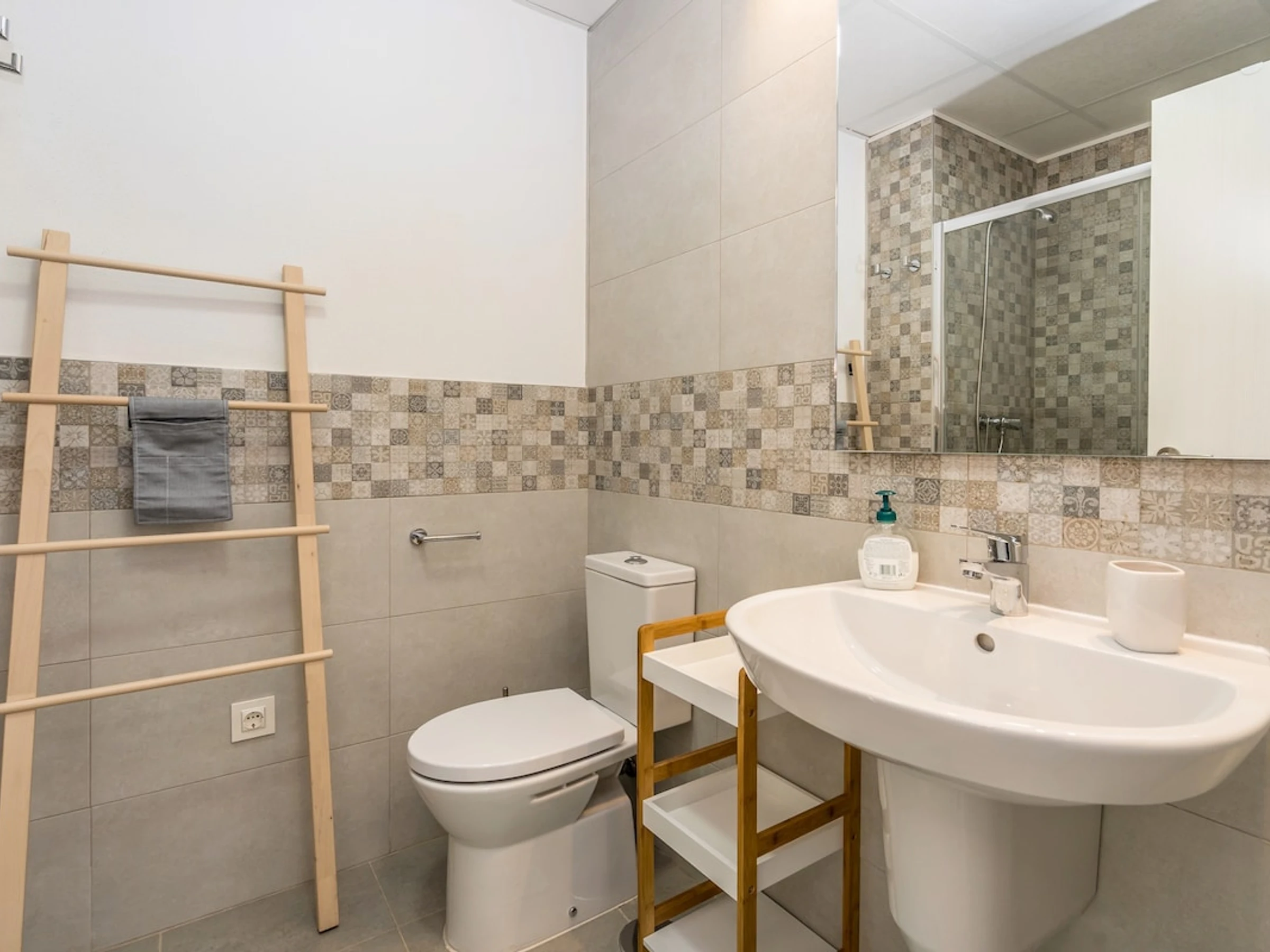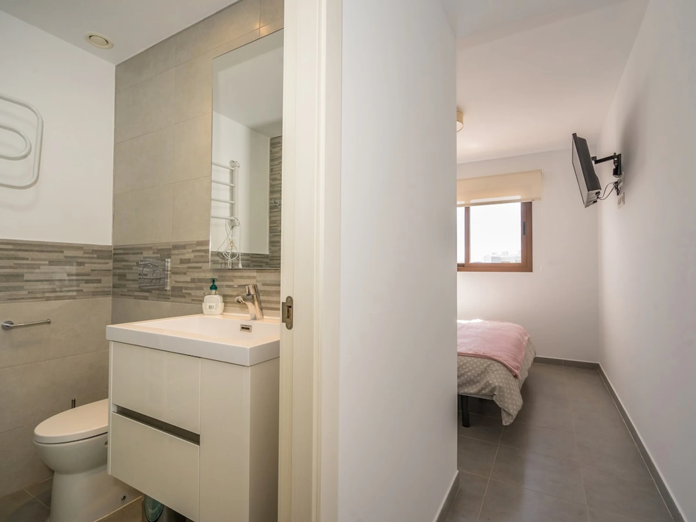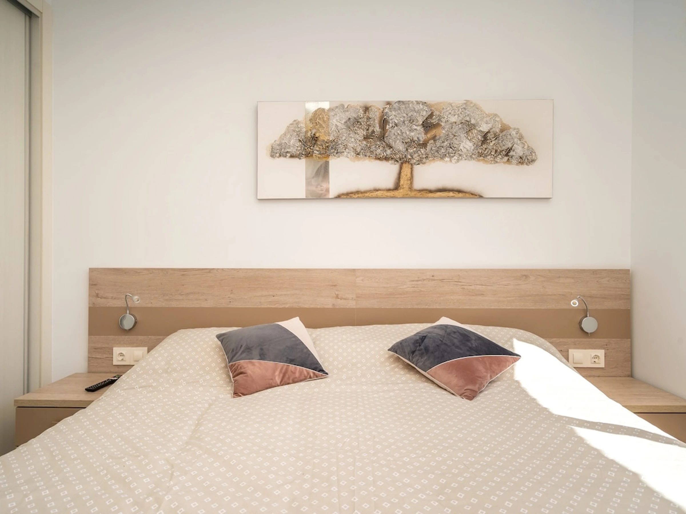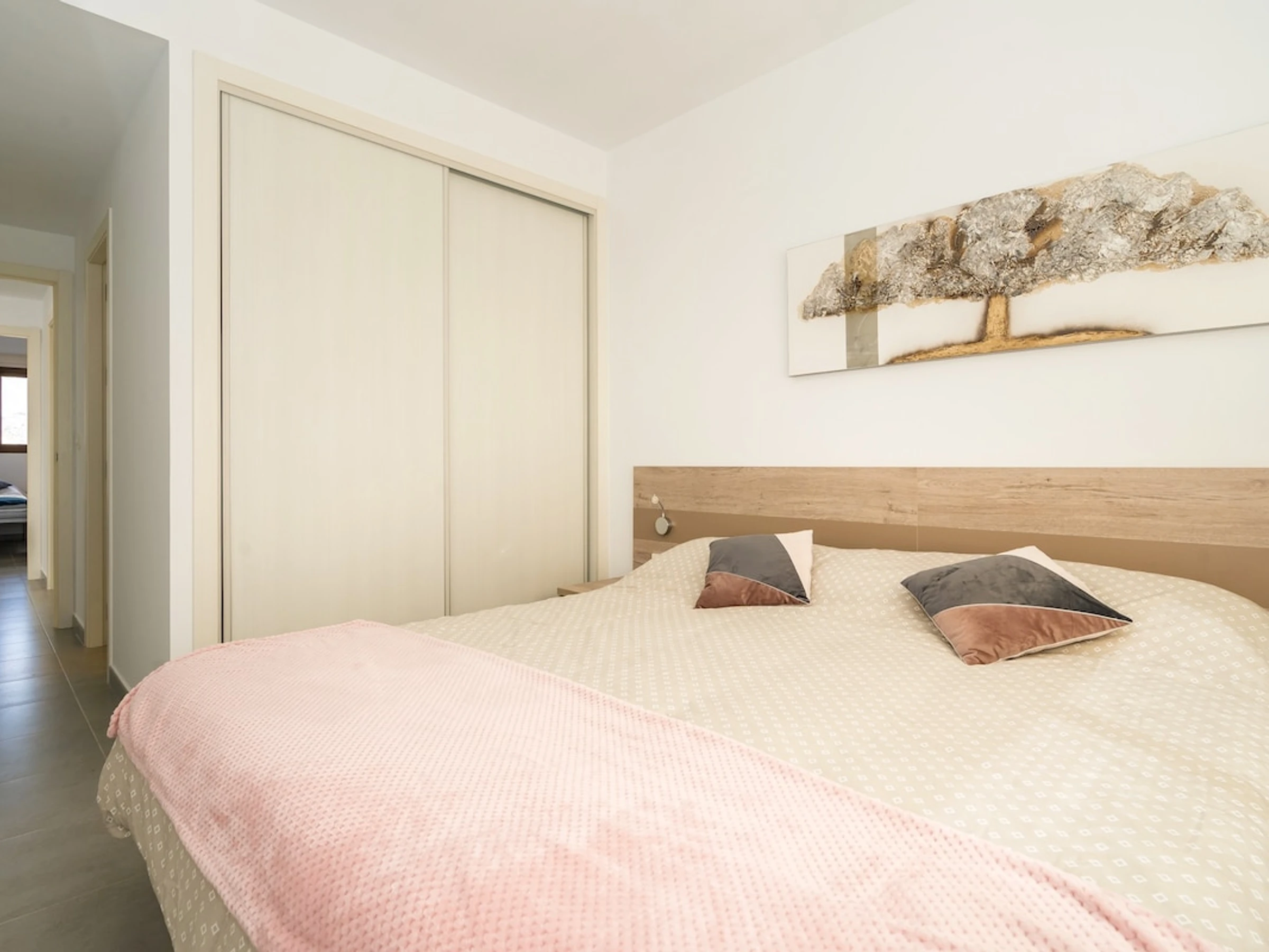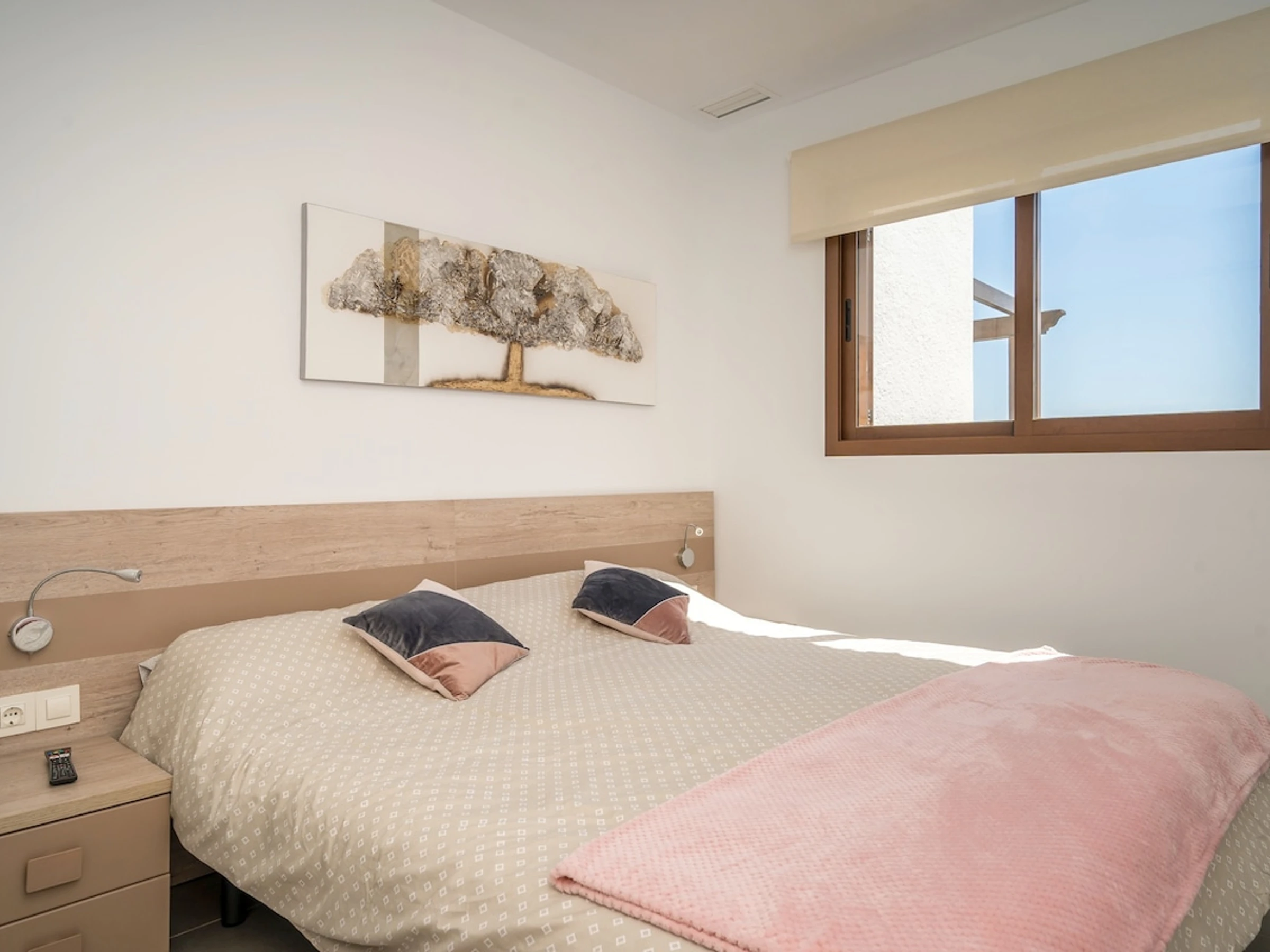 2 chambres à coucher et 2 salle de bain. Le logement offre un jardin communal avec pelouse et d´arbres et une vue merveilleuse sur mer et sur la piscine. Le voisinage de la plage, d'endroits pour faire du shopping, d'activités sportives, de lieux de divertissement et d'endroits pour sortir rend cet appartement un logement convenable pour passer les vacances en Espagne avec votre famille ou vos amis.