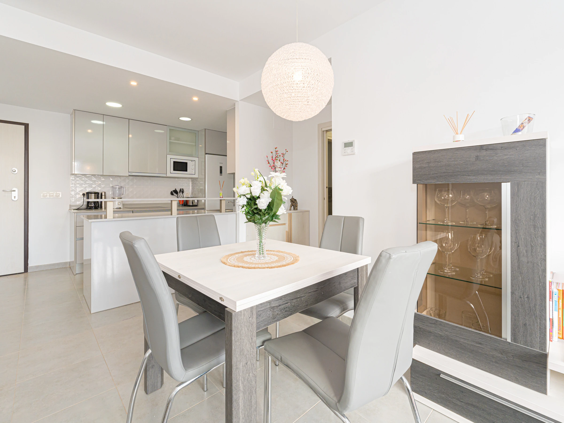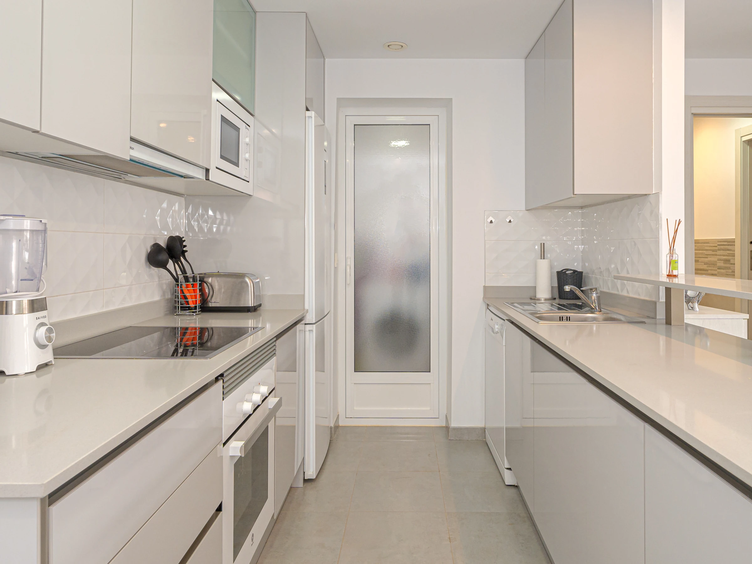 La cuisine américaine, à vitrocéramique, est équipée avec réfrigérateur, micro-ondes, four, congélateur, lave-vaisselle, vaisselle/couverts, ustensiles/cuisine, cafetière, grille pain, bouilloire et presse-agrumes.