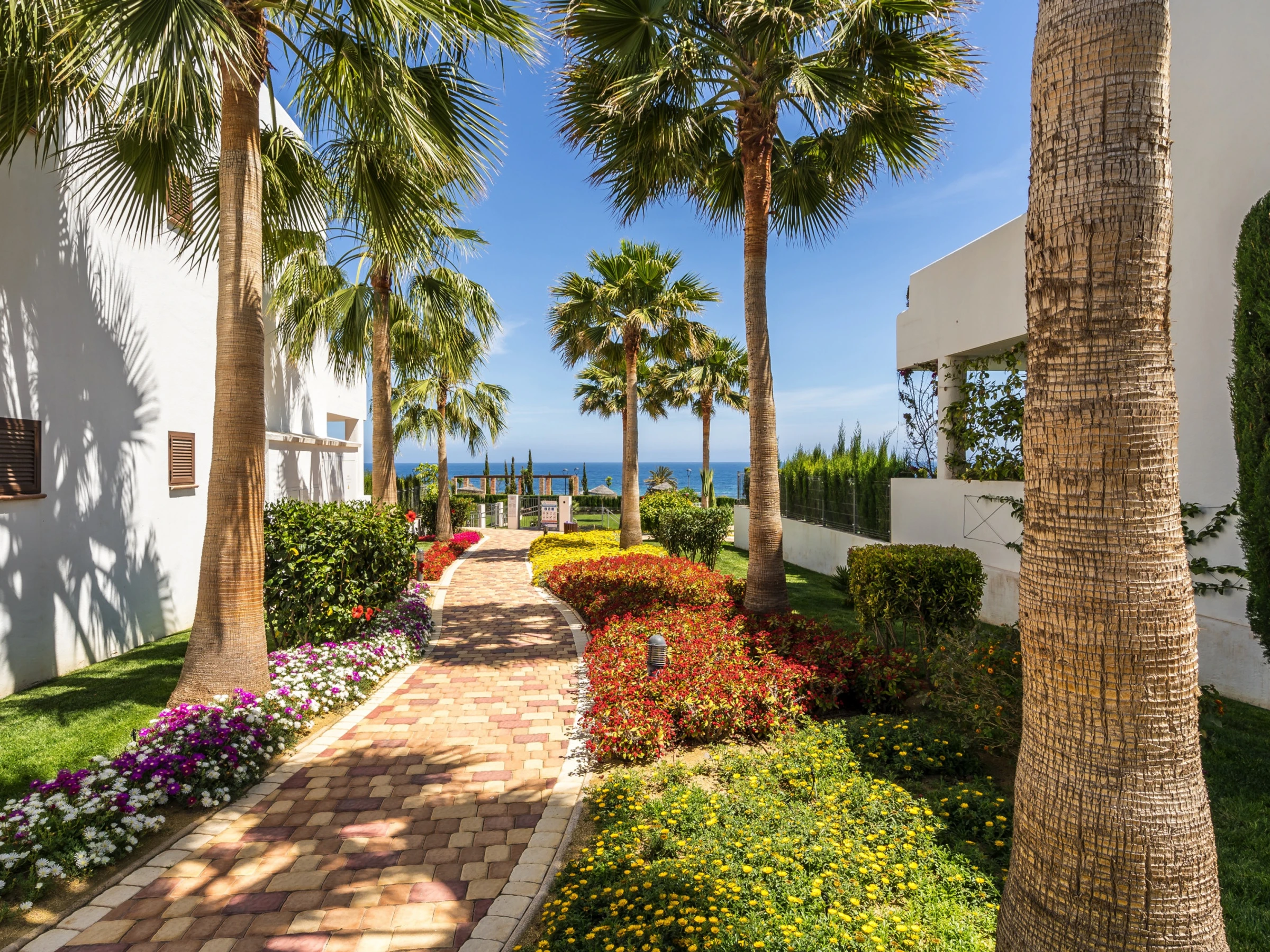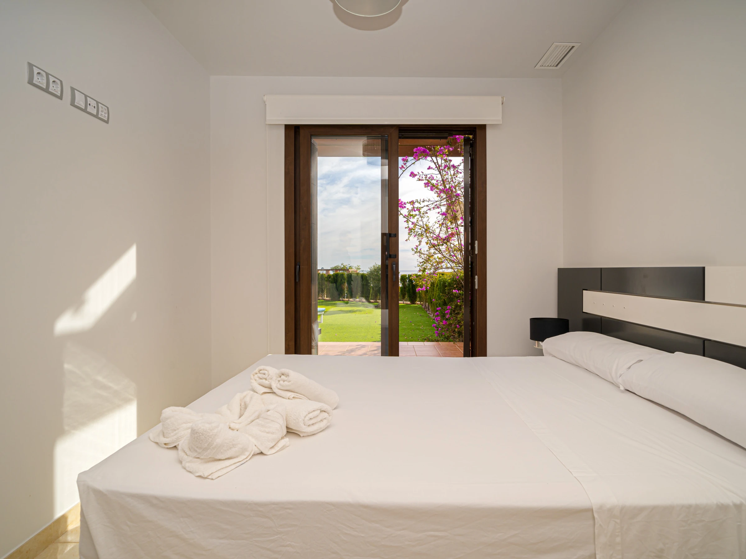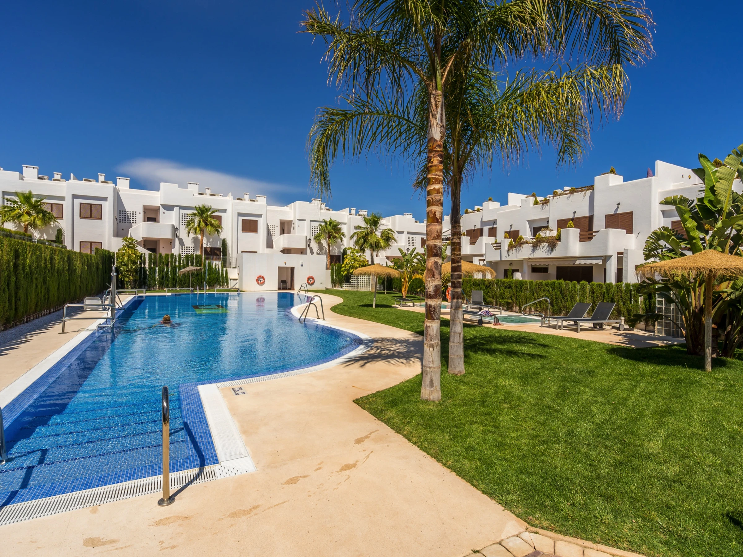M a 3 chambres à coucher et 2 salles de bain. Le logement offre de l'intimité, un beau jardin privé avec pelouse et d´arbres, un jardin communal avec pelouse et d´arbres, une vue merveilleuse sur la plage et sur mer et une belle vue sur la vallée et sur la montagne. Le comfort et le voisinage de la plage, d'endroits pour faire du shopping, d'activités sportives et d'endroits pour sortir rendent cet appartement un logement convenable pour passer les vacances en Espagne avec votre famille ou vos amis.