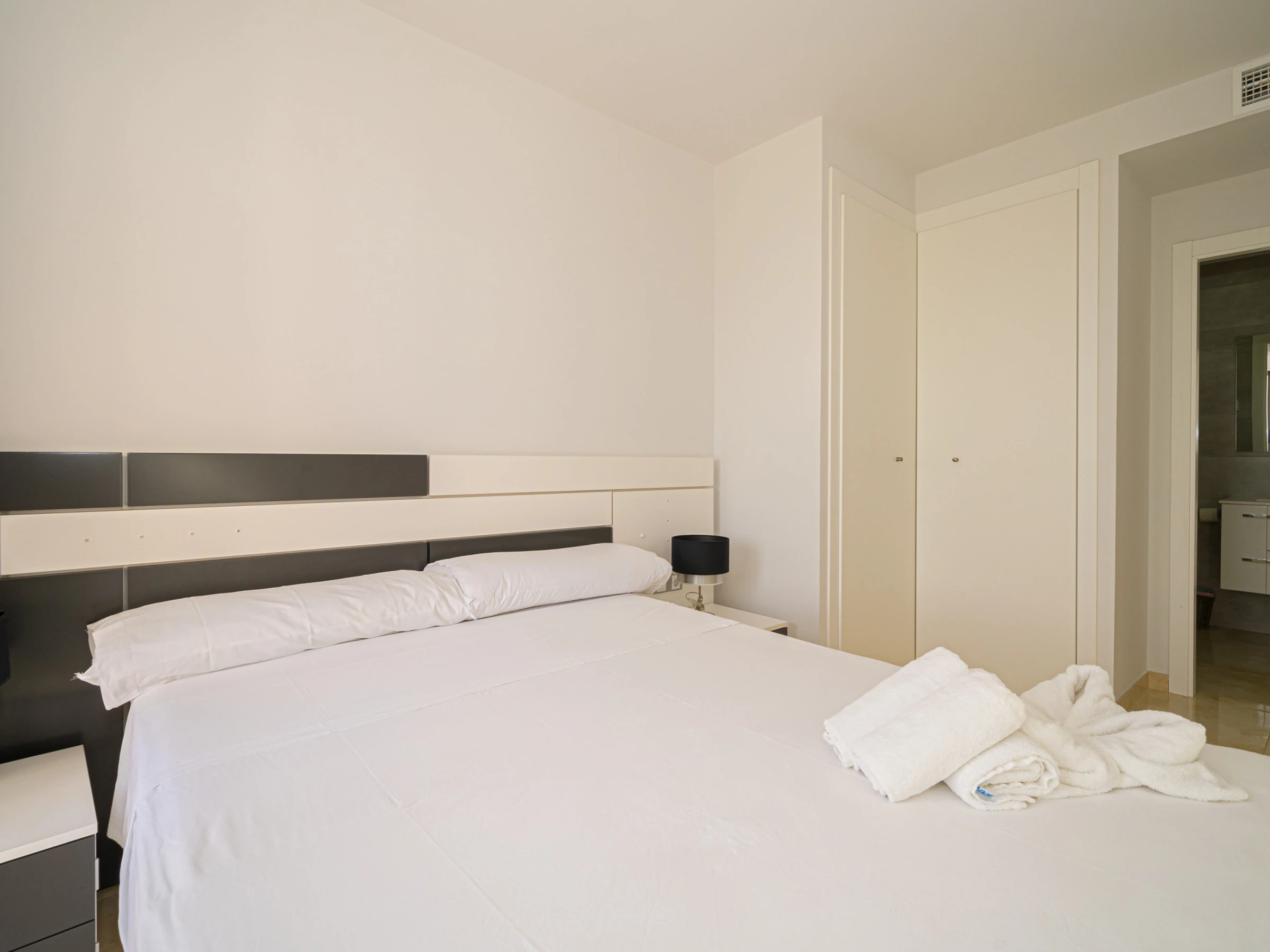 - chambre à coucher climatisée avec lit double et salle de bain en suite