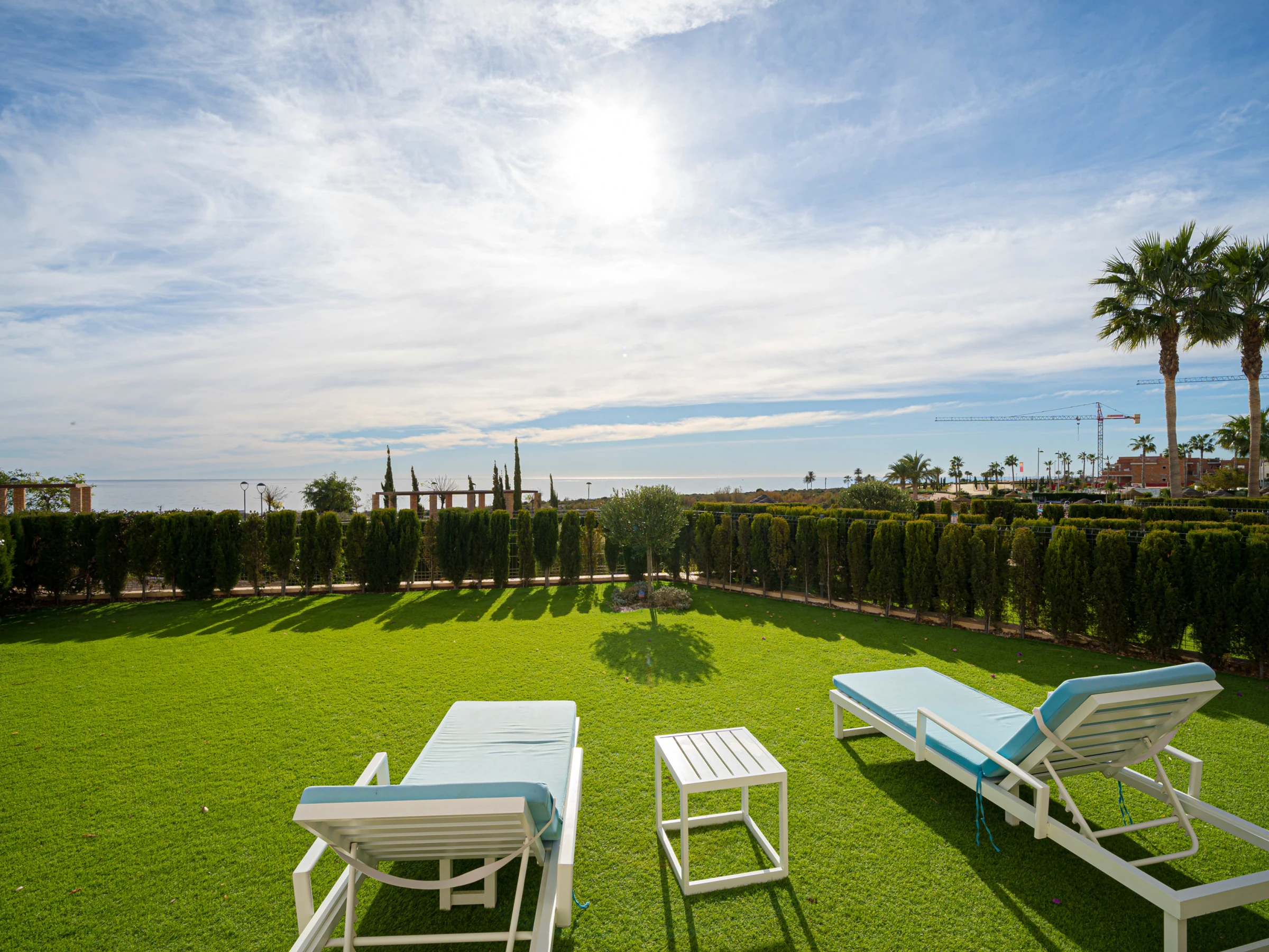 - beau jardin privé avec pelouse, d´arbres et mobilier de jardin avec chaises longues