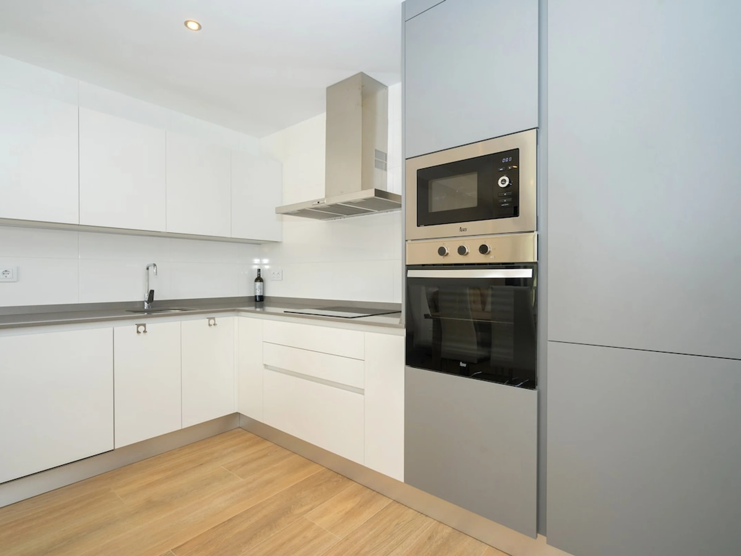 - cuisine américaine avec taque à induction, four électrique, four à micro-ondes, lave-vaisselle, réfrigérateur, congélateur, machine à café Senseo, bouilloire et grille-pain
