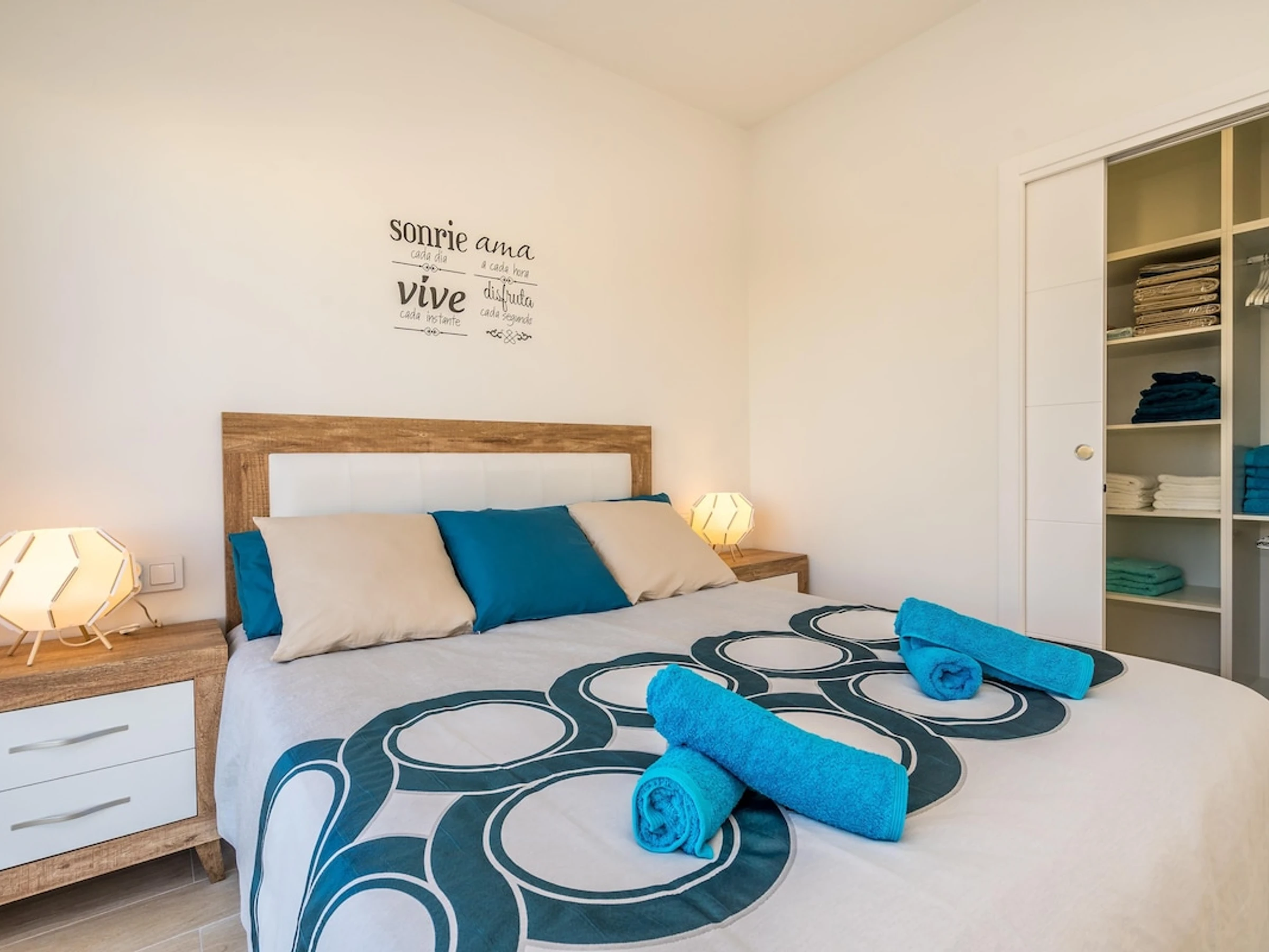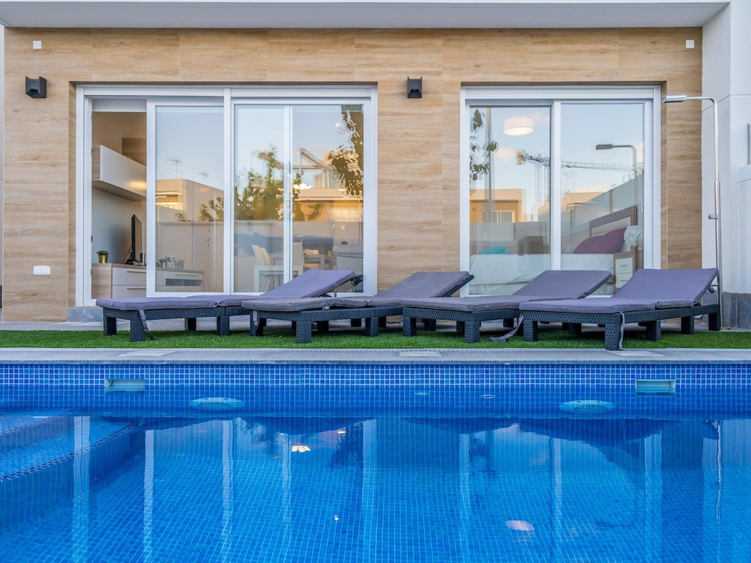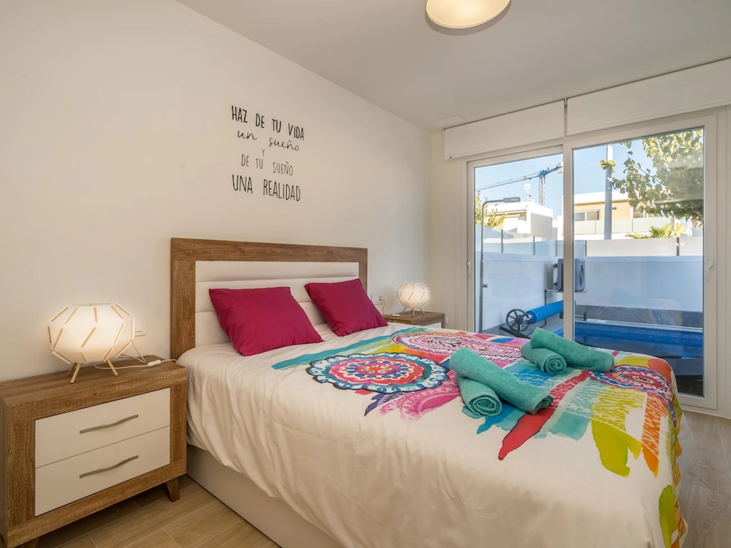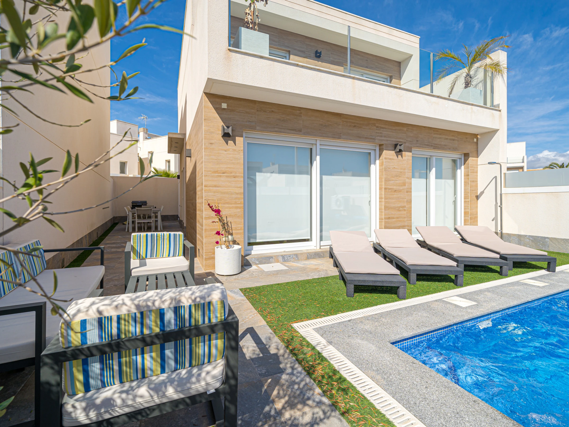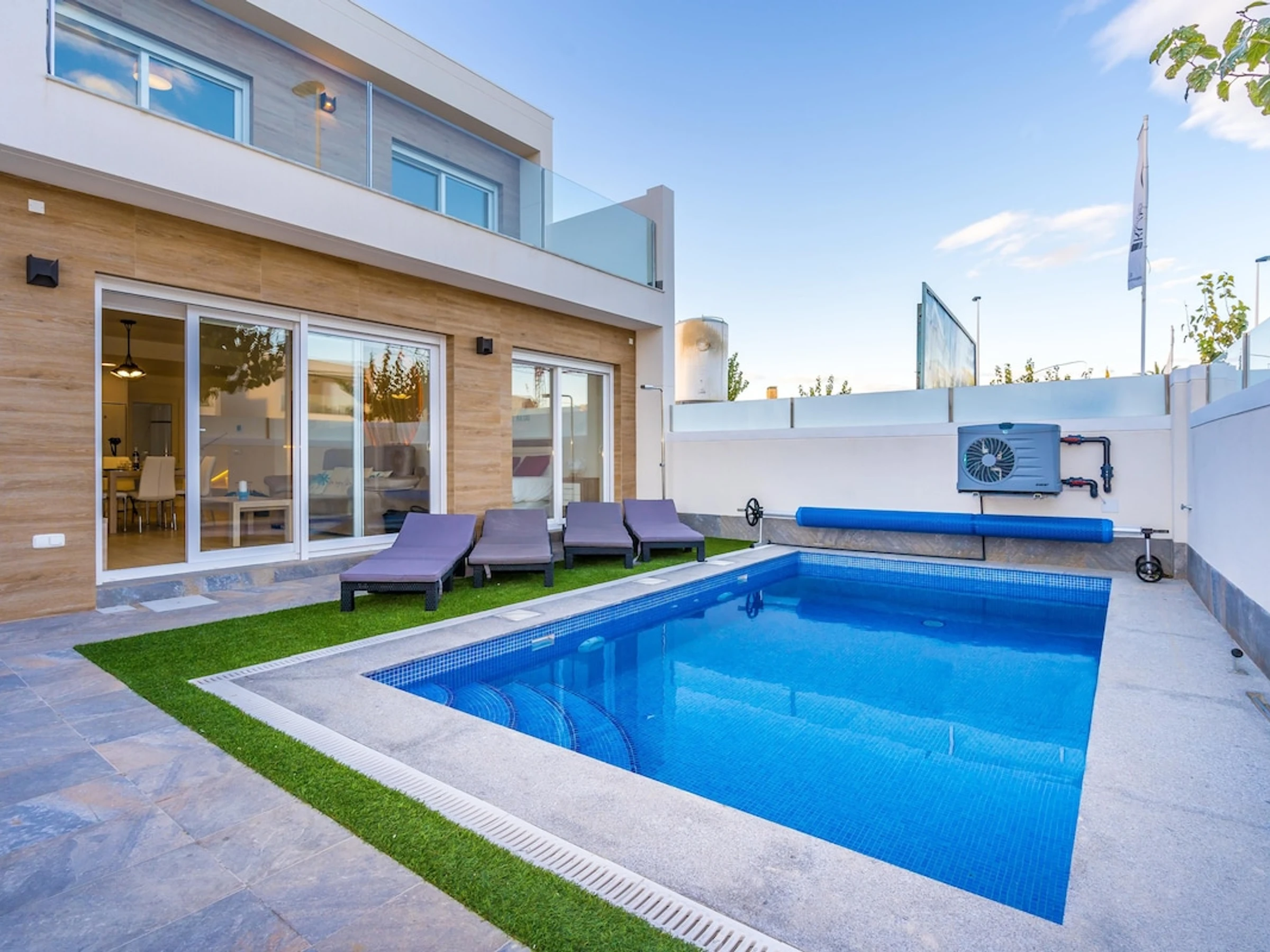 La villa a 3 chambres à coucher, 2 salles de bain. Réparties sur 2 étages. Le logement offre de l'intimité, un beau jardin avec pelouse et arbres et une belle piscine chauffée. Son comfort et sa proximité à la plage, d'endroits pour faire du shopping et d'endroits pour sortir rendent cette villa, le logement idéal pour passer des vacances en Espagne avec votre famille ou vos amis.