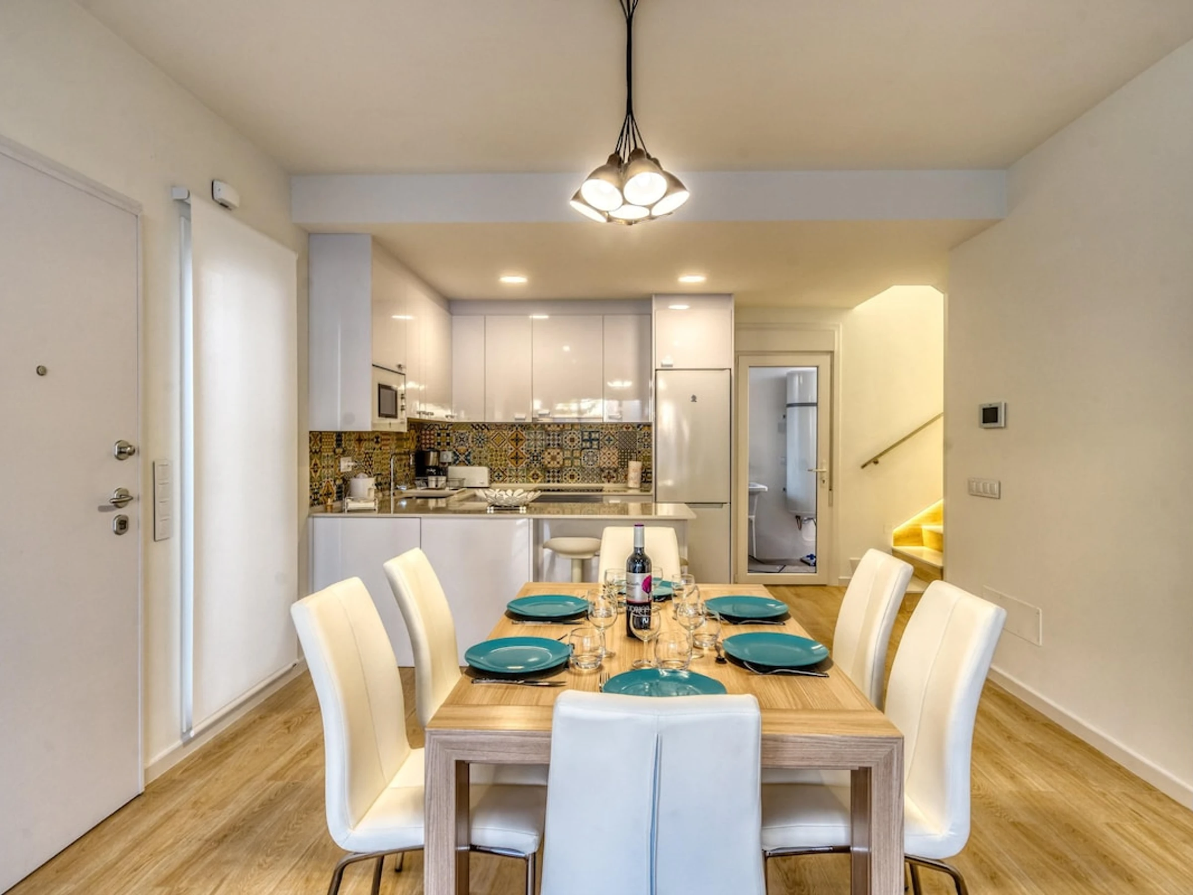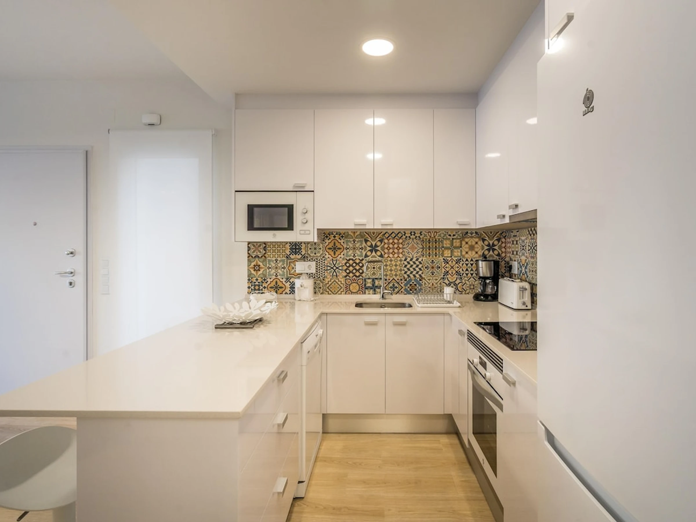 - cuisine américaine avec cuisinière à induction, four électrique, four à micro-ondes, lave-vaisselle, refrigérateur, congélateur, cafetière électrique, bouilloire et grille-pain