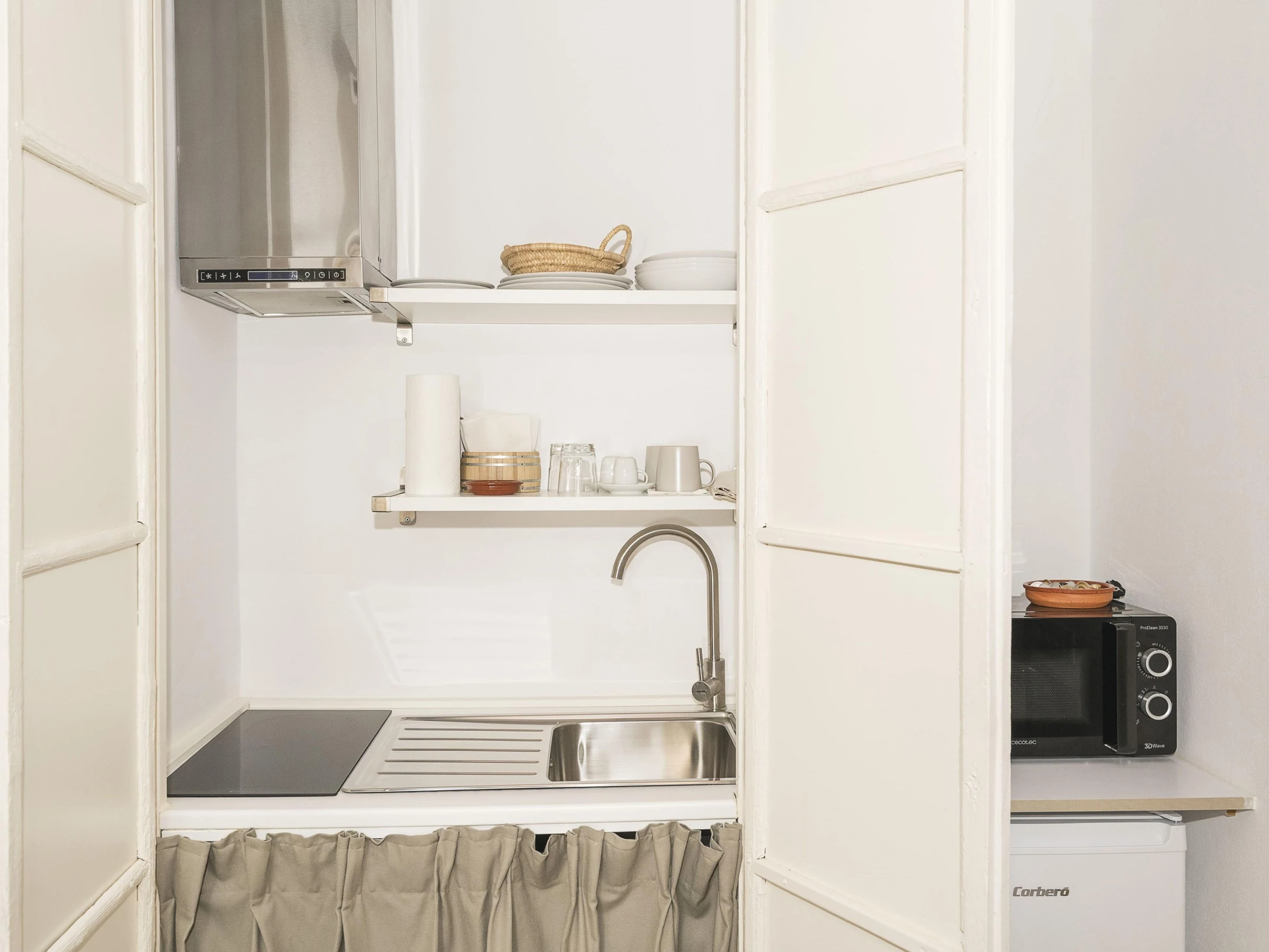 La cuisine, est équipée avec réfrigérateur, micro-ondes, congélateur, cafetière et grille pain.