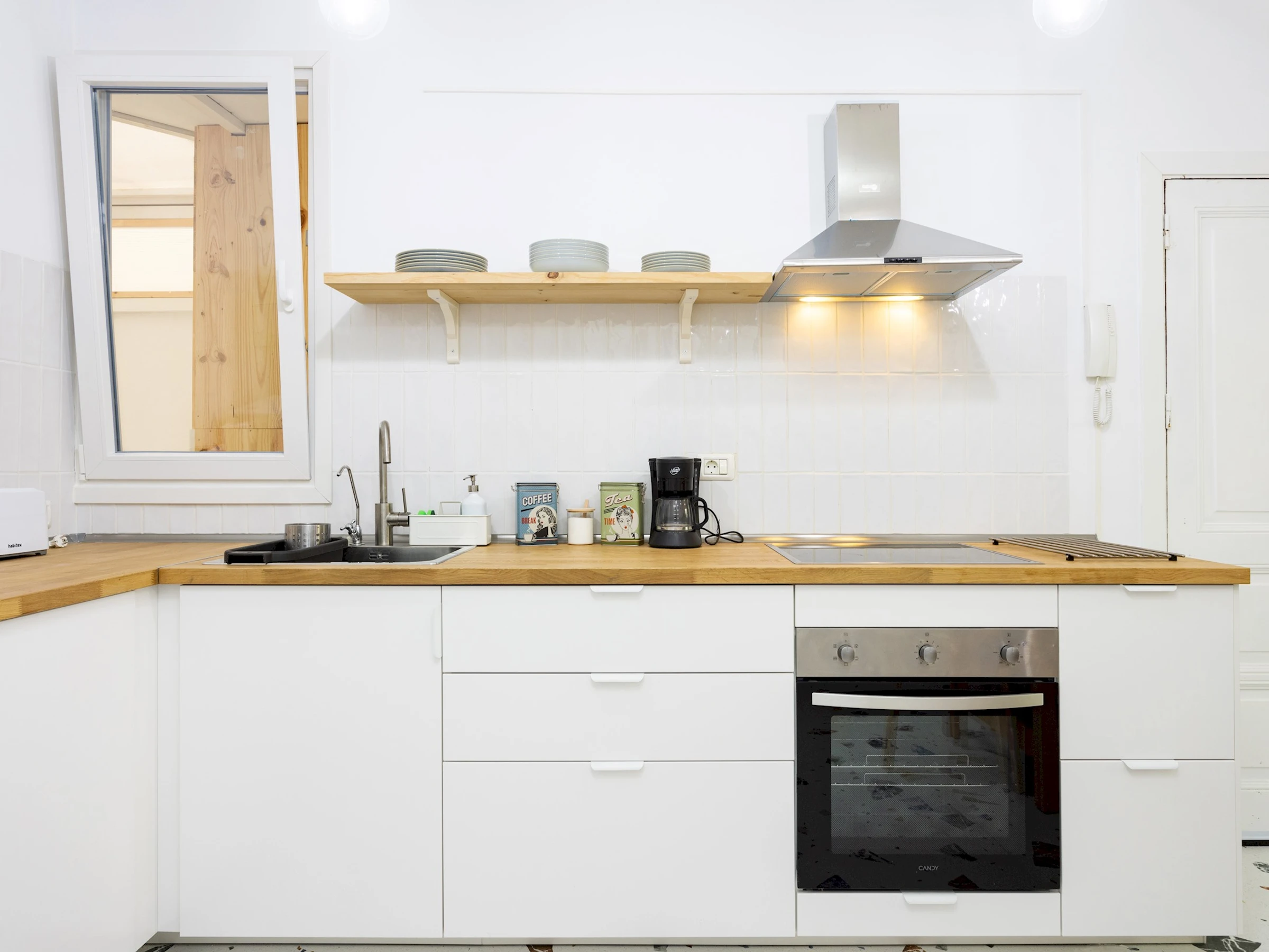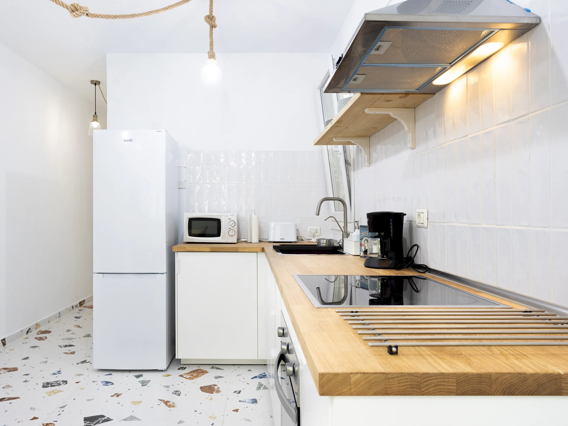 La cuisine, est équipée avec micro-ondes, four, ustensiles/cuisine, cafetière et grille pain.