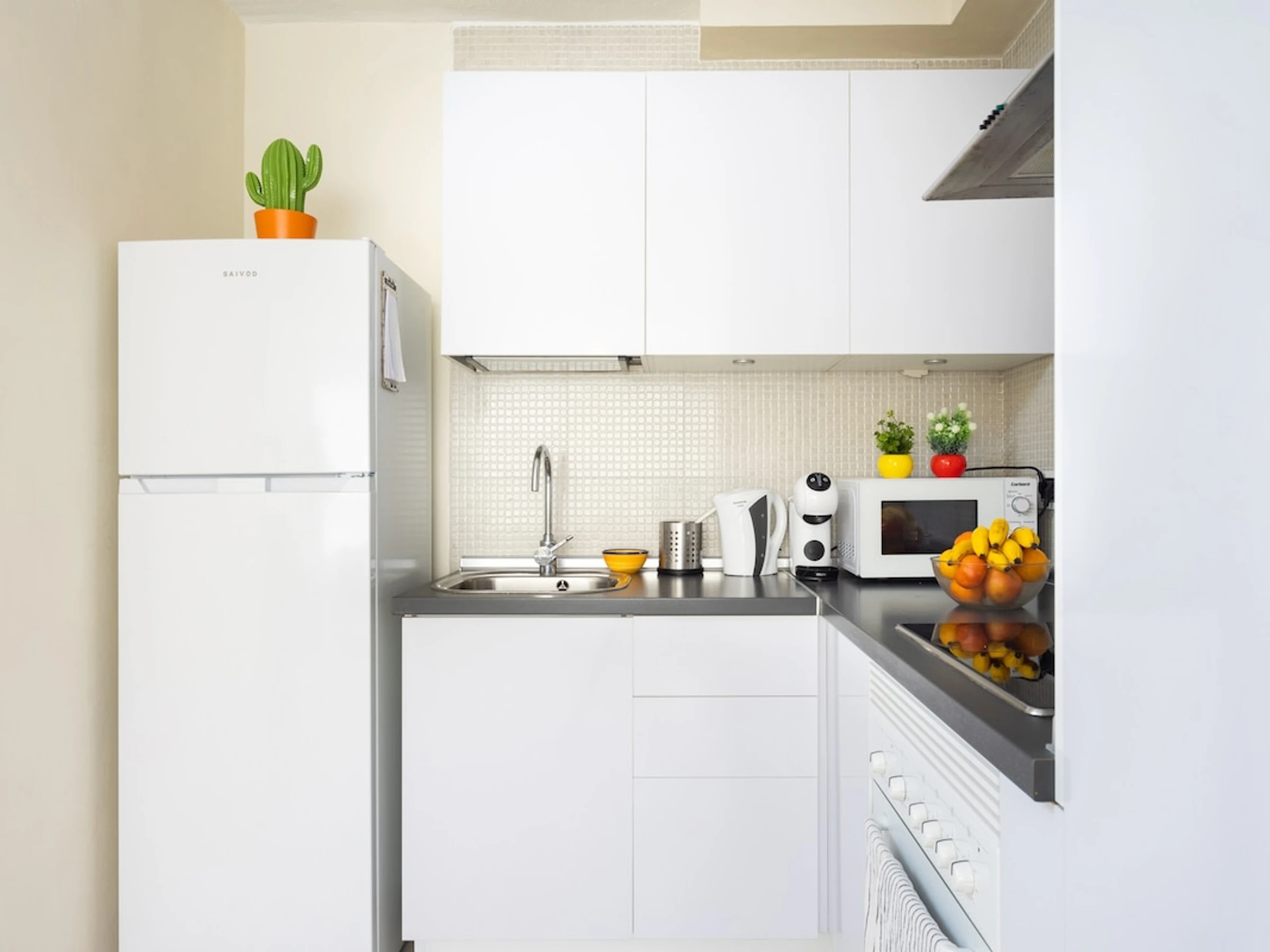 La cuisine, est équipée avec micro-ondes, four, ustensiles/cuisine et cafetière.