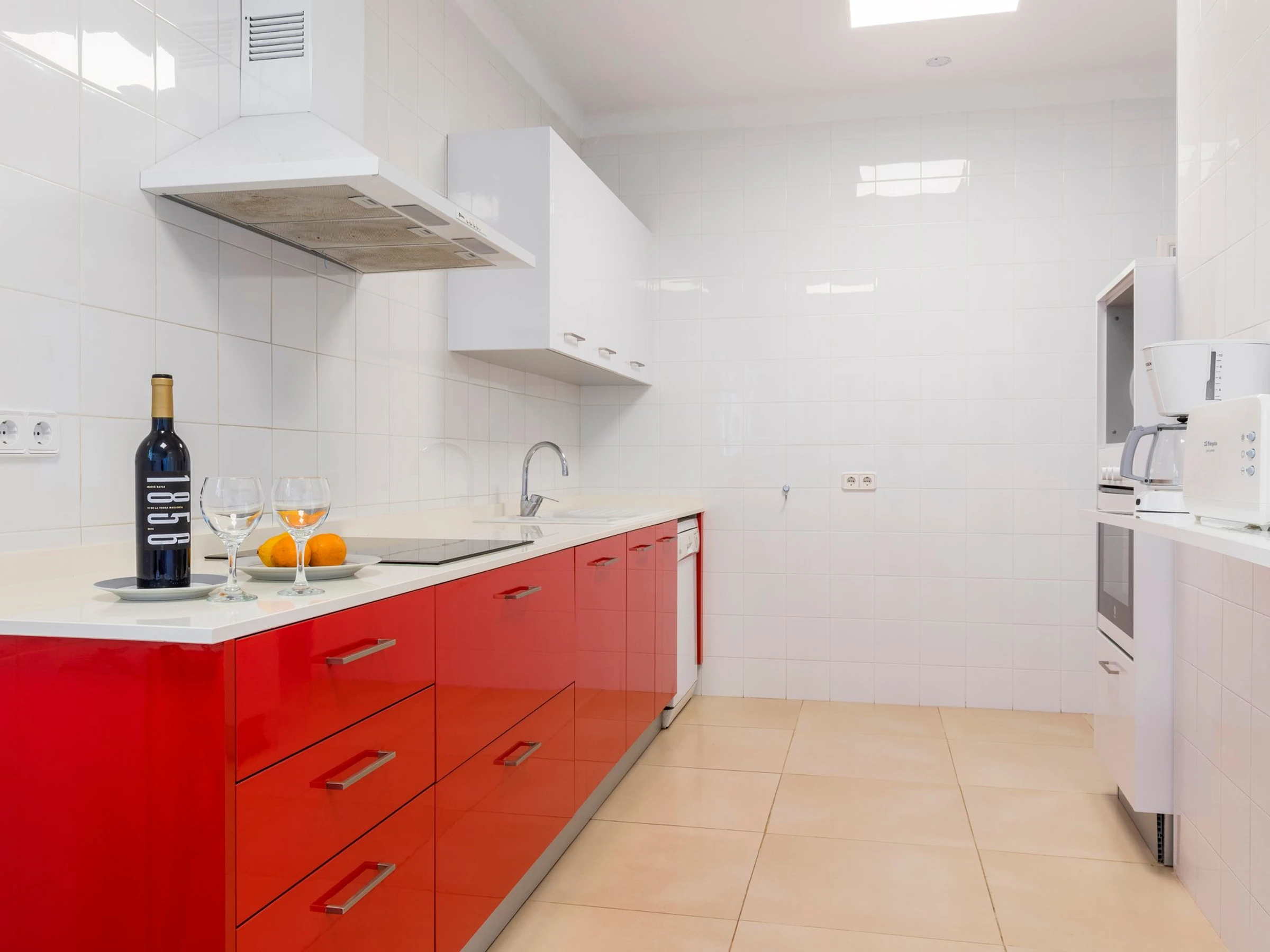 La cuisine, est équipée avec réfrigérateur, micro-ondes, four, lave-vaisselle, cafetière, grille pain et bouilloire.