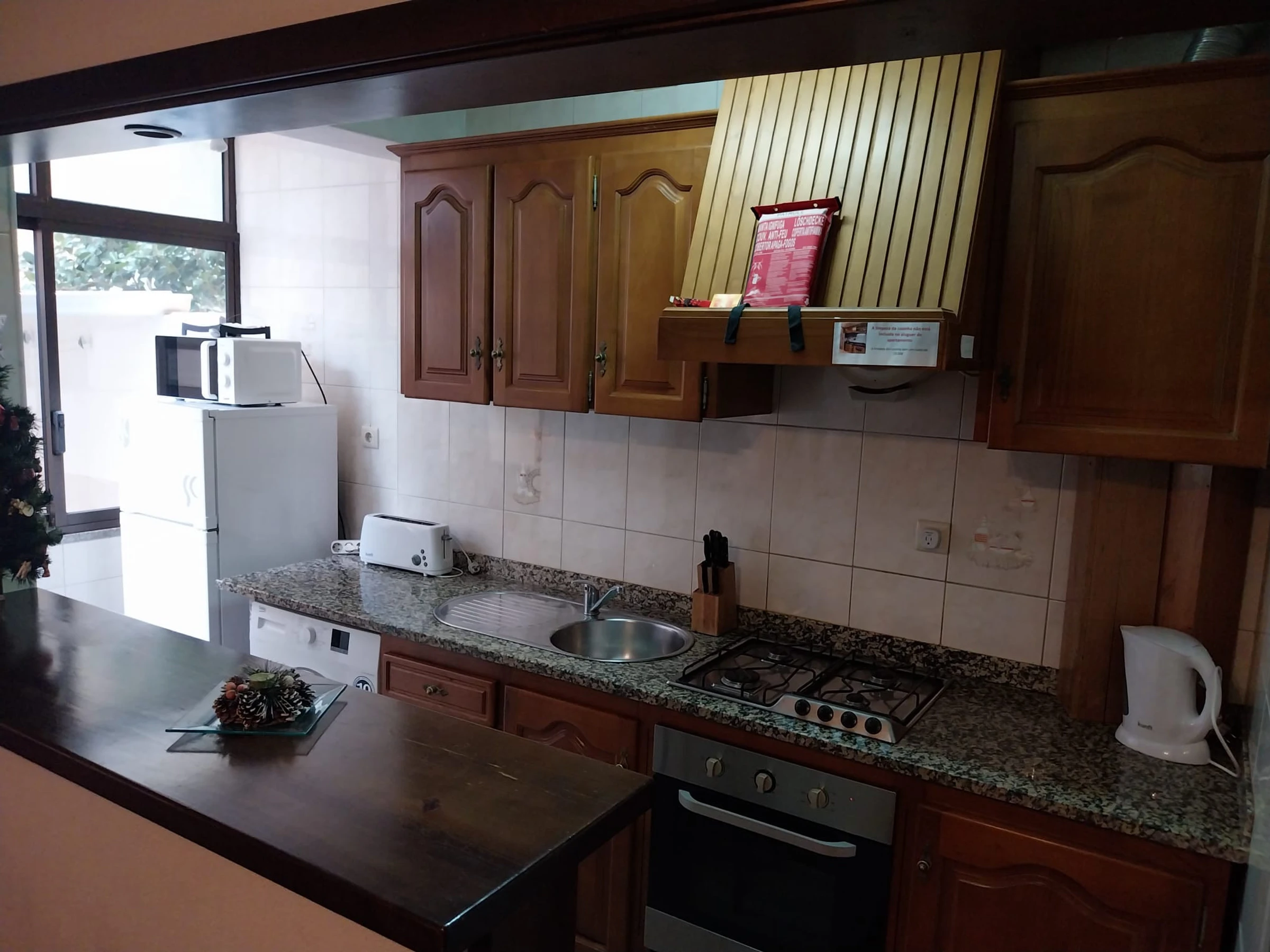 La cuisine américaine, à gaz, est équipée avec réfrigérateur, micro-ondes, four, congélateur, vaisselle/couverts, ustensiles/cuisine, grille pain et bouilloire.