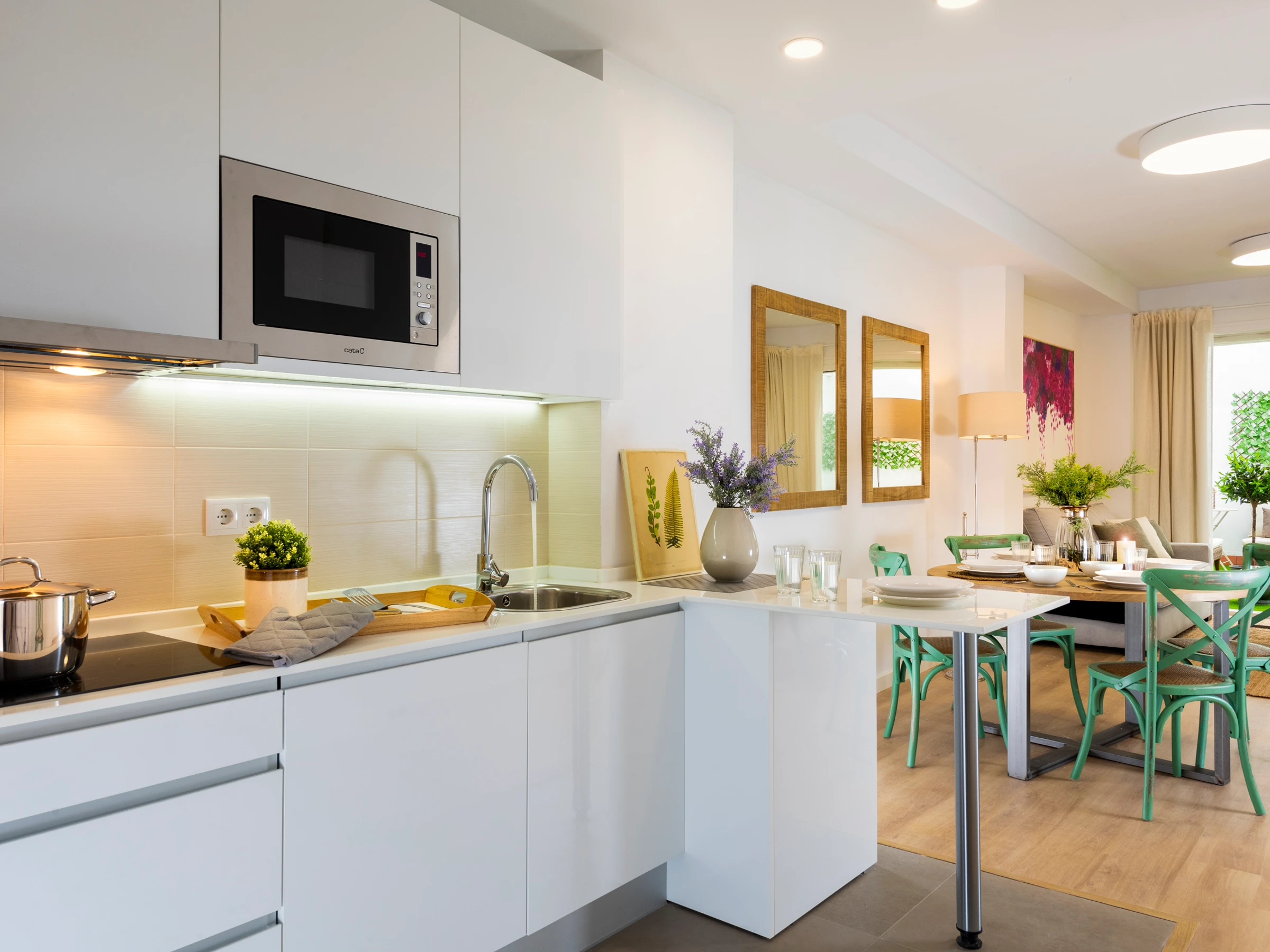 La cuisine, est équipée avec réfrigérateur, micro-ondes, lave-vaisselle, vaisselle/couverts, cafetière, grille pain et presse-agrumes.