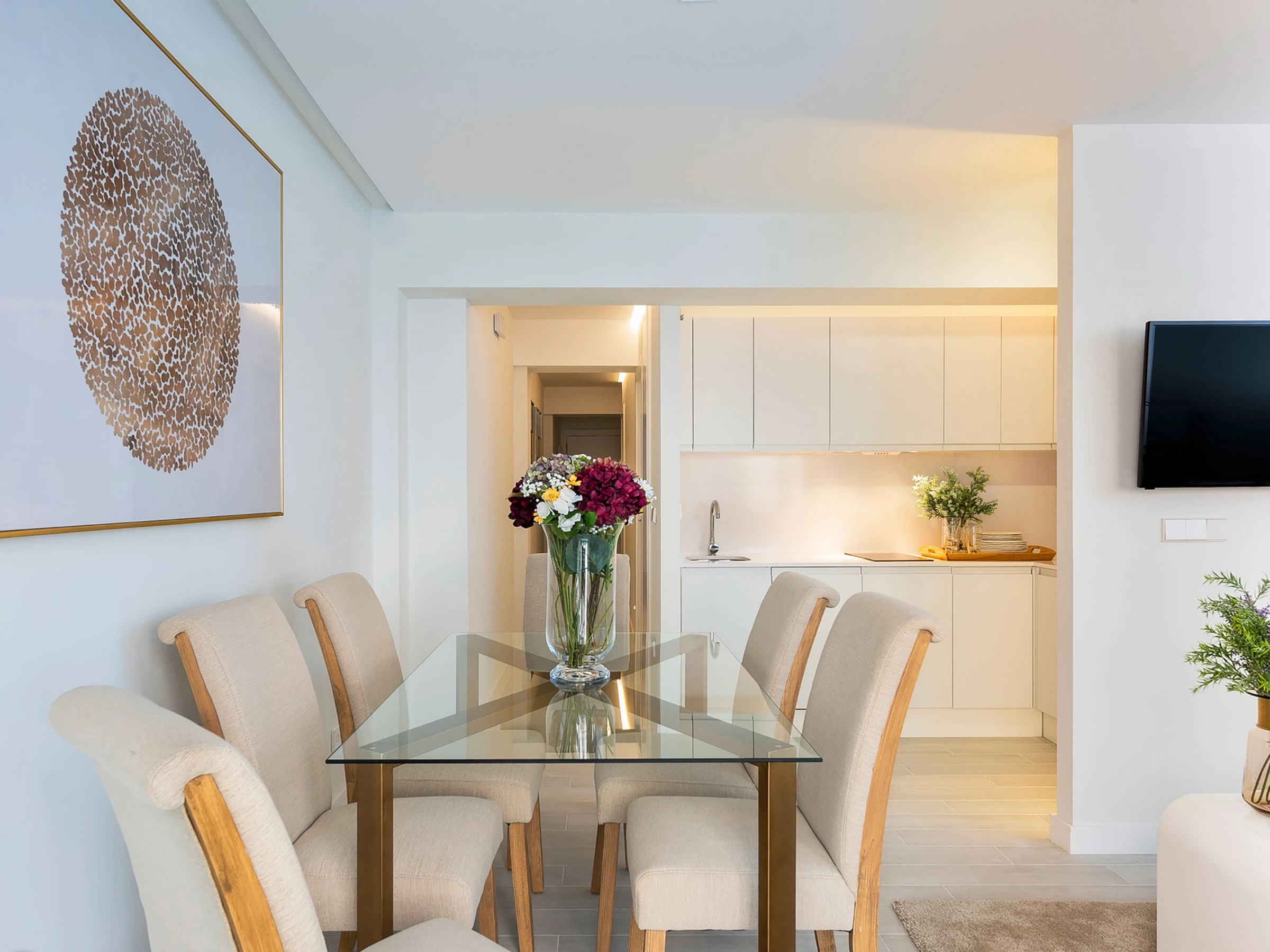 La cuisine, est équipée avec réfrigérateur, micro-ondes, lave-vaisselle, vaisselle/couverts et cafetière.