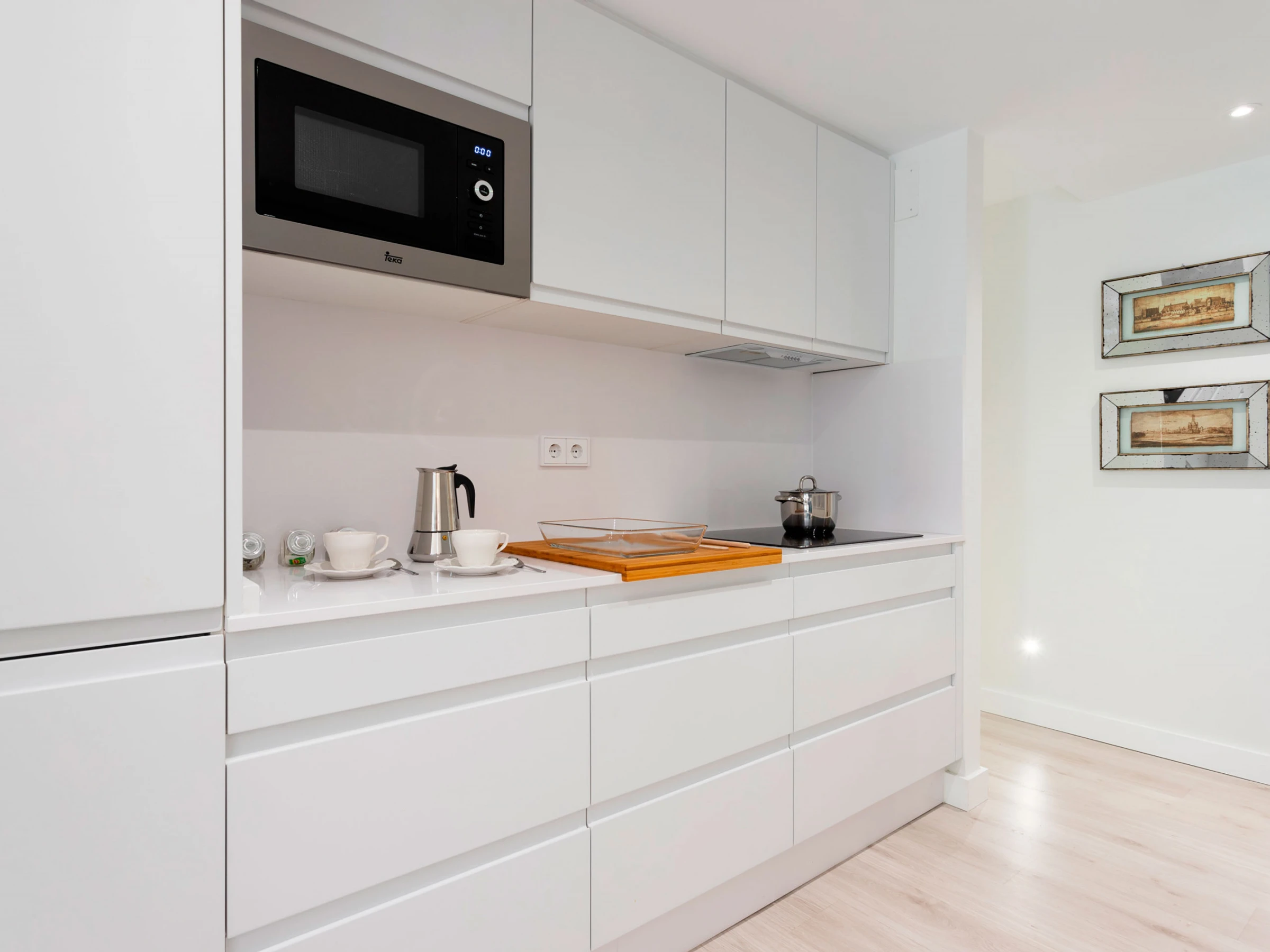 La cuisine, est équipée avec réfrigérateur, micro-ondes, congélateur, lave-vaisselle, vaisselle/couverts, cafetière et grille pain.