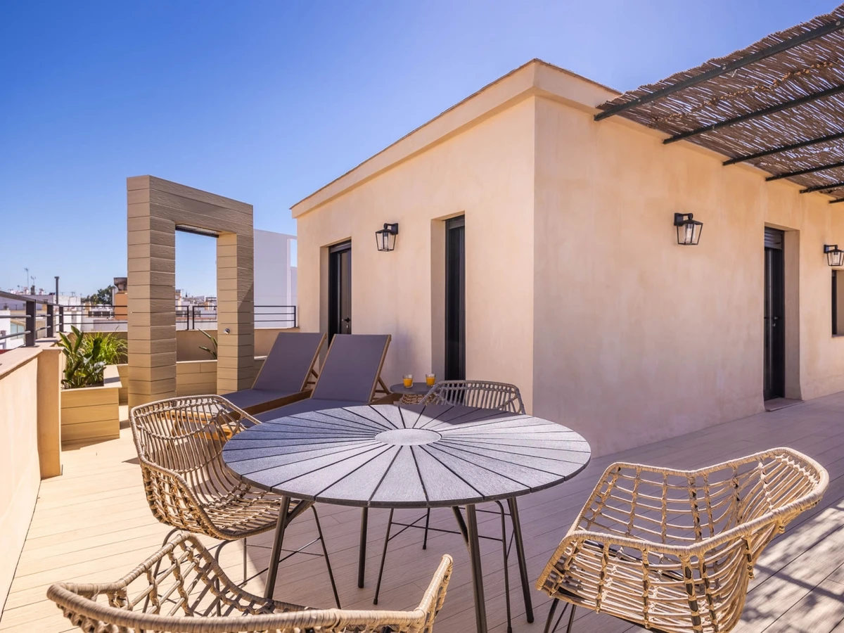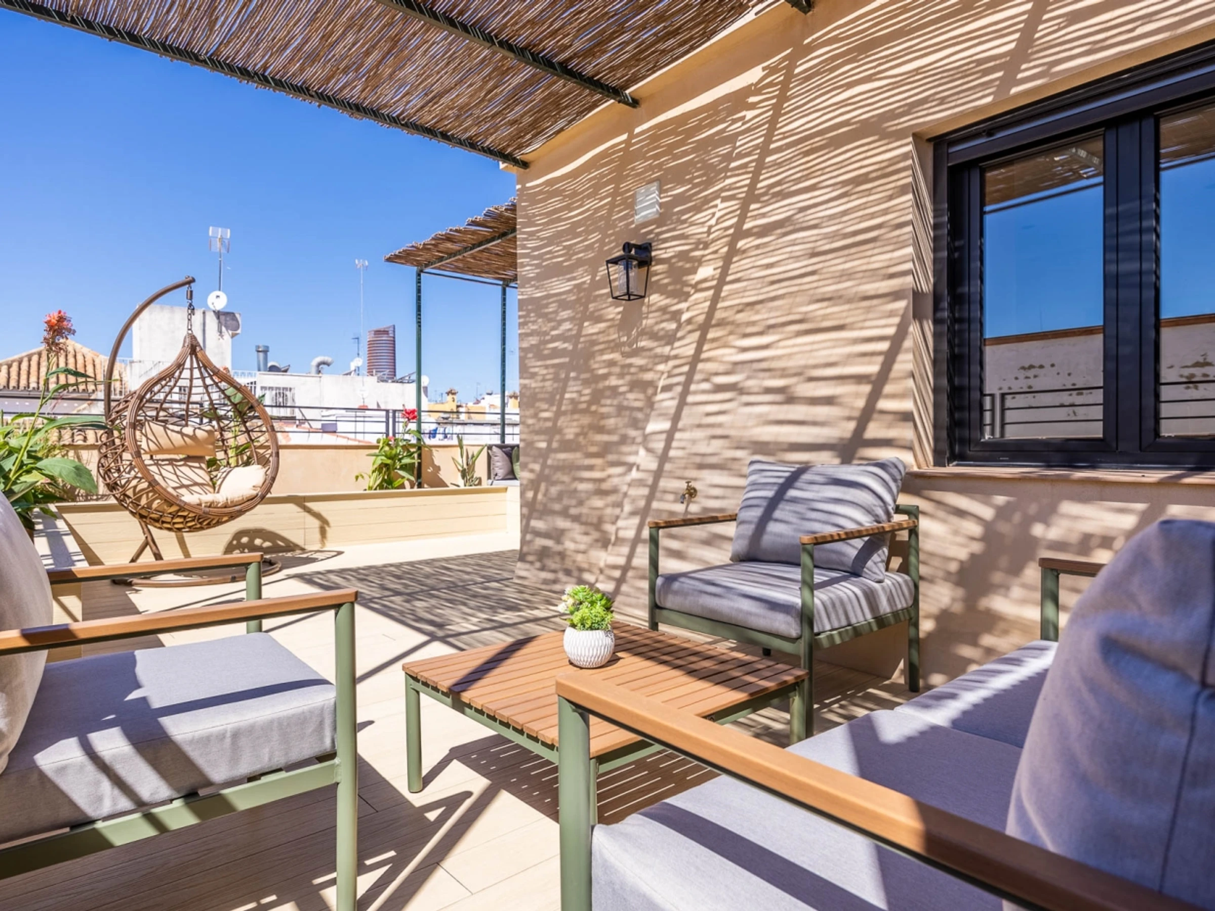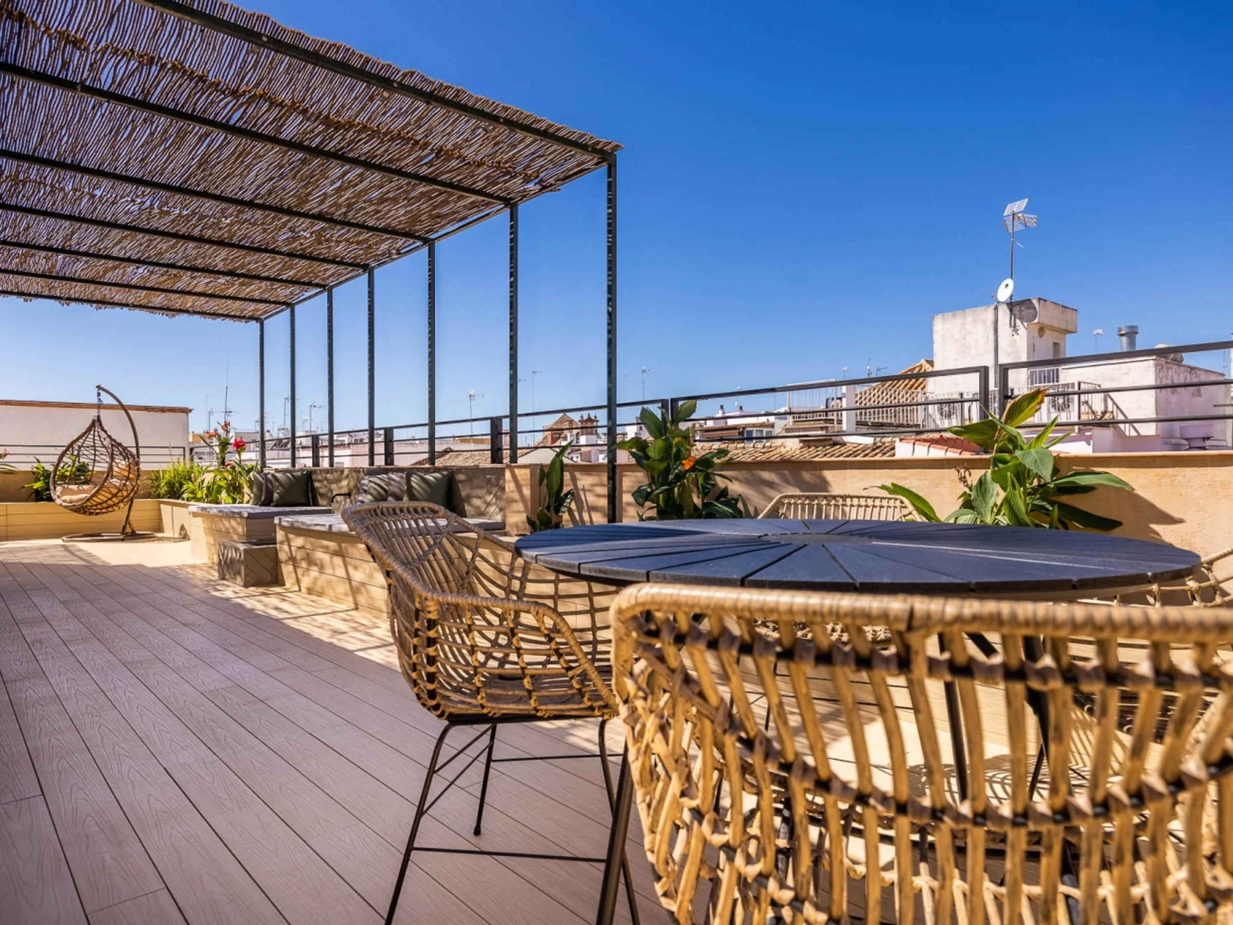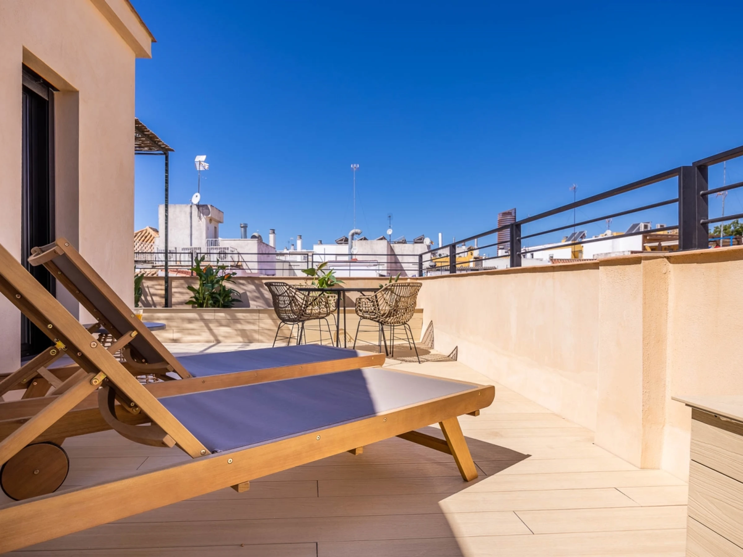 Penthouse de luxe avec terrasse panoramique de 60 m² dans l'un des plus beaux quartiers de Séville : le vieux Triana. Une expérience 100 % sévillane dans une rue calme et authentique, à 30 secondes du pont de Triana, avec vue sur la Giralda. L'appartement comprend un beau salon avec kitchenette entièrement équipée, une chambre avec un lit double de 135 cm et une magnifique tête de lit arabe en carreaux artisanaux du quartier de Triana, une immense salle de bain avec une douche de 2 mètres et, cerise sur le gâteau : une magnifique terrasse de 60 m² aux multiples espaces et ambiances. D'un côté, un coin détente avec canapés… de l'autre, un canapé « nid », une fontaine andalouse avec des coins lecture, un coin repas extérieur et une douche cascade avec vue sur la Giralda, ainsi que des hamacs pour profiter du soleil andalou. Services supplémentaires : carte d'oreillers, fer à lisser, nécessaire à couture, chauffage, presse-agrumes, grille-pain, couteaux, fer et planche à repasser. Possibilité de couchage pour un enfant de 2 à 12 ans sur un canapé-lit d'appoint. Parking couvert à 45 secondes de l'appartement pour 16 € par jour. Wi-Fi fibre optique d'excellente qualité. Netflix gratuit. - Les fêtes et événements sont interdits.