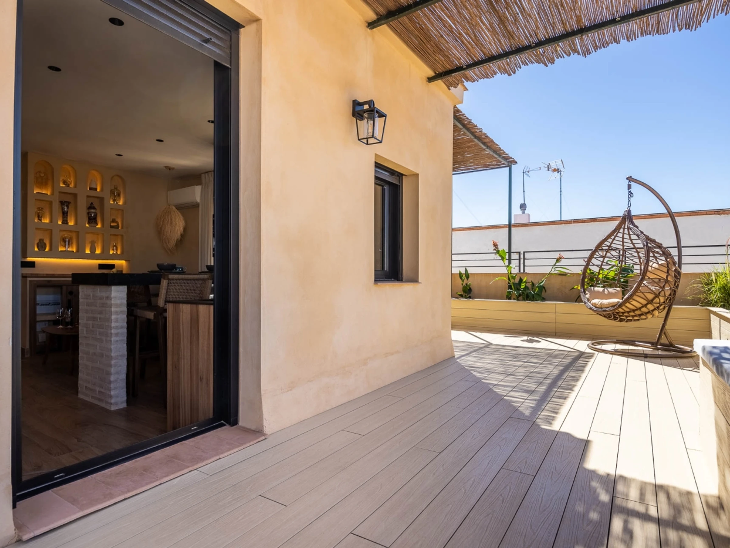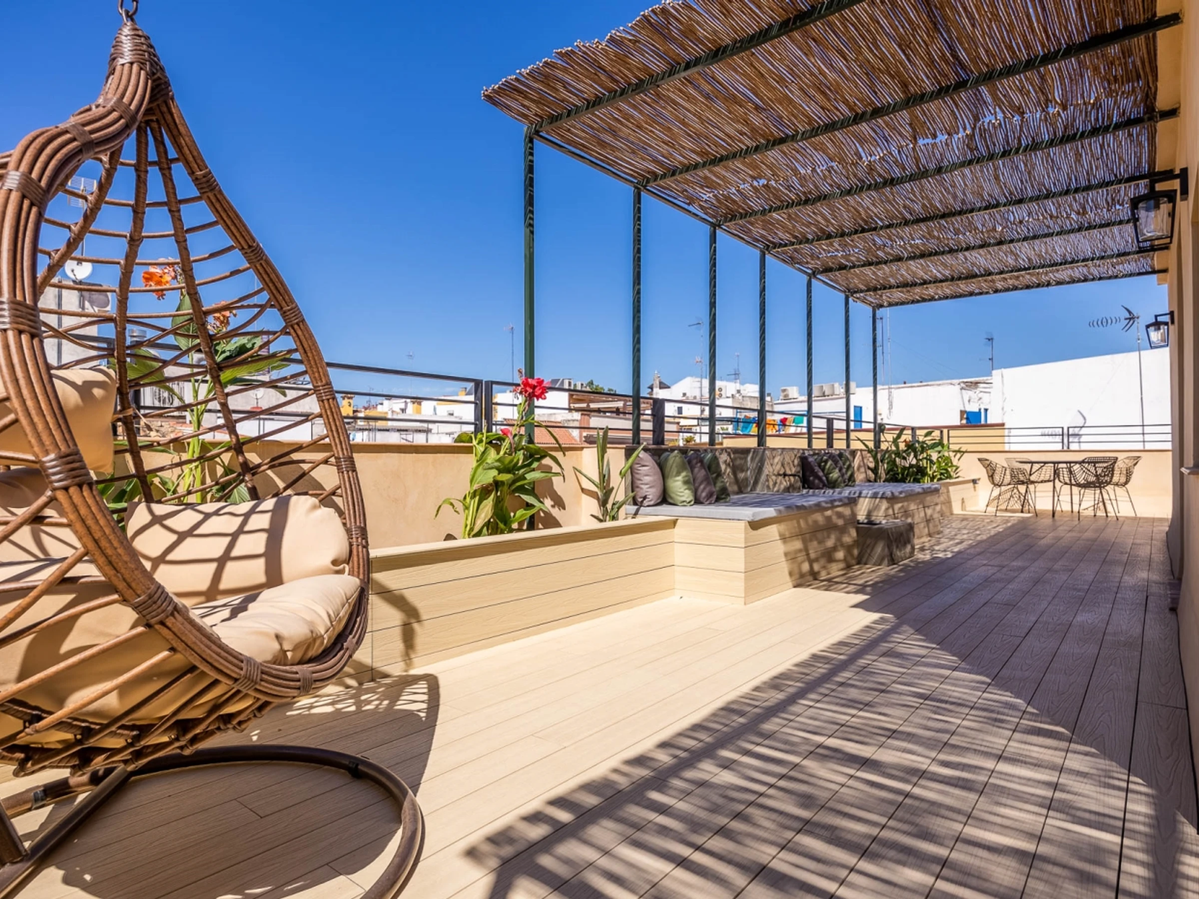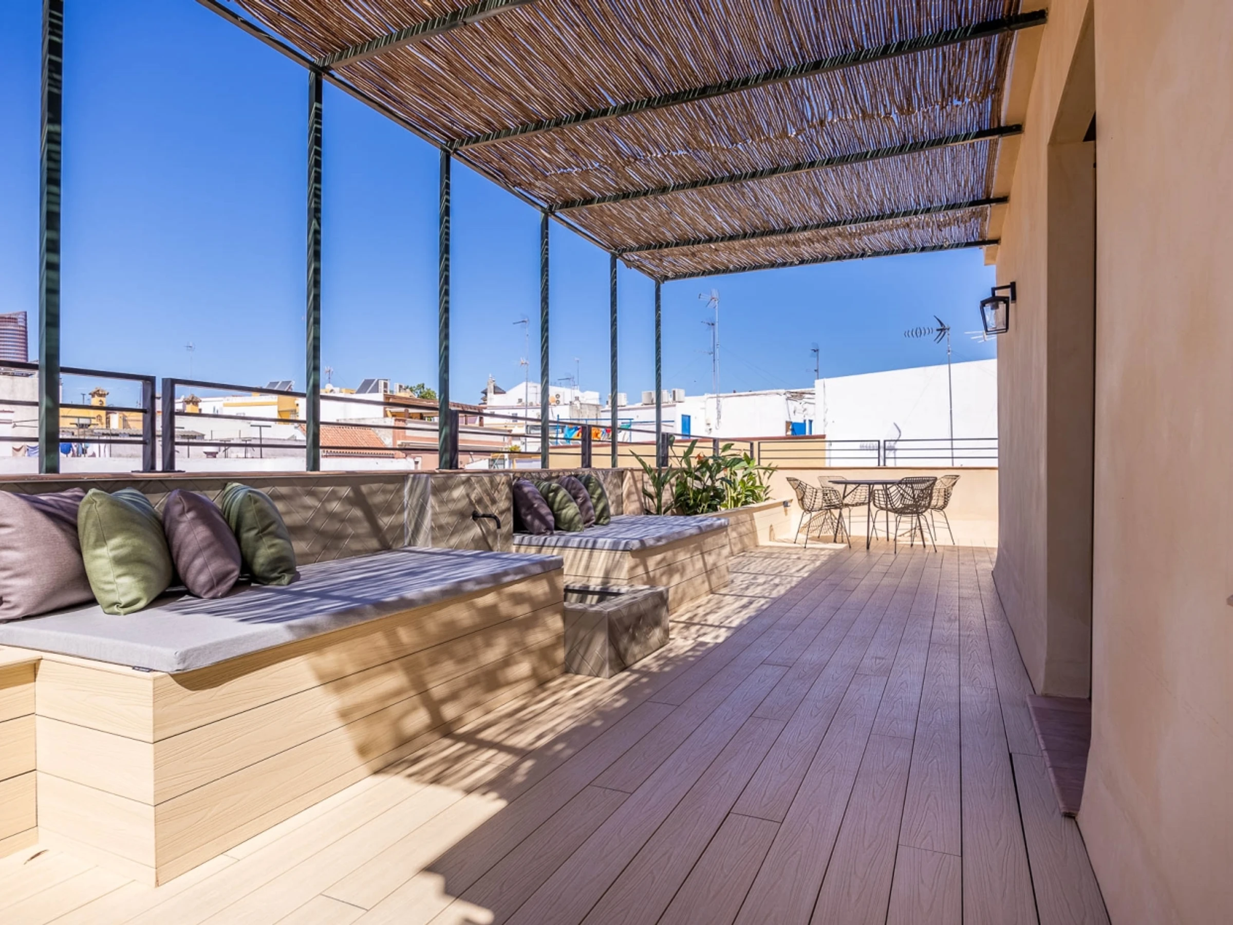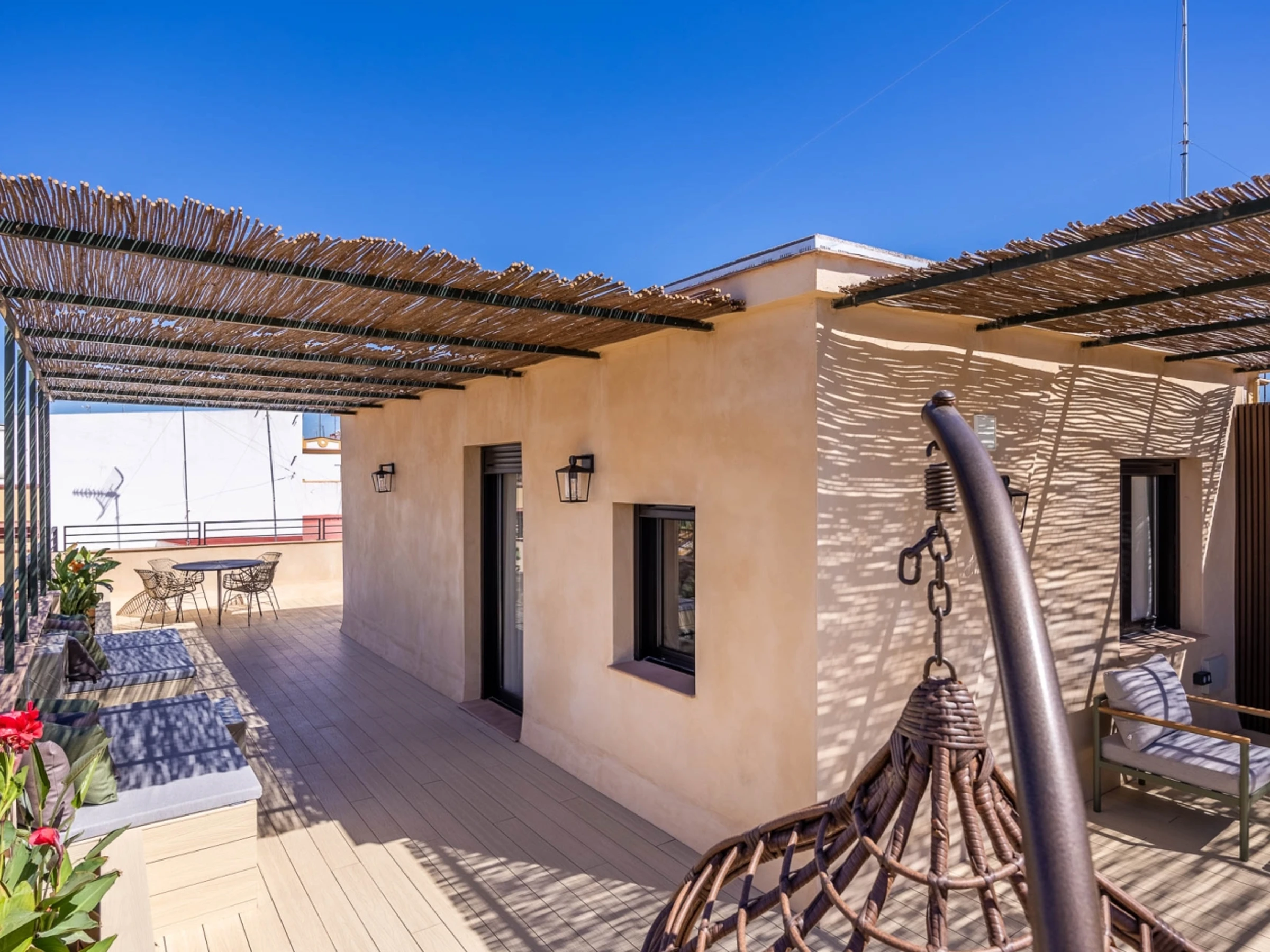 Penthouse de luxe avec terrasse panoramique de 60 m² dans l'un des plus beaux quartiers de Séville : le vieux Triana. Une expérience 100 % sévillane dans une rue calme et authentique, à 30 secondes du pont de Triana, avec vue sur la Giralda. L'appartement comprend un beau salon avec kitchenette entièrement équipée, une chambre avec un lit double de 135 cm et une magnifique tête de lit arabe en carreaux artisanaux du quartier de Triana, une immense salle de bain avec une douche de 2 mètres et, cerise sur le gâteau : une magnifique terrasse de 60 m² aux multiples espaces et ambiances. D'un côté, un coin détente avec canapés… de l'autre, un canapé « nid », une fontaine andalouse avec des coins lecture, un coin repas extérieur et une douche cascade avec vue sur la Giralda, ainsi que des hamacs pour profiter du soleil andalou. Services supplémentaires : carte d'oreillers, fer à lisser, nécessaire à couture, chauffage, presse-agrumes, grille-pain, couteaux, fer et planche à repasser. Possibilité de couchage pour un enfant de 2 à 12 ans sur un canapé-lit d'appoint. Parking couvert à 45 secondes de l'appartement pour 16 € par jour. Wi-Fi fibre optique d'excellente qualité. Netflix gratuit. - Les fêtes et événements sont interdits.