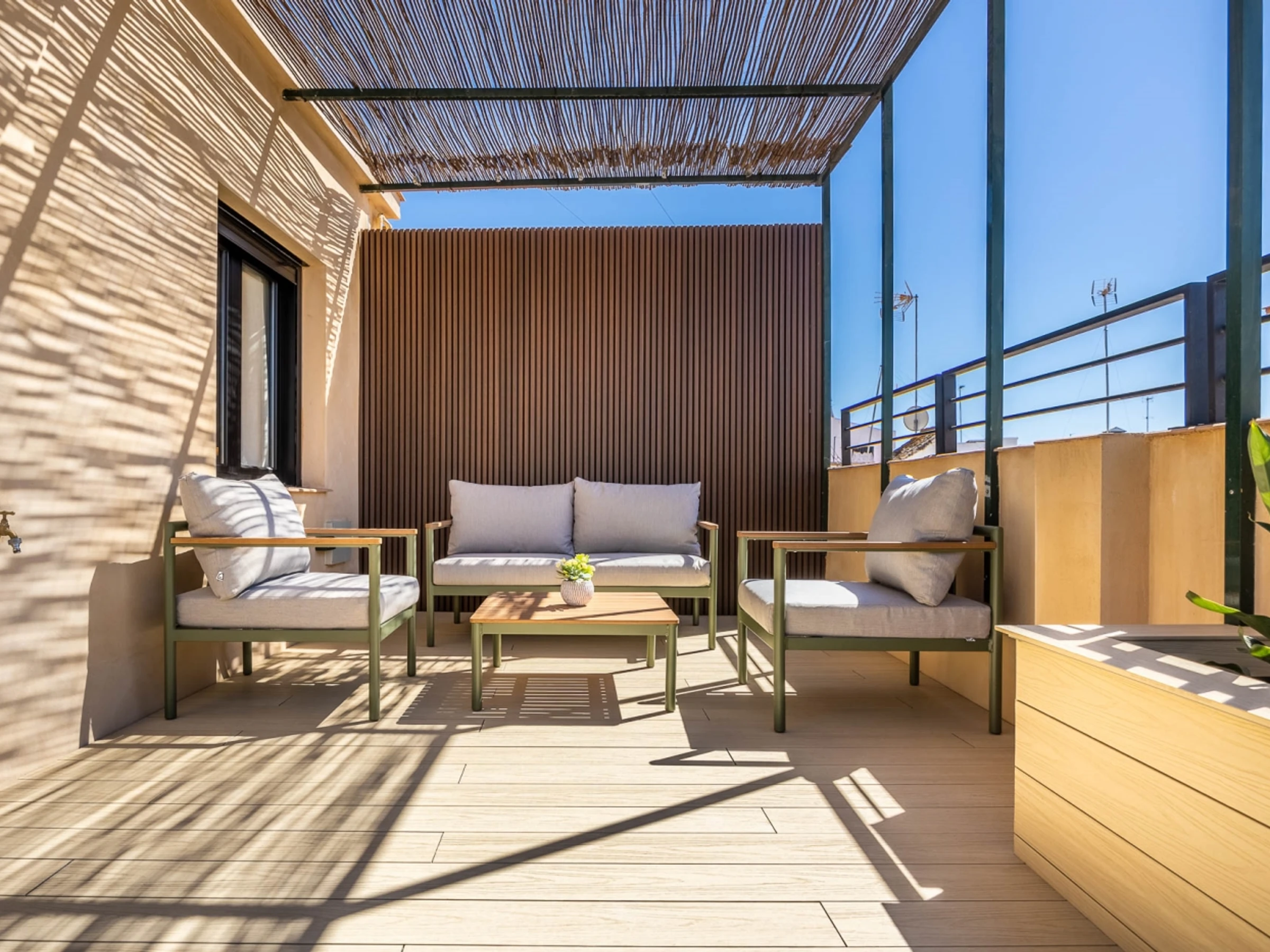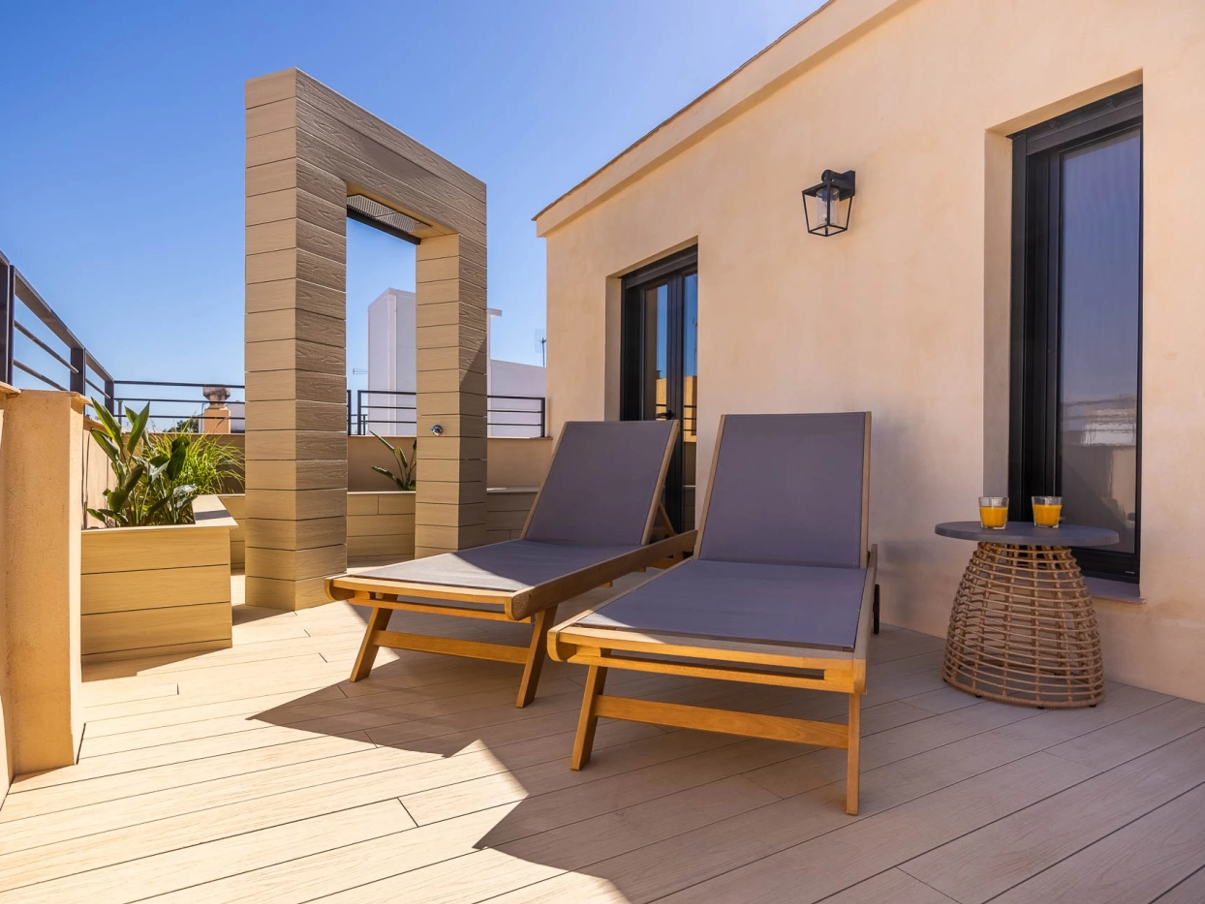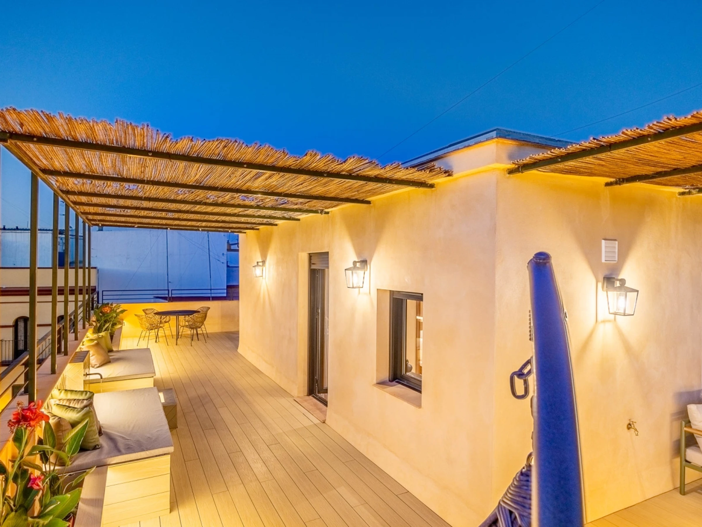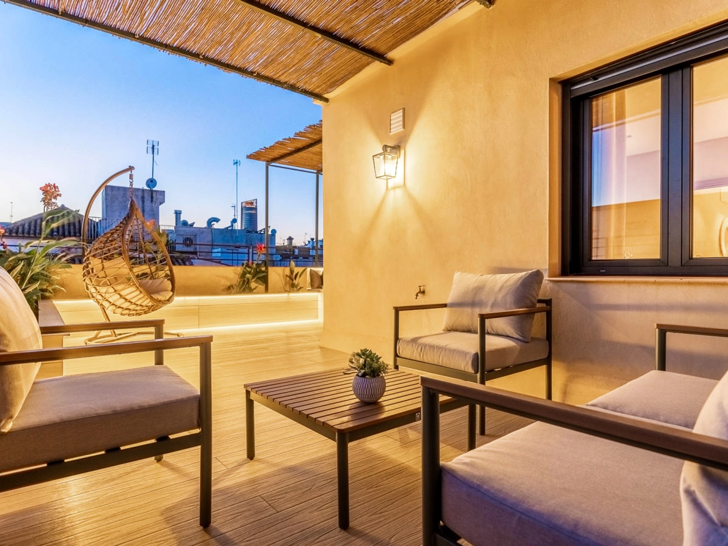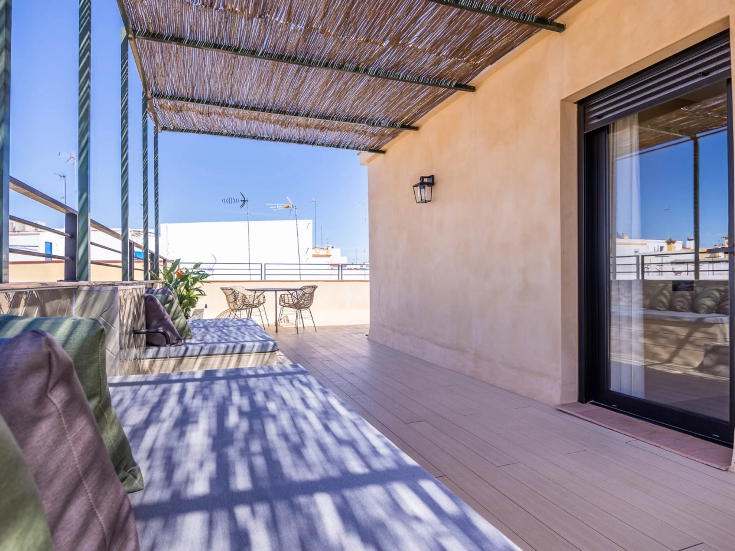 Penthouse de luxe avec terrasse panoramique de 60 m² dans l'un des plus beaux quartiers de Séville : le vieux Triana. Une expérience 100 % sévillane dans une rue calme et authentique, à 30 secondes du pont de Triana, avec vue sur la Giralda. L'appartement comprend un beau salon avec kitchenette entièrement équipée, une chambre avec un lit double de 135 cm et une magnifique tête de lit arabe en carreaux artisanaux du quartier de Triana, une immense salle de bain avec une douche de 2 mètres et, cerise sur le gâteau : une magnifique terrasse de 60 m² aux multiples espaces et ambiances. D'un côté, un coin détente avec canapés… de l'autre, un canapé « nid », une fontaine andalouse avec des coins lecture, un coin repas extérieur et une douche cascade avec vue sur la Giralda, ainsi que des hamacs pour profiter du soleil andalou. Services supplémentaires : carte d'oreillers, fer à lisser, nécessaire à couture, chauffage, presse-agrumes, grille-pain, couteaux, fer et planche à repasser. Possibilité de couchage pour un enfant de 2 à 12 ans sur un canapé-lit d'appoint. Parking couvert à 45 secondes de l'appartement pour 16 € par jour. Wi-Fi fibre optique d'excellente qualité. Netflix gratuit. - Les fêtes et événements sont interdits.