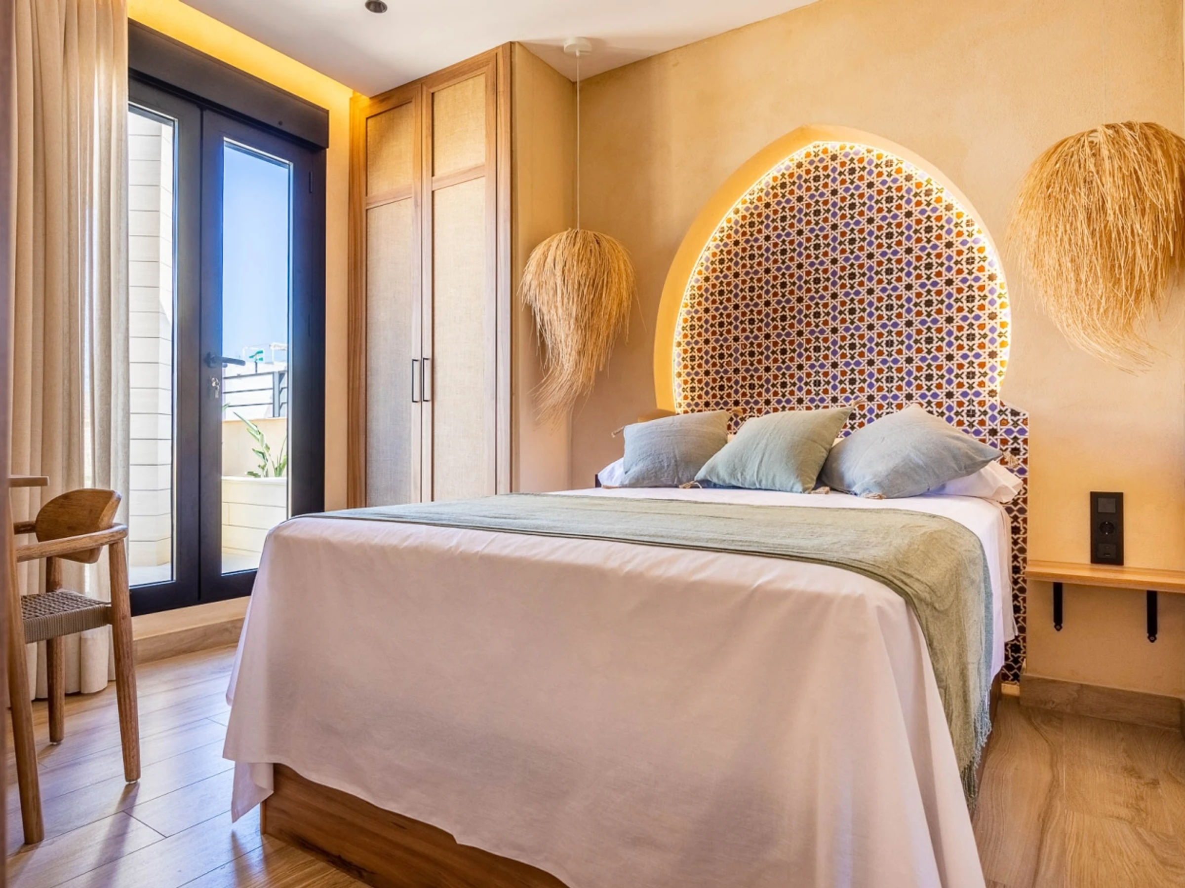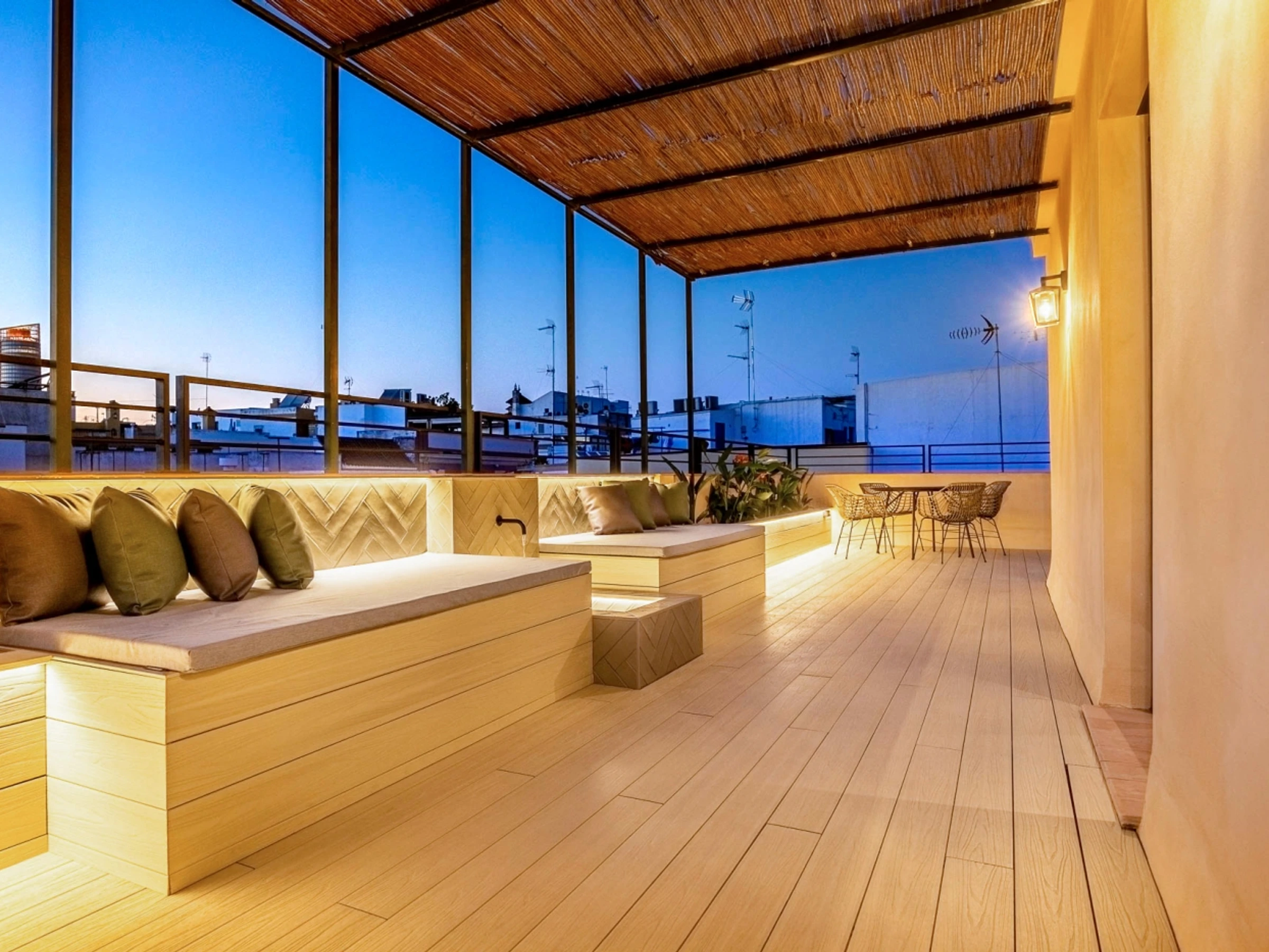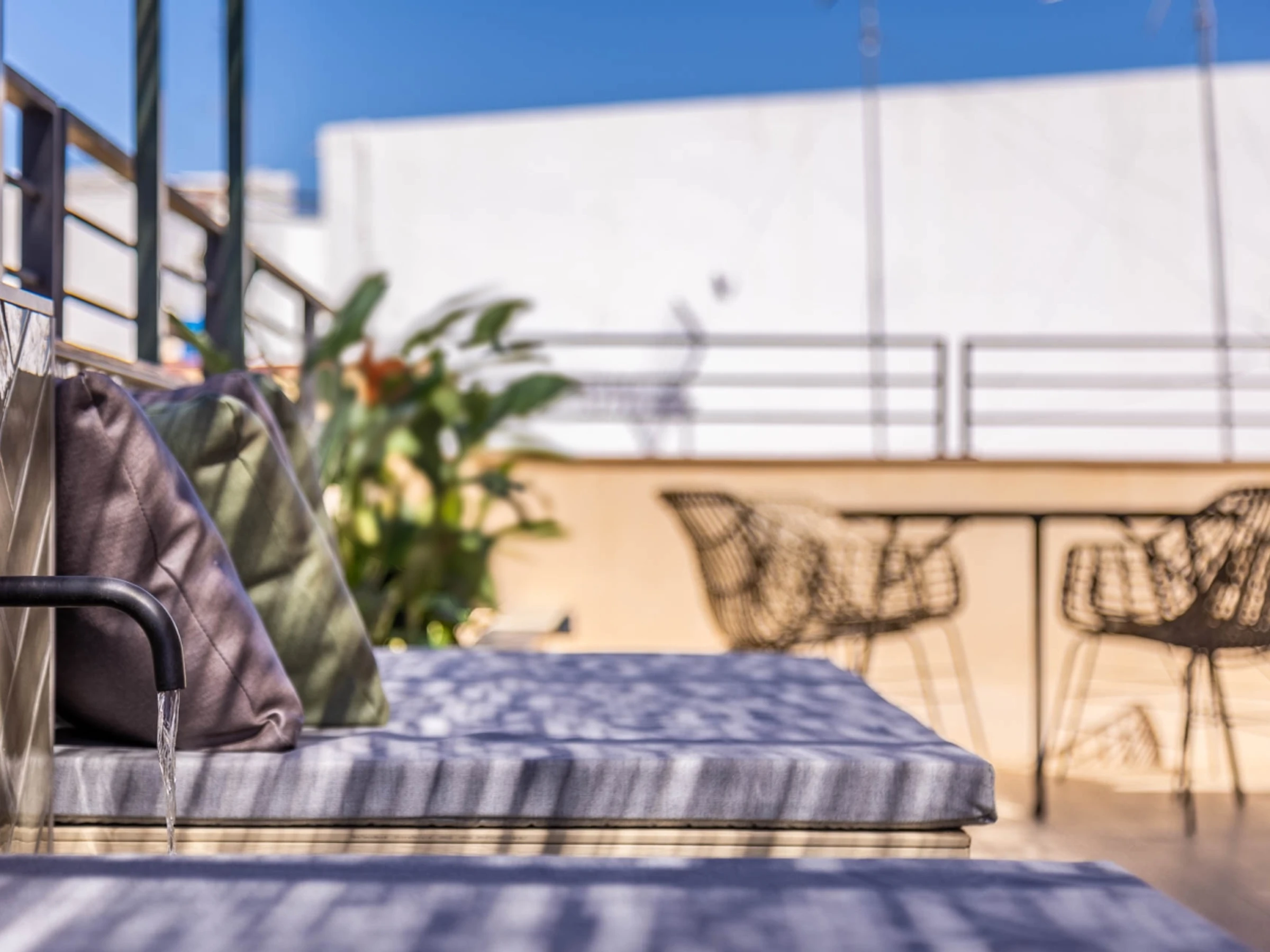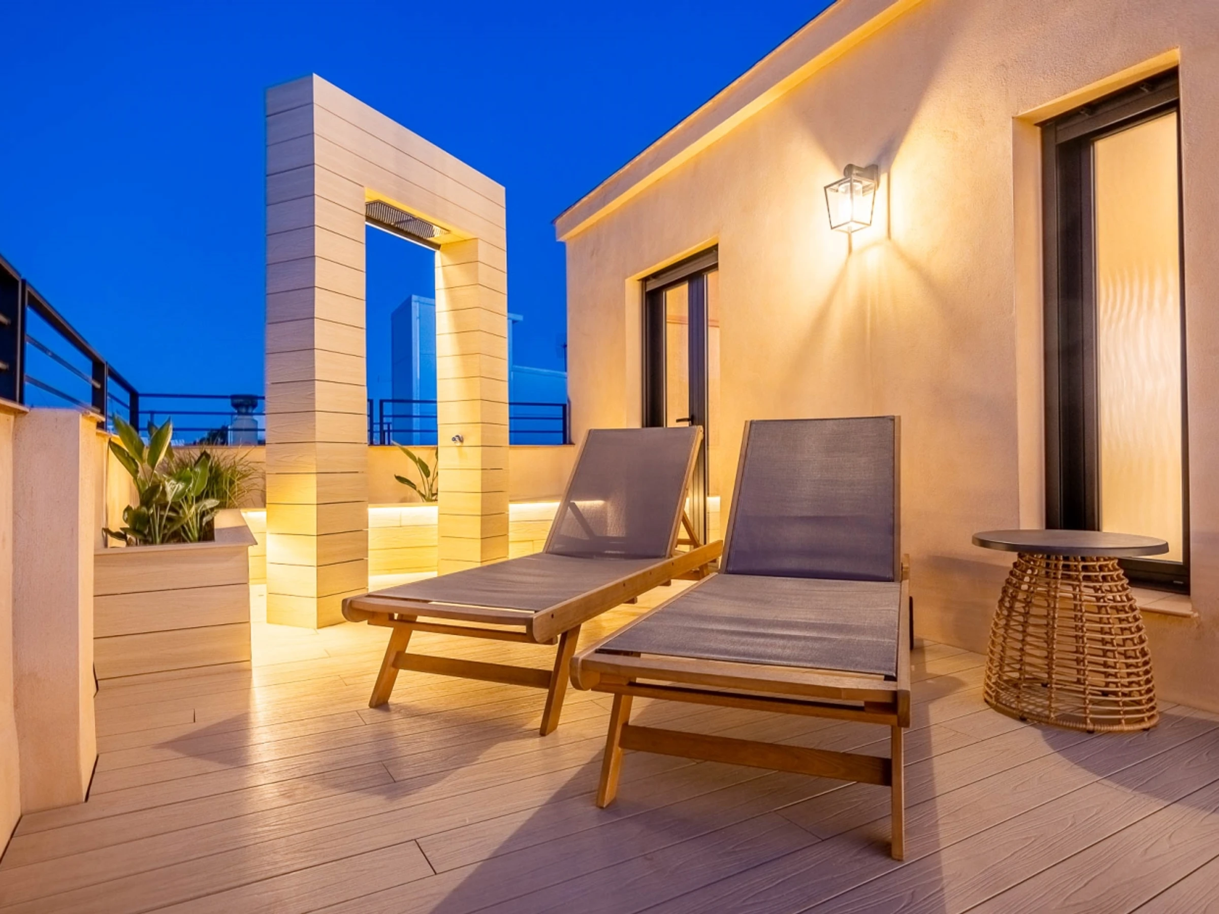 Penthouse de luxe avec terrasse panoramique de 60 m² dans l'un des plus beaux quartiers de Séville : le vieux Triana. Une expérience 100 % sévillane dans une rue calme et authentique, à 30 secondes du pont de Triana, avec vue sur la Giralda. L'appartement comprend un beau salon avec kitchenette entièrement équipée, une chambre avec un lit double de 135 cm et une magnifique tête de lit arabe en carreaux artisanaux du quartier de Triana, une immense salle de bain avec une douche de 2 mètres et, cerise sur le gâteau : une magnifique terrasse de 60 m² aux multiples espaces et ambiances. D'un côté, un coin détente avec canapés… de l'autre, un canapé « nid », une fontaine andalouse avec des coins lecture, un coin repas extérieur et une douche cascade avec vue sur la Giralda, ainsi que des hamacs pour profiter du soleil andalou. Services supplémentaires : carte d'oreillers, fer à lisser, nécessaire à couture, chauffage, presse-agrumes, grille-pain, couteaux, fer et planche à repasser. Possibilité de couchage pour un enfant de 2 à 12 ans sur un canapé-lit d'appoint. Parking couvert à 45 secondes de l'appartement pour 16 € par jour. Wi-Fi fibre optique d'excellente qualité. Netflix gratuit. - Les fêtes et événements sont interdits.