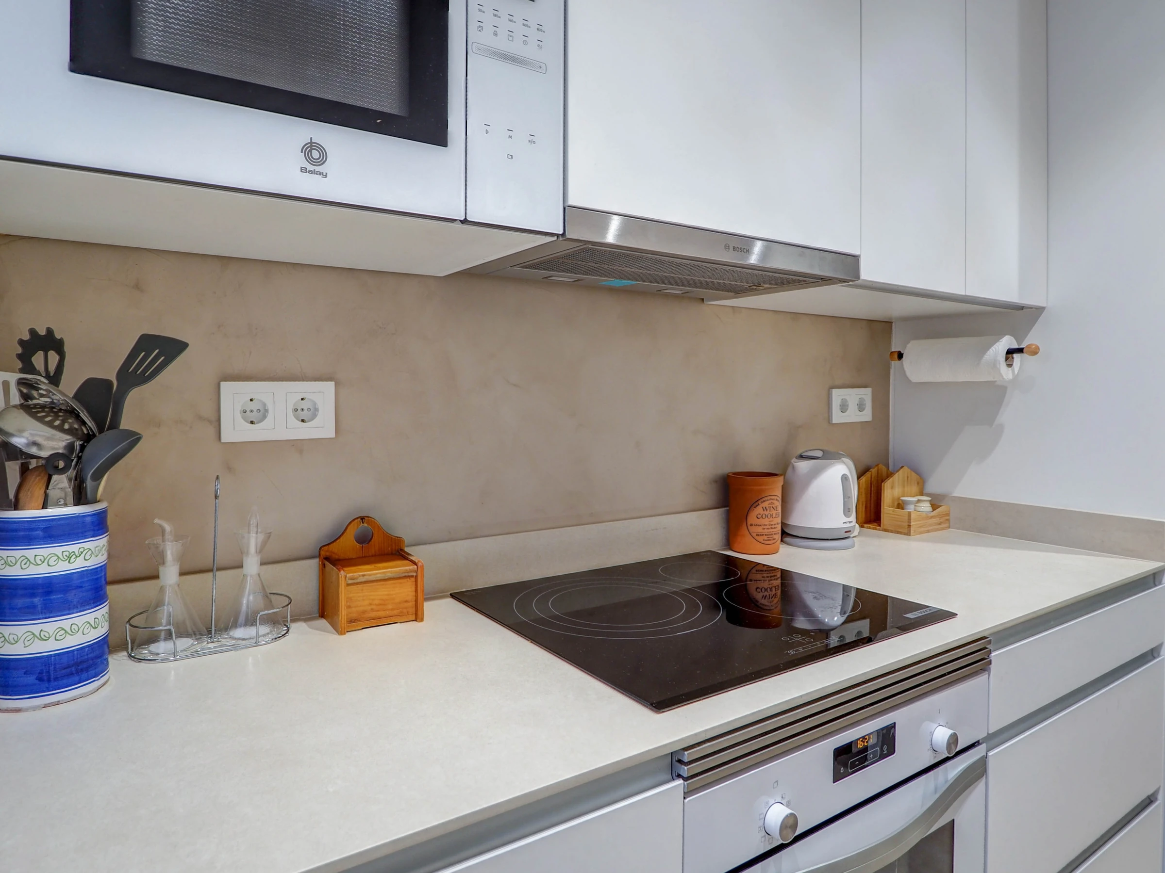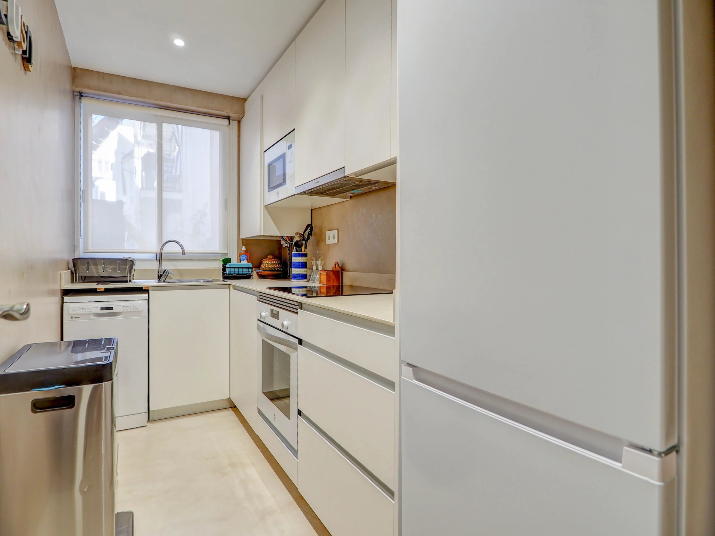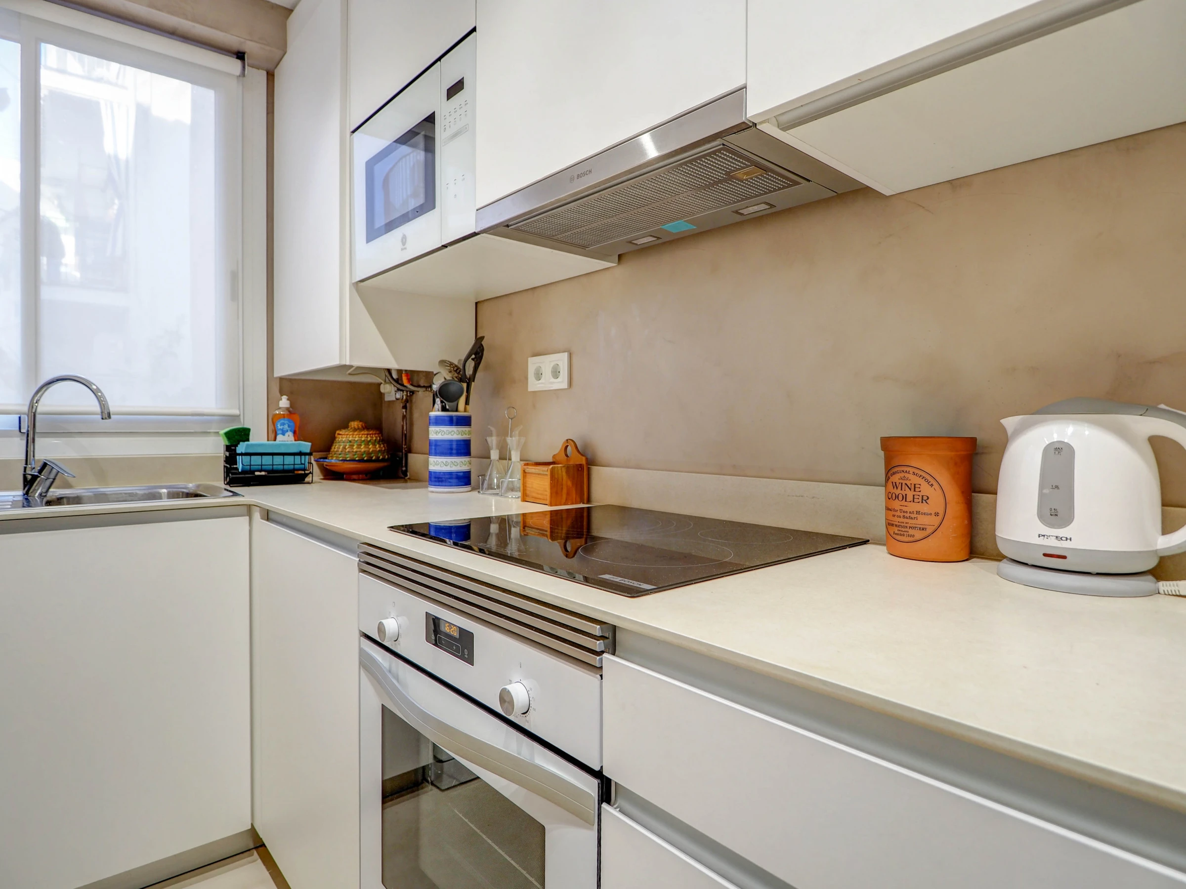 La cuisine, est équipée avec réfrigérateur, micro-ondes, four, congélateur, lave-vaisselle, vaisselle/couverts, cafetière, grille pain et bouilloire.