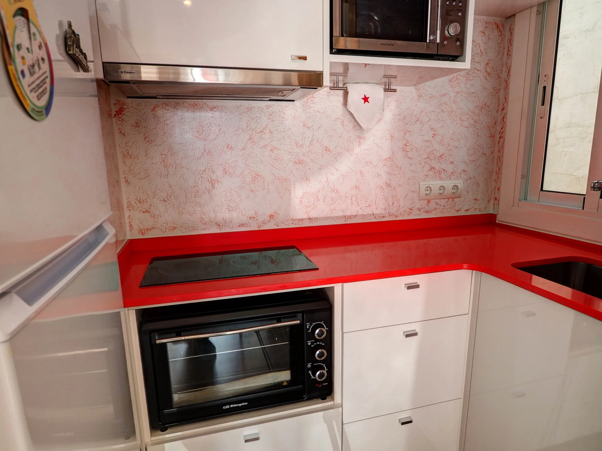La cuisine, est équipée avec réfrigérateur, micro-ondes, four, congélateur, vaisselle/couverts, cafetière, grille pain et bouilloire.