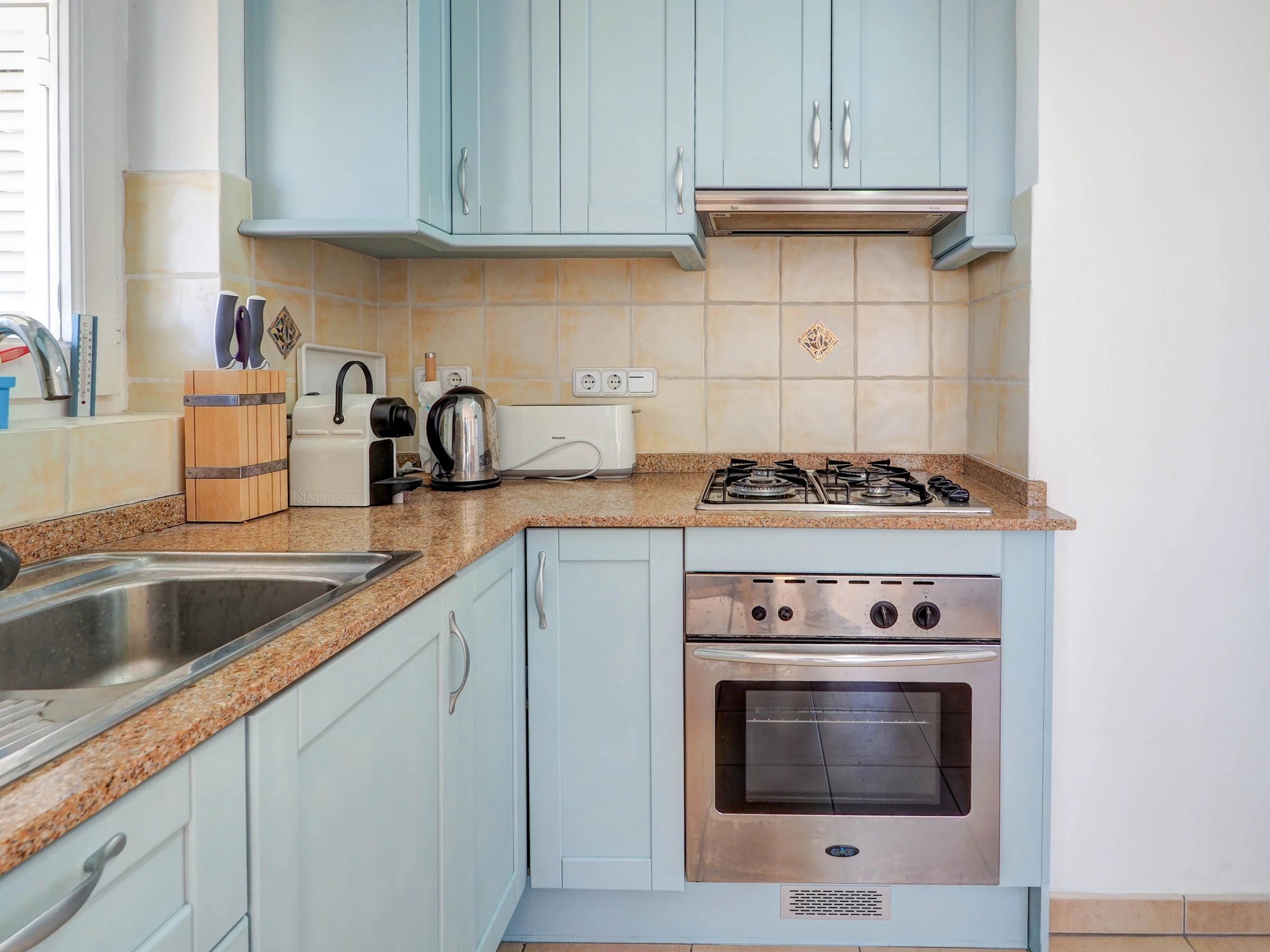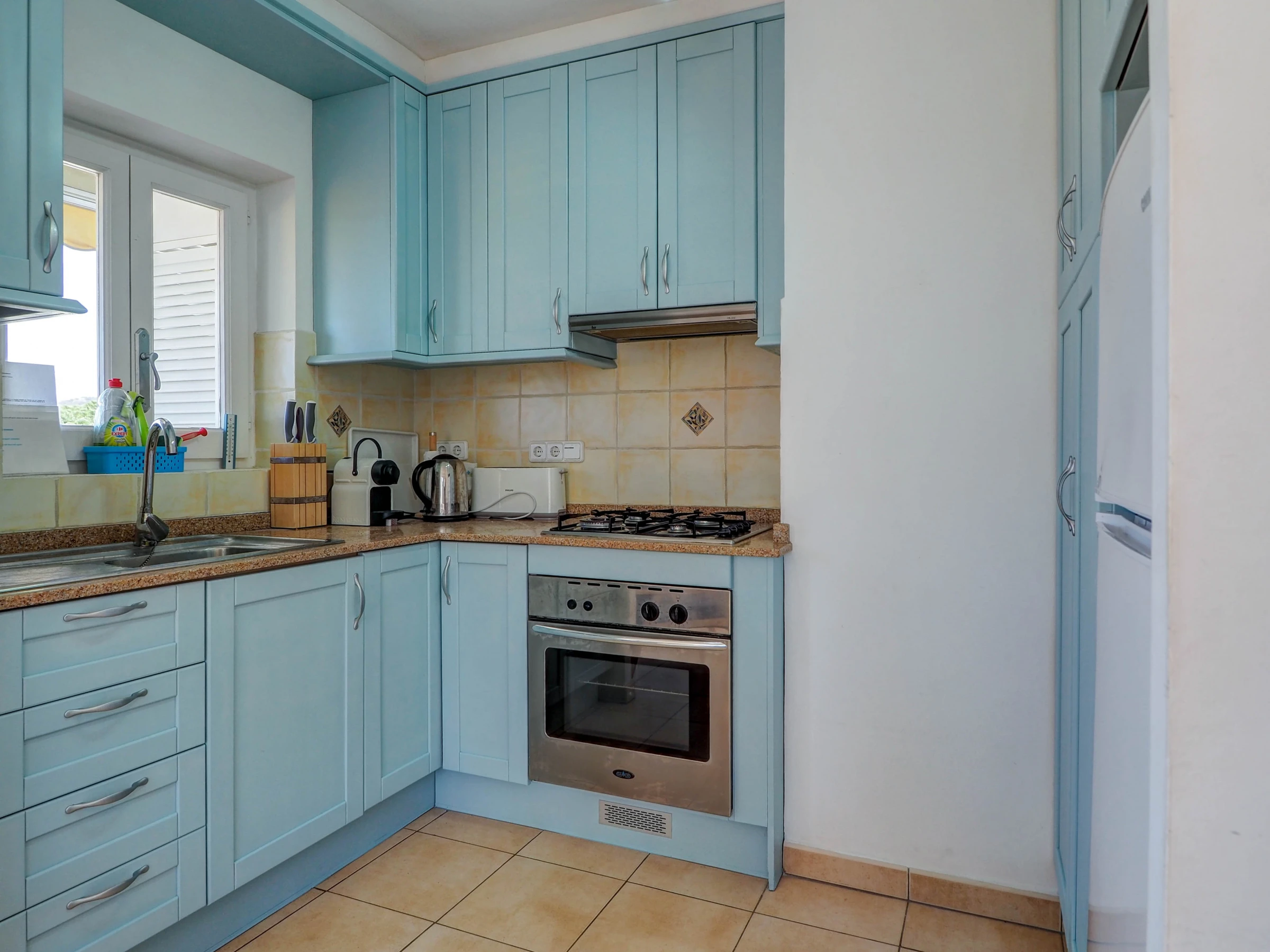 La cuisine, est équipée avec réfrigérateur, micro-ondes, four, congélateur, vaisselle/couverts, ustensiles/cuisine, cafetière, grille pain et bouilloire.