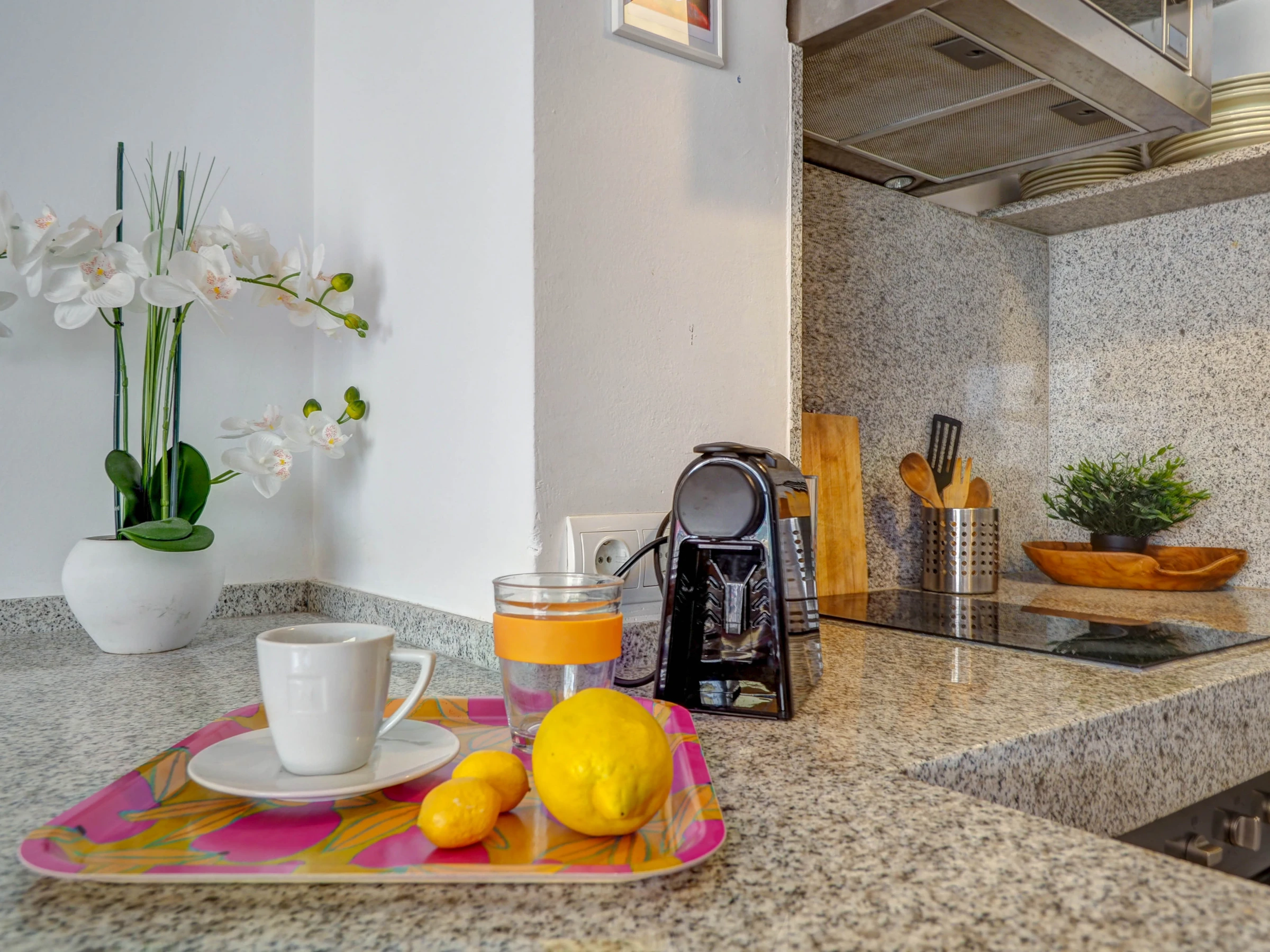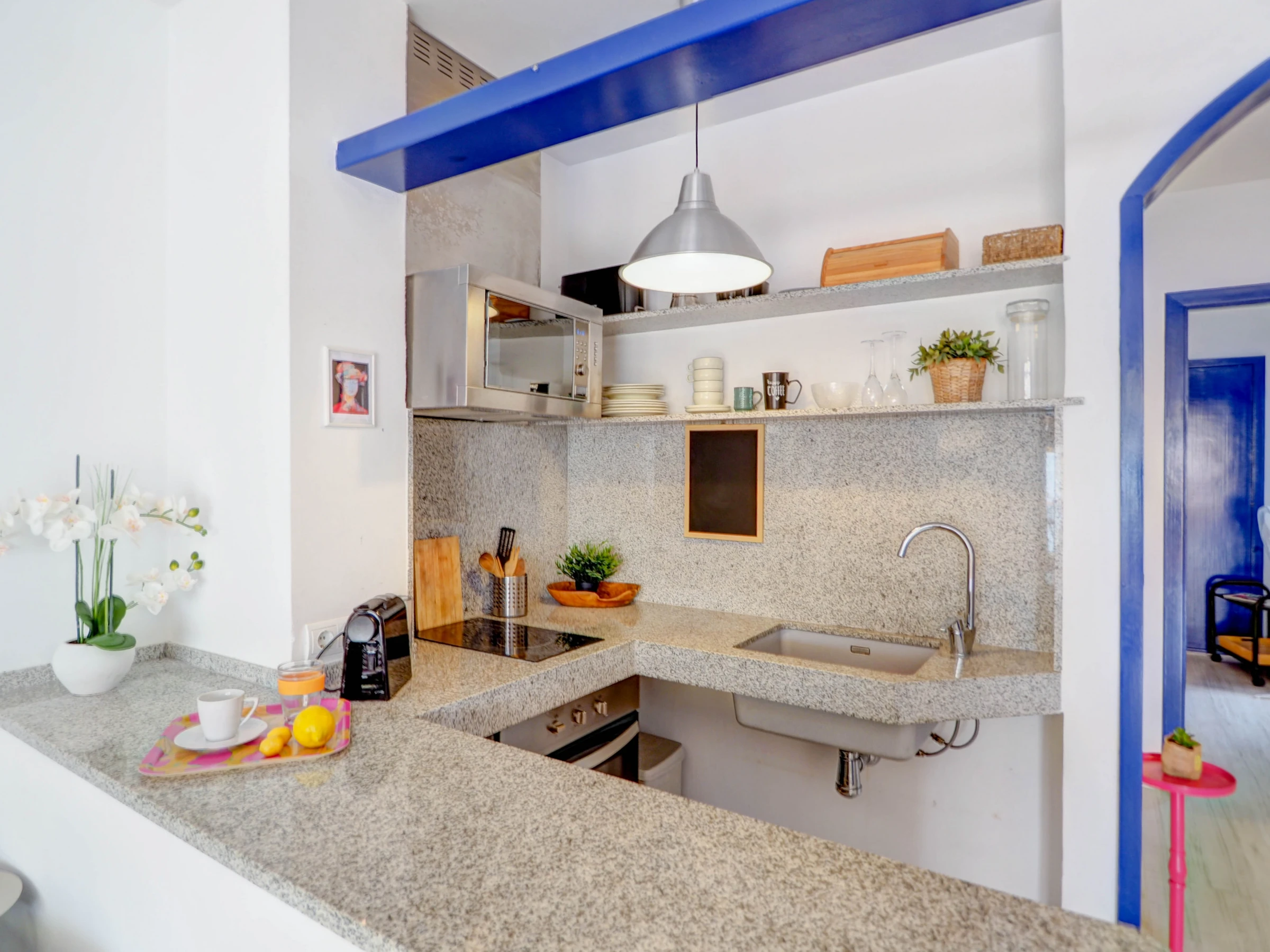 La cuisine, est équipée avec réfrigérateur, micro-ondes, four, congélateur, vaisselle/couverts, ustensiles/cuisine, cafetière, grille pain et bouilloire.