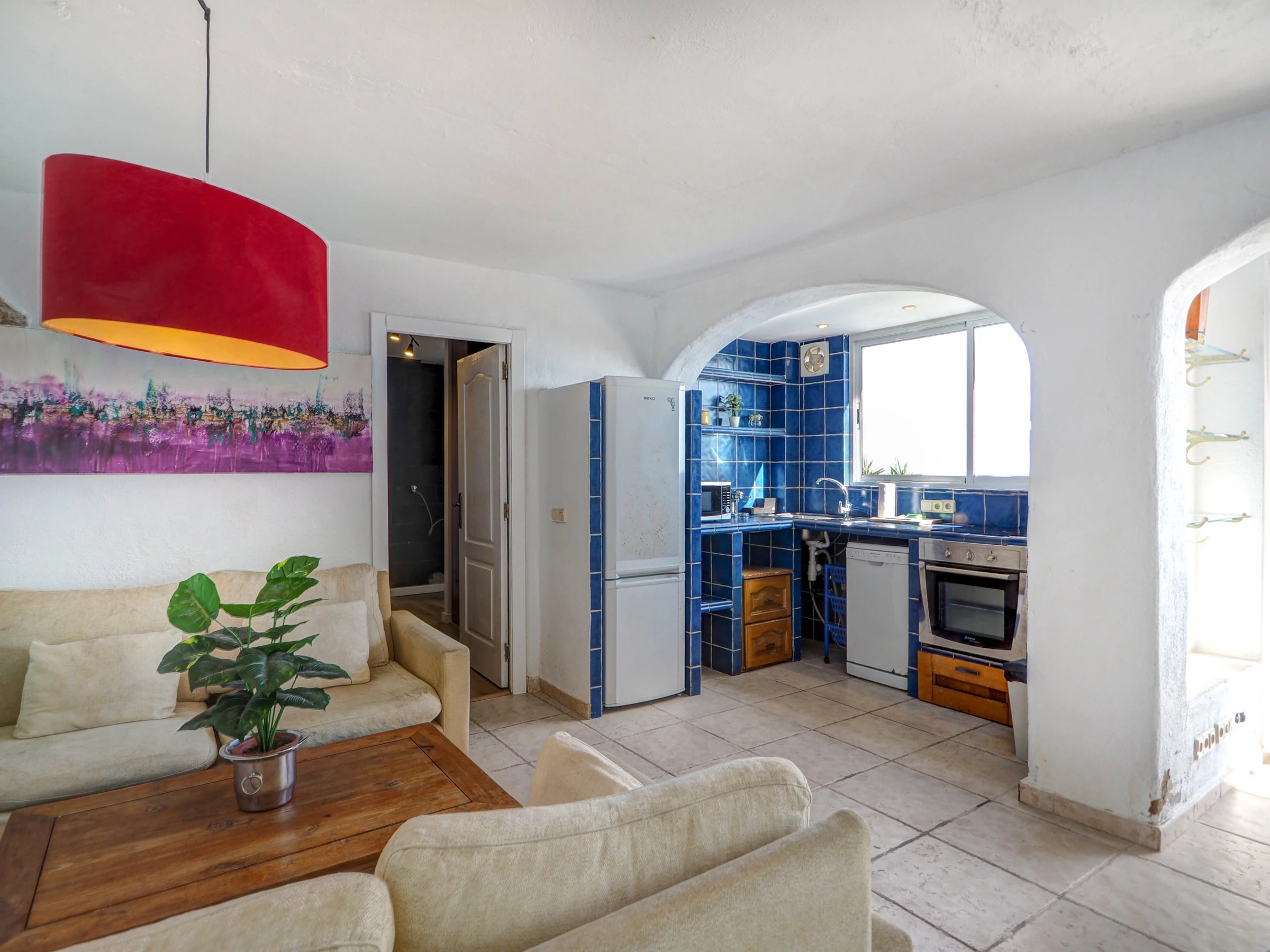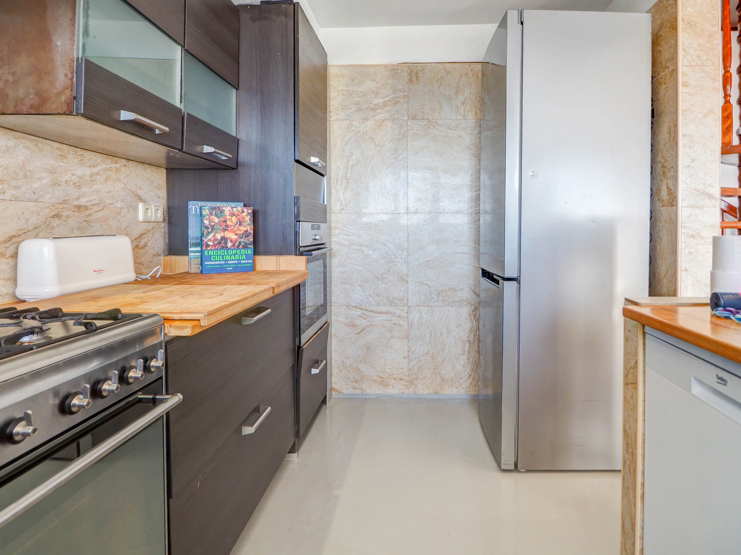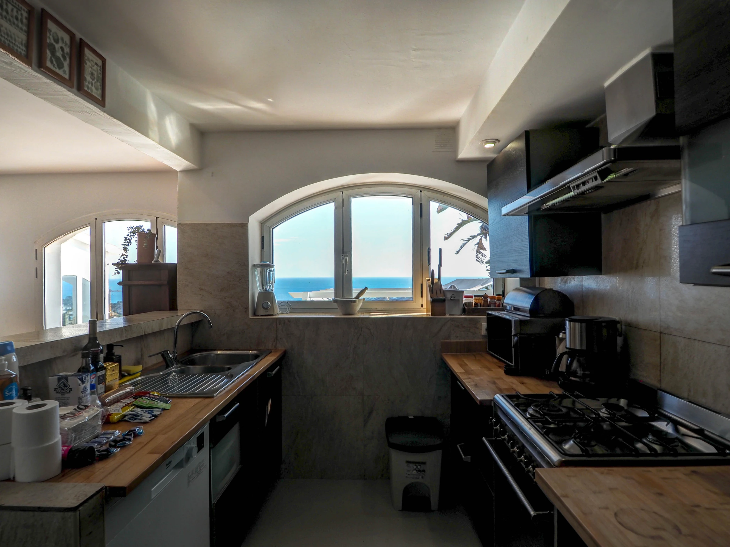 La cuisine, est équipée avec réfrigérateur, micro-ondes, four, congélateur, lave-vaisselle, vaisselle/couverts, ustensiles/cuisine, cafetière, grille pain et bouilloire.