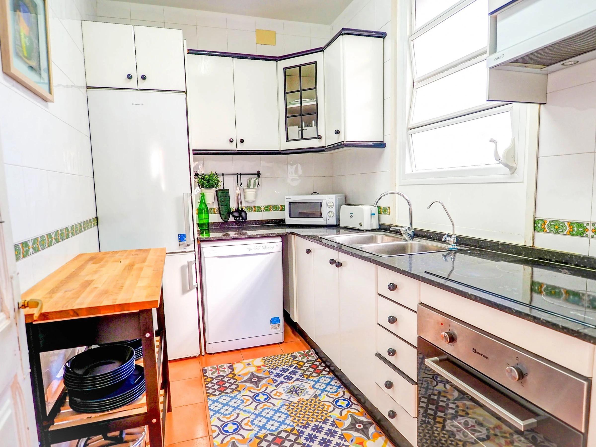 La cuisine, est équipée avec réfrigérateur, micro-ondes, four, congélateur, lave-vaisselle, vaisselle/couverts, ustensiles/cuisine, cafetière, grille pain et bouilloire.