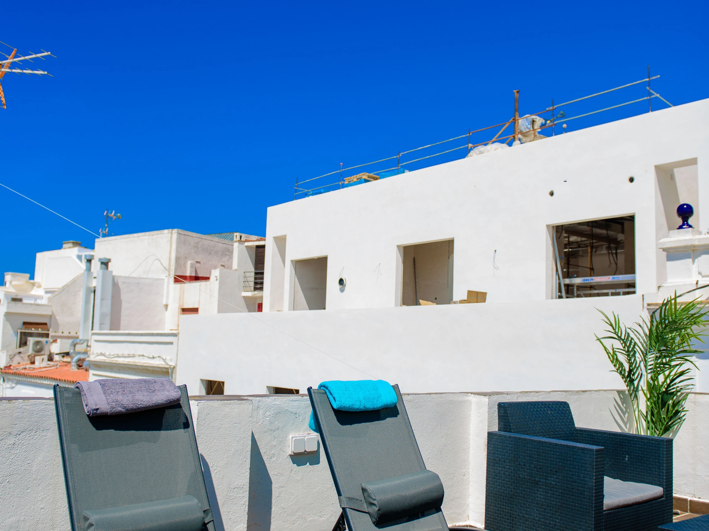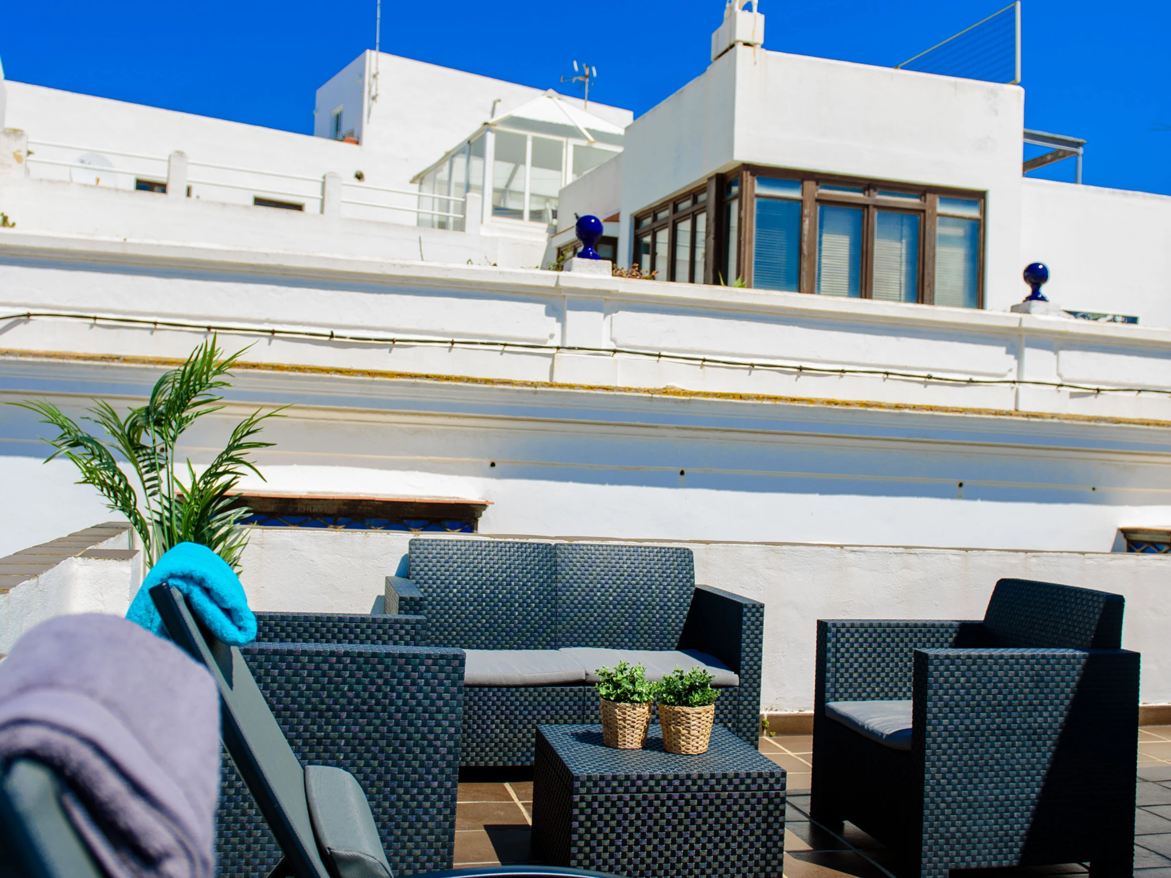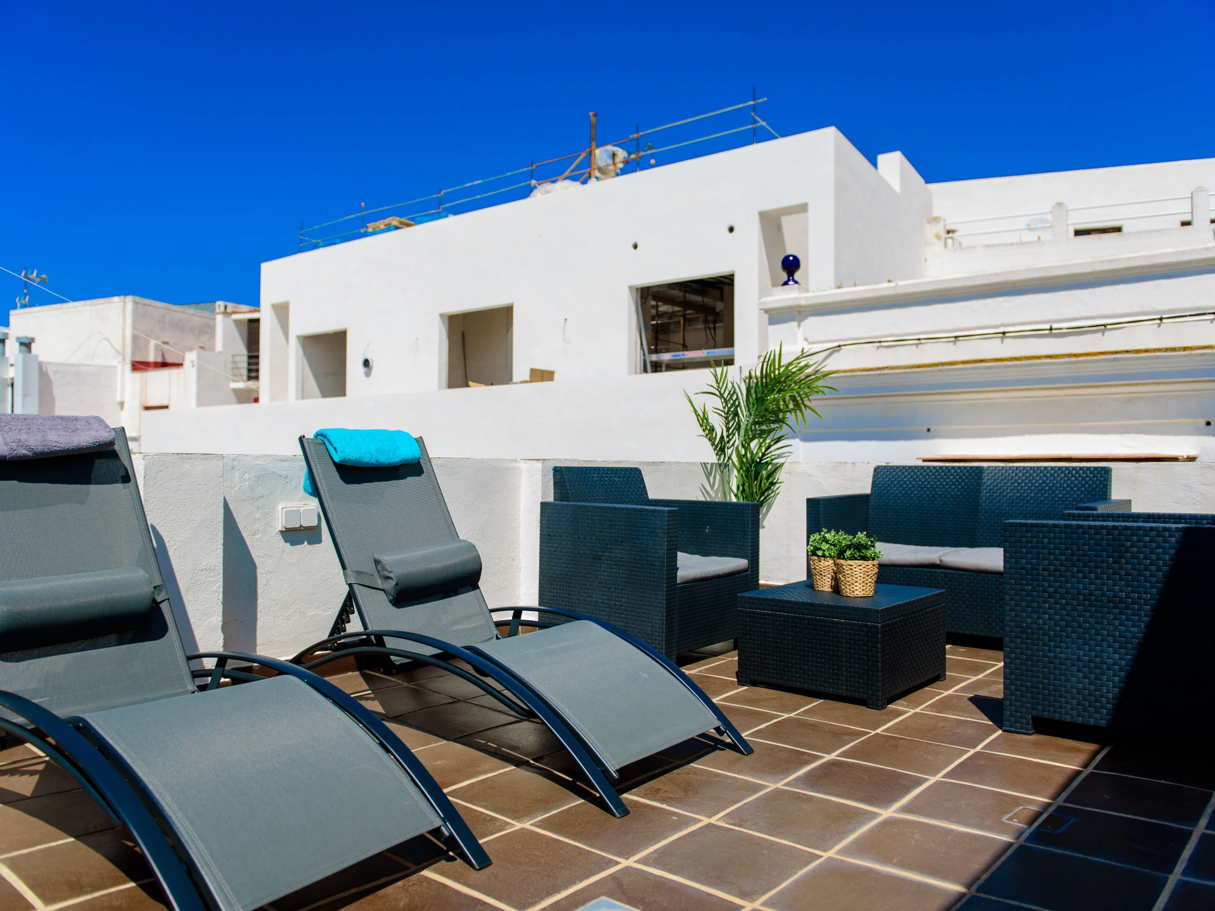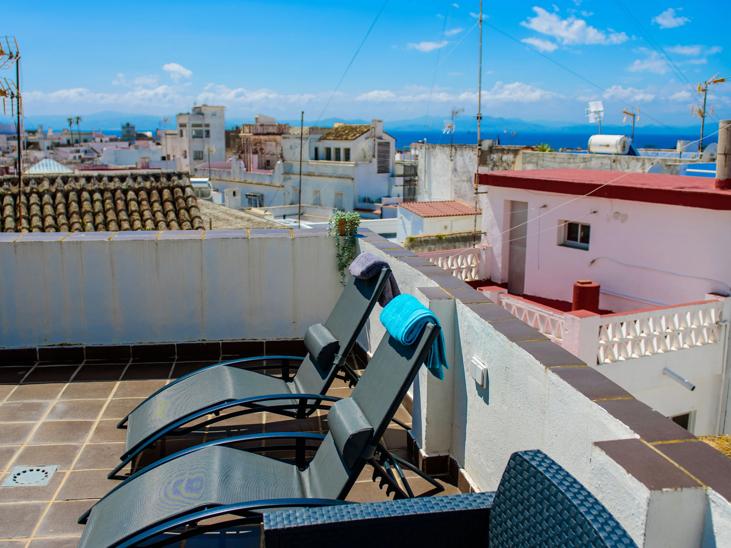 L'appartement est décoré avec beaucoup de goût et vous avez une terrasse privée au dernier étage. Sur cette terrasse, vous avez des meubles de jardin, 2 transats, une table et un tuyau.