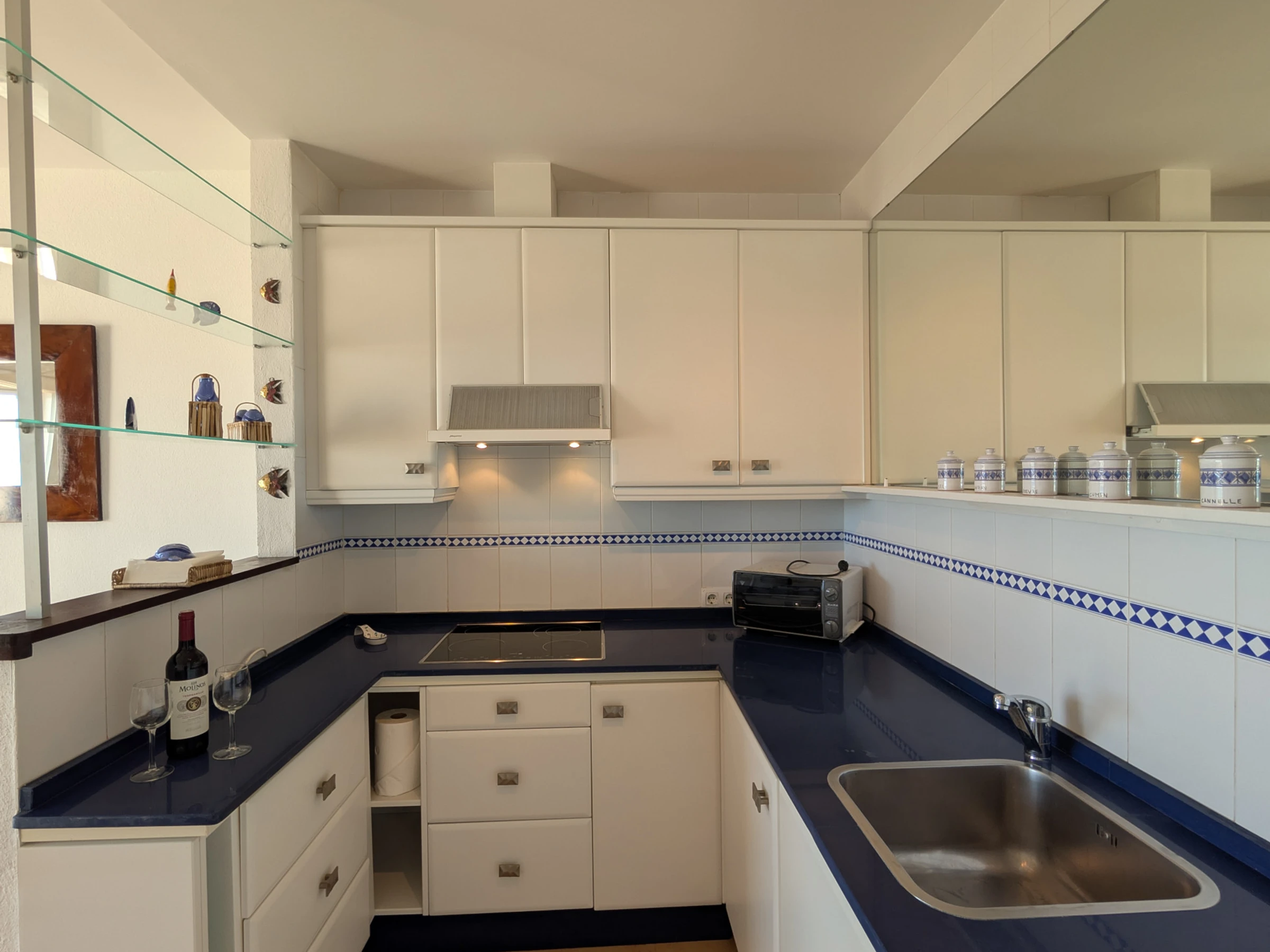 La cuisine américaine est entièrement équipée d'appareils électroménagers modernes, comprenant un réfrigérateur, un lave-linge, un lave-vaisselle, un micro-ondes, un grille-pain, une cafetière, une bouilloire, un presse-agrumes et tous les ustensiles de cuisine nécessaires pour préparer de délicieux repas. La zone de cuisine est pratique et fonctionnelle, permettant une expérience culinaire confortable.
