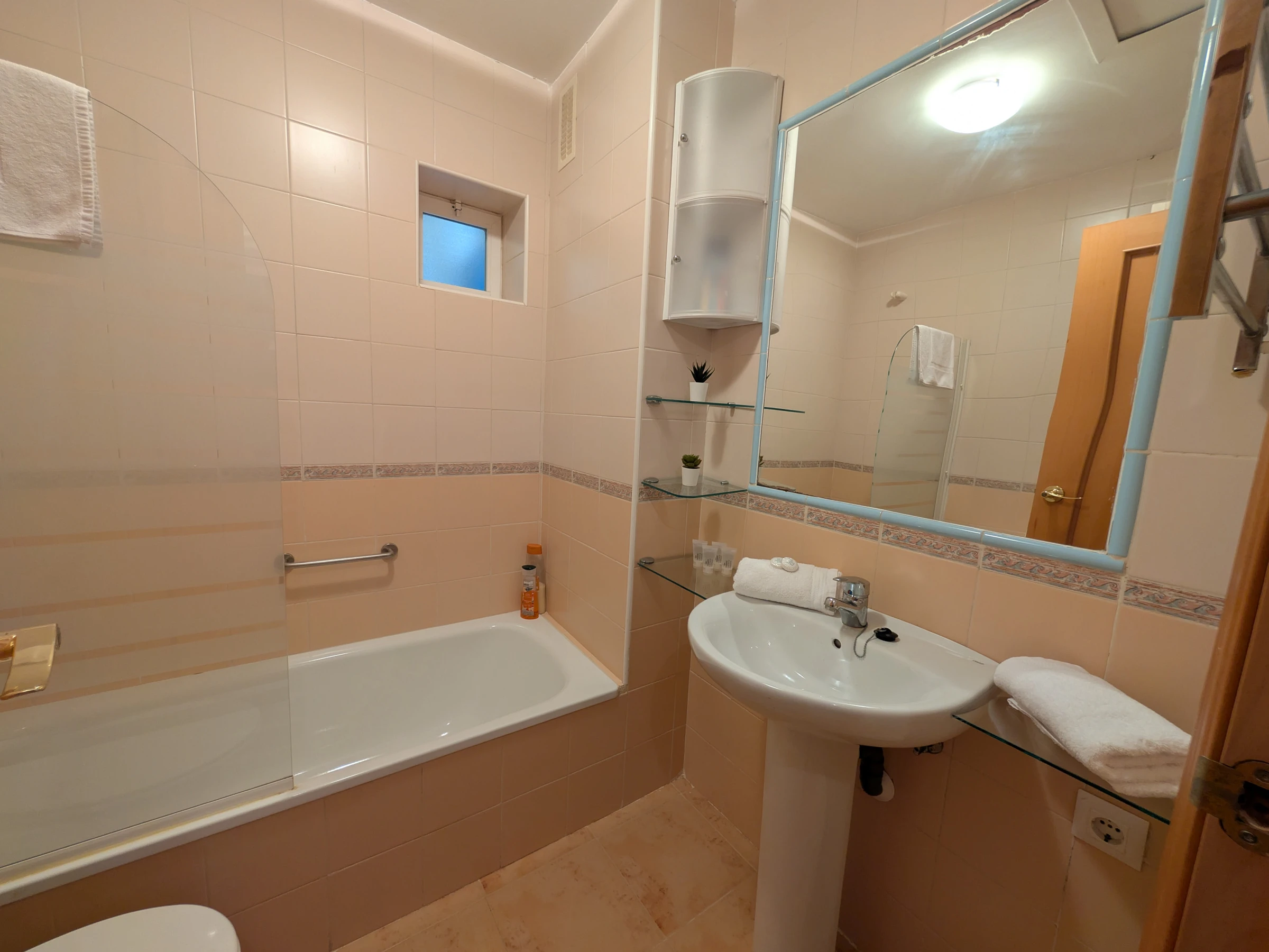 L'appartement dispose d'une salle de bain complète avec baignoire, parfaite pour se détendre après une journée d'aventures. Le chauffage électrique garantit une ambiance confortable lors des soirées les plus fraîches. Il dispose d'une place de parking privée dans le même bâtiment, facilitant le stationnement.