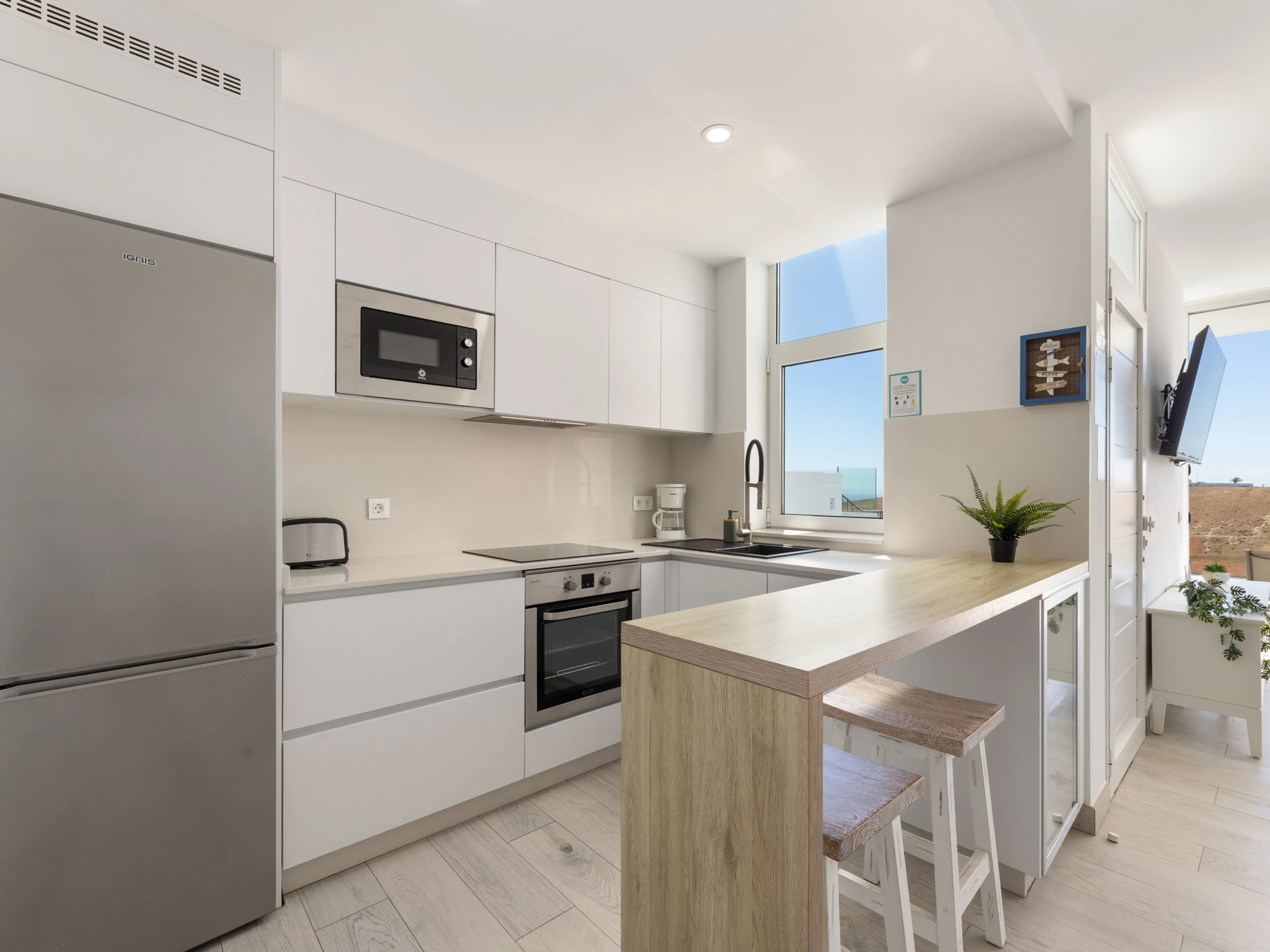 La cuisine, est équipée avec réfrigérateur, micro-ondes, four, congélateur, lave-vaisselle, vaisselle/couverts, ustensiles/cuisine, cafetière, grille pain, bouilloire et presse-agrumes.