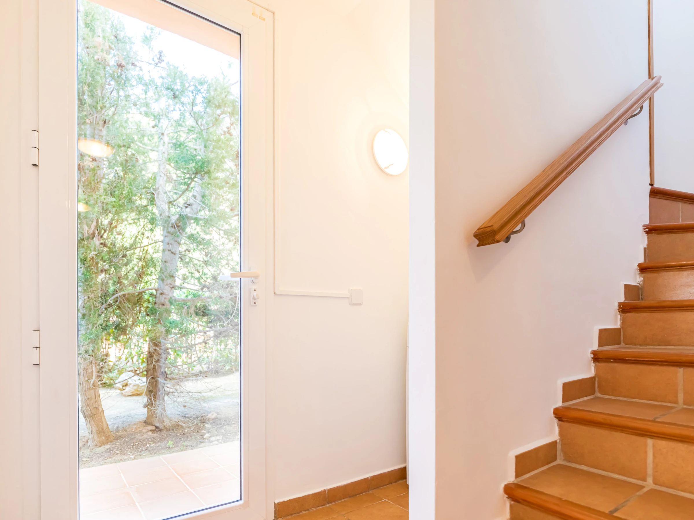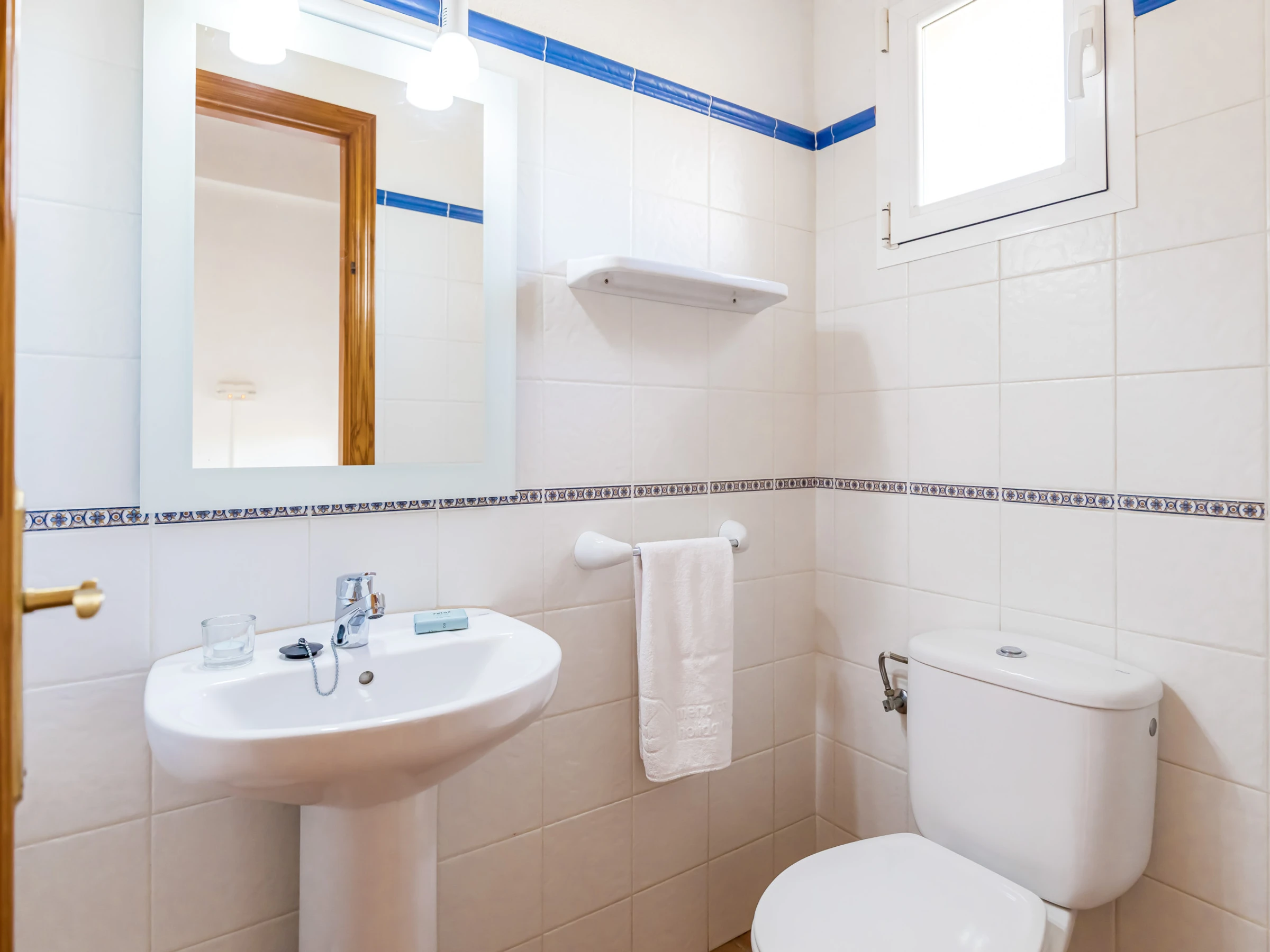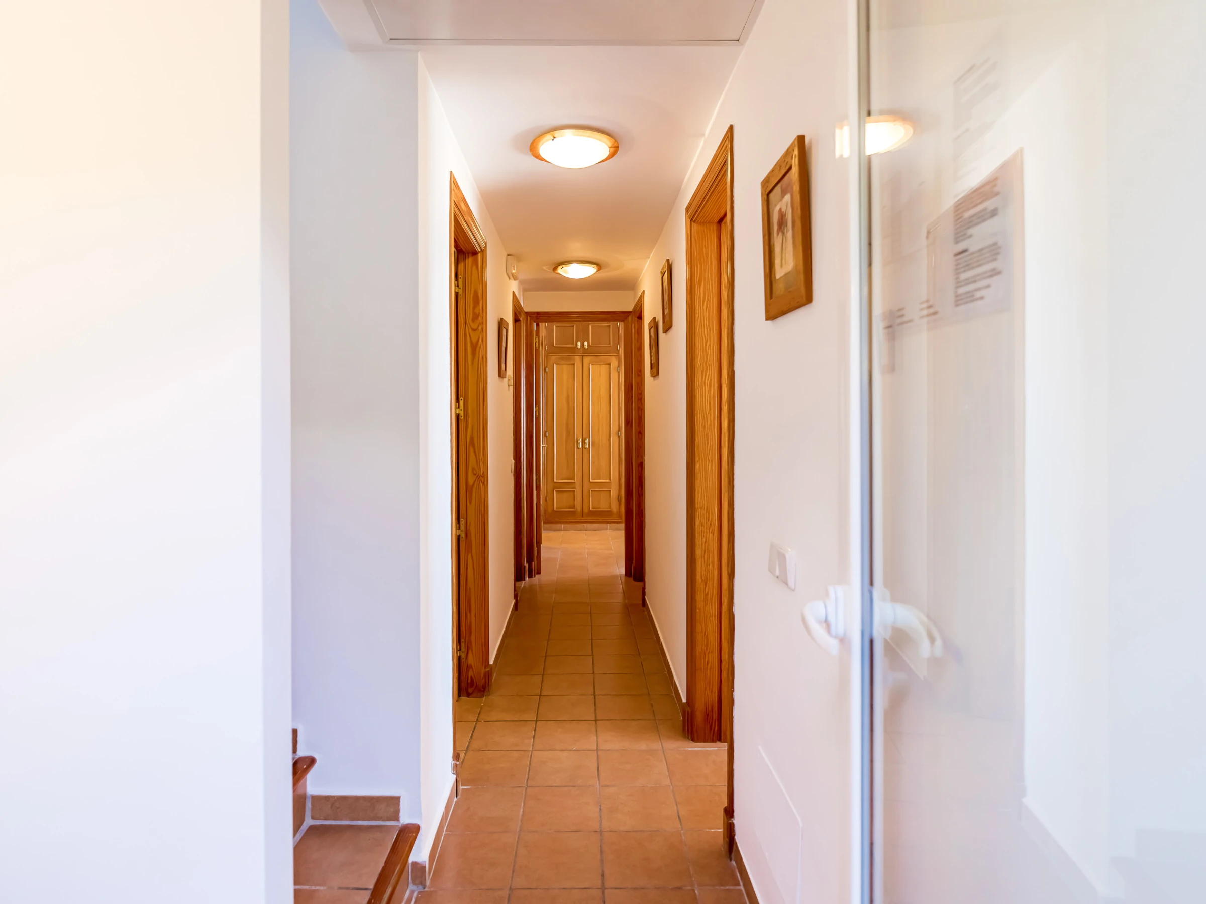 Le logement est réparti sur deux étages. À l'étage supérieur se trouve la zone commune, composée d'un grand salon-salle à manger lumineux avec cuisine intégrée, entièrement équipée avec bouilloire, micro-ondes, machine à café Dolce Gusto, mixeur, presse-agrumes, grille-pain, réfrigérateur, plaque vitrocéramique, four, lave-linge, fer à repasser et planche à repasser. À cet étage se trouve également un toilette et une agréable terrasse couverte avec zone barbecue, parfaite comme salle à manger alternative tout en profitant de magnifiques vues sur la mer.