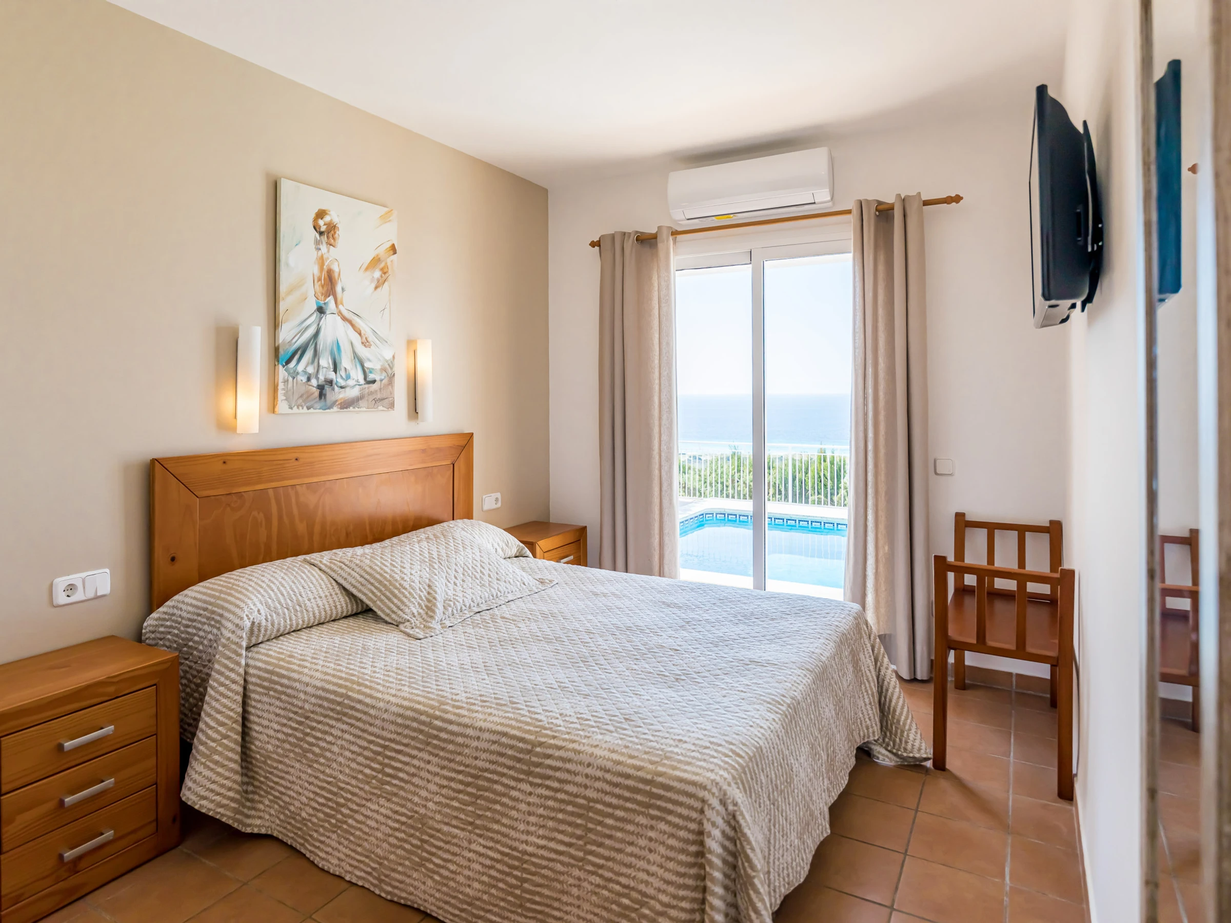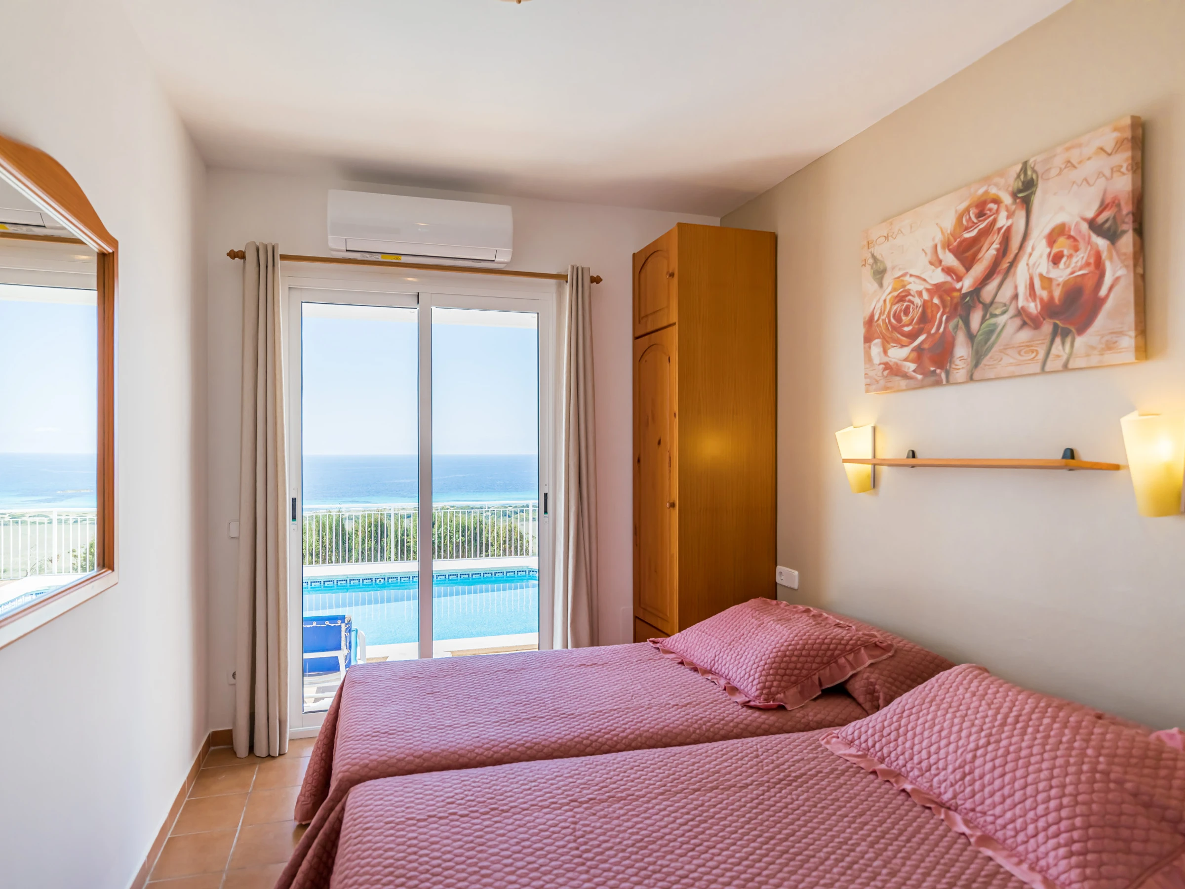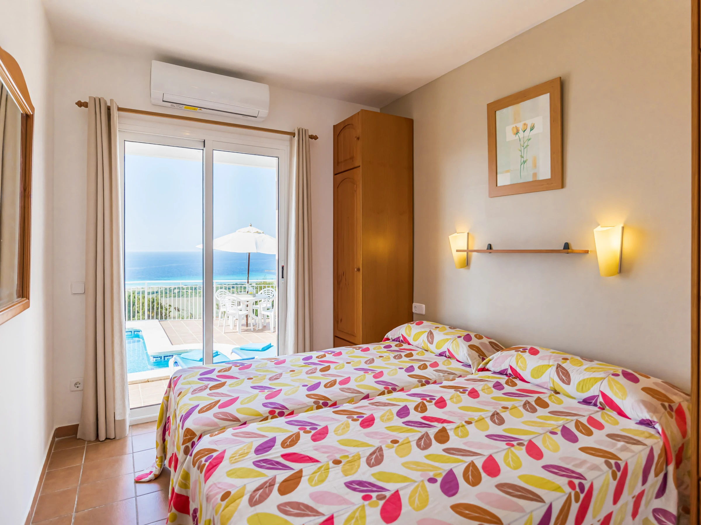 À l'étage inférieur se trouvent les zones de repos. La villa dispose de deux chambres avec deux lits individuels et une chambre avec un lit de matrimonial et une salle de bain attenante. Au même étage se trouve une autre salle de bain complète. Toutes les chambres ont un accès direct à la terrasse et à la piscine, et leurs grandes portes vitrées permettent l'entrée d'une abondante lumière naturelle, offrant des vues imprenables sur la mer et la plage.