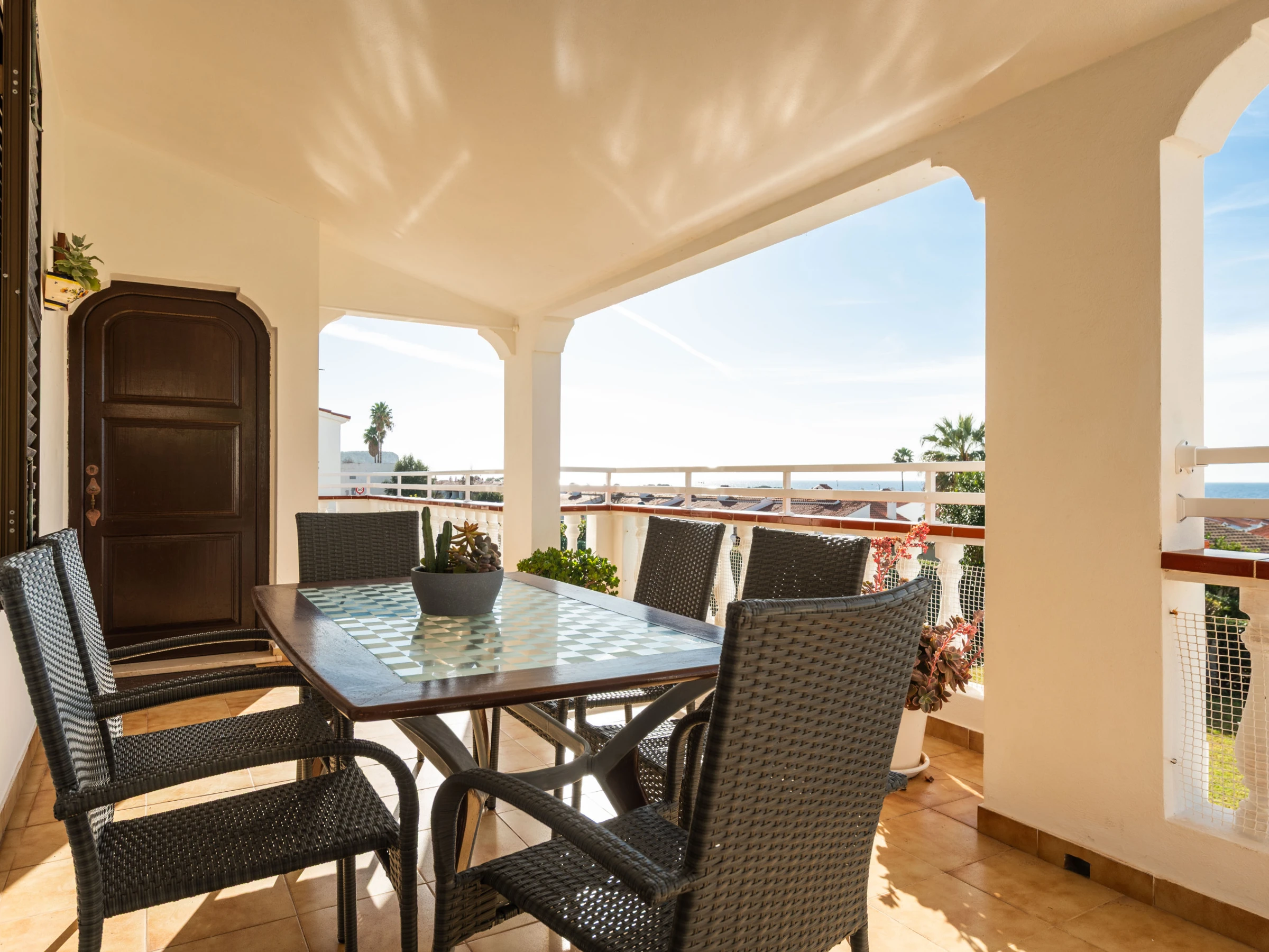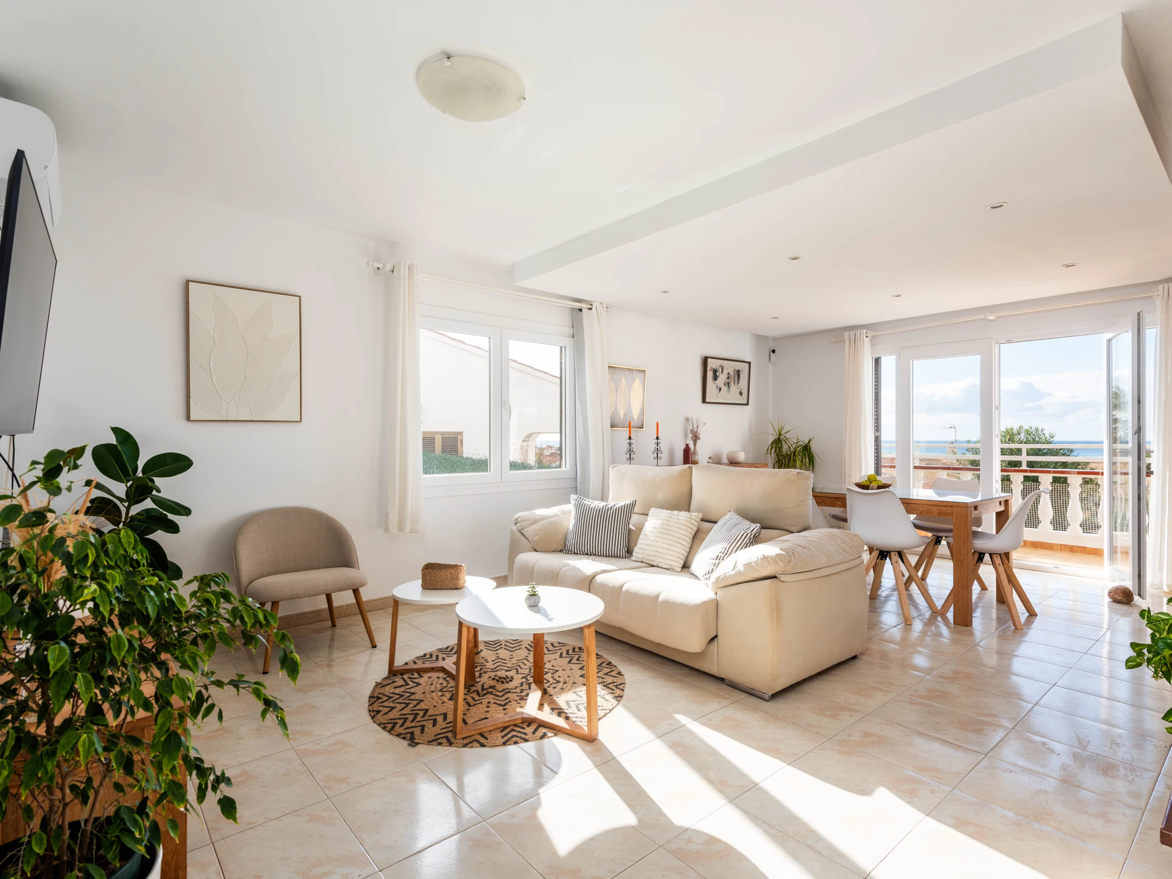 Dans la pièce principale se trouve un salon-salle à manger lumineux équipé d'une Smart TV, du wifi gratuit et de la climatisation. La cuisine indépendante est entièrement équipée, comprenant un lave-vaisselle et une machine à café à capsules, parfaite pour profiter d'un séjour sans souci. À cet étage se trouve également des toilettes de courtoisie. Depuis le salon, on accède à une terrasse couverte spacieuse et agréable, idéale pour se détendre tout en profitant de magnifiques vues sur la mer. De plus, c'est ici que se trouve la chambre principale, qui dispose d'un lit de matrimonial, de la climatisation, d'un dressing et d'une salle de bain attenante avec douche.