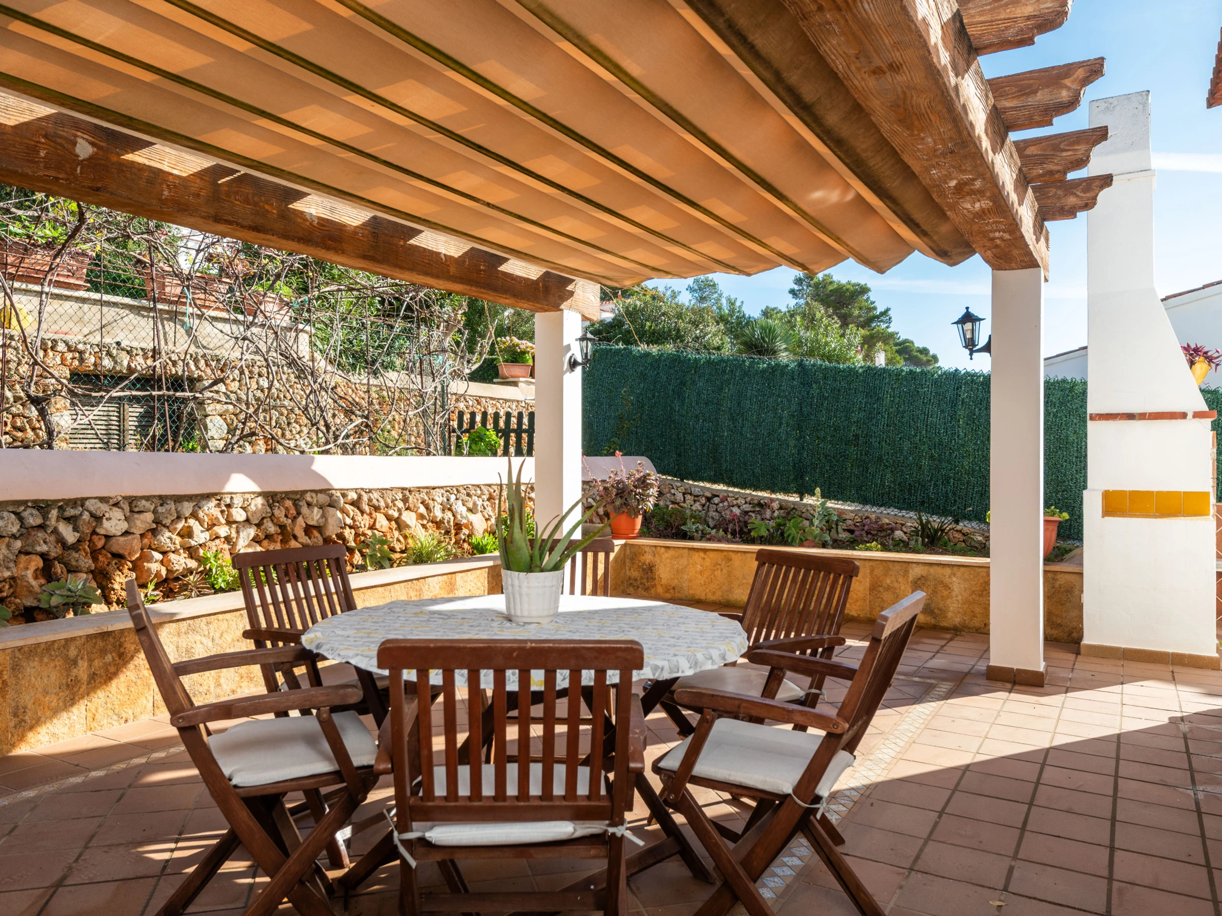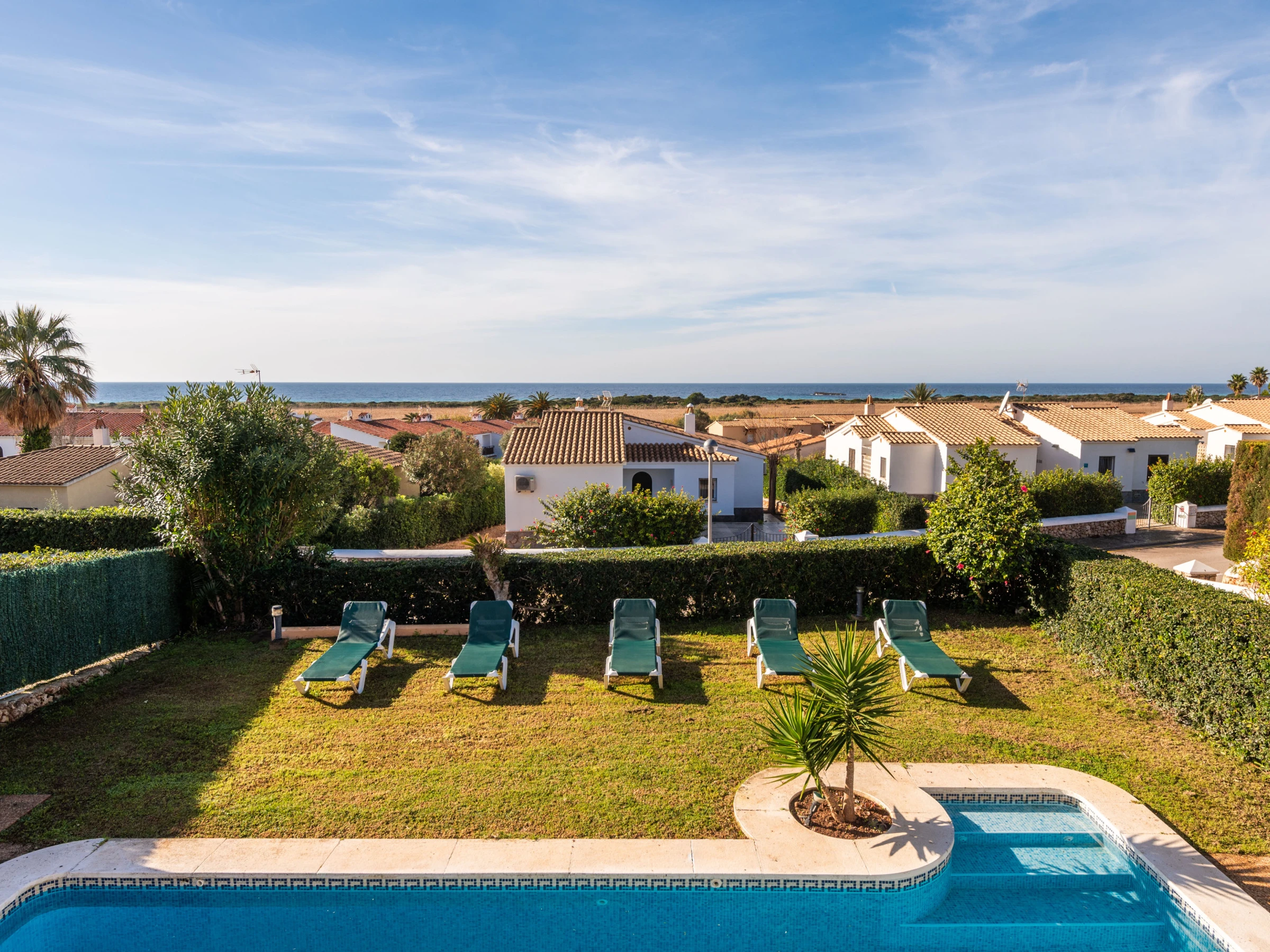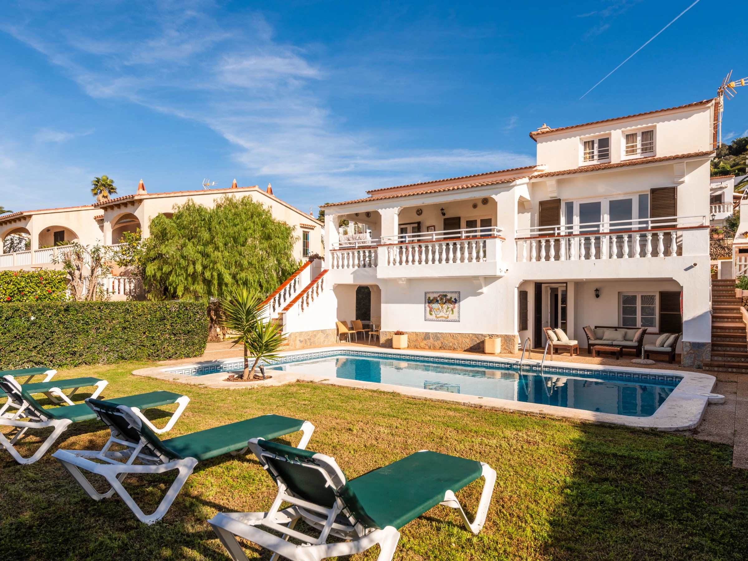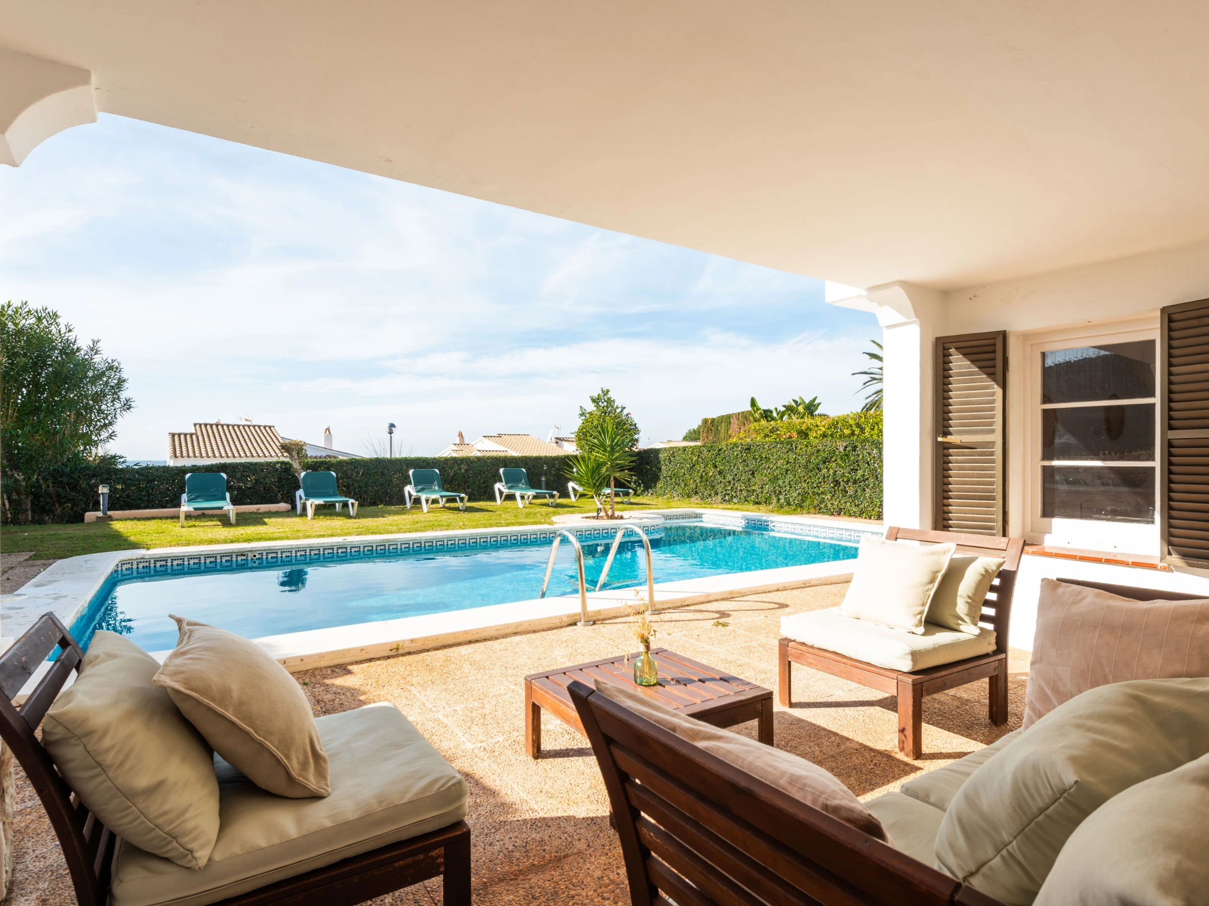 À l'extérieur, la villa offre un jardin soigné avec une grande piscine privée, entourée de transats pour bronzer, et une zone couverte avec un canapé et des chaises, parfaite pour des moments de détente. À l'arrière se trouve un barbecue en maçonnerie, à côté d'une table avec des chaises et un auvent, conçue pour profiter de repas et de dîners agréables en plein air.