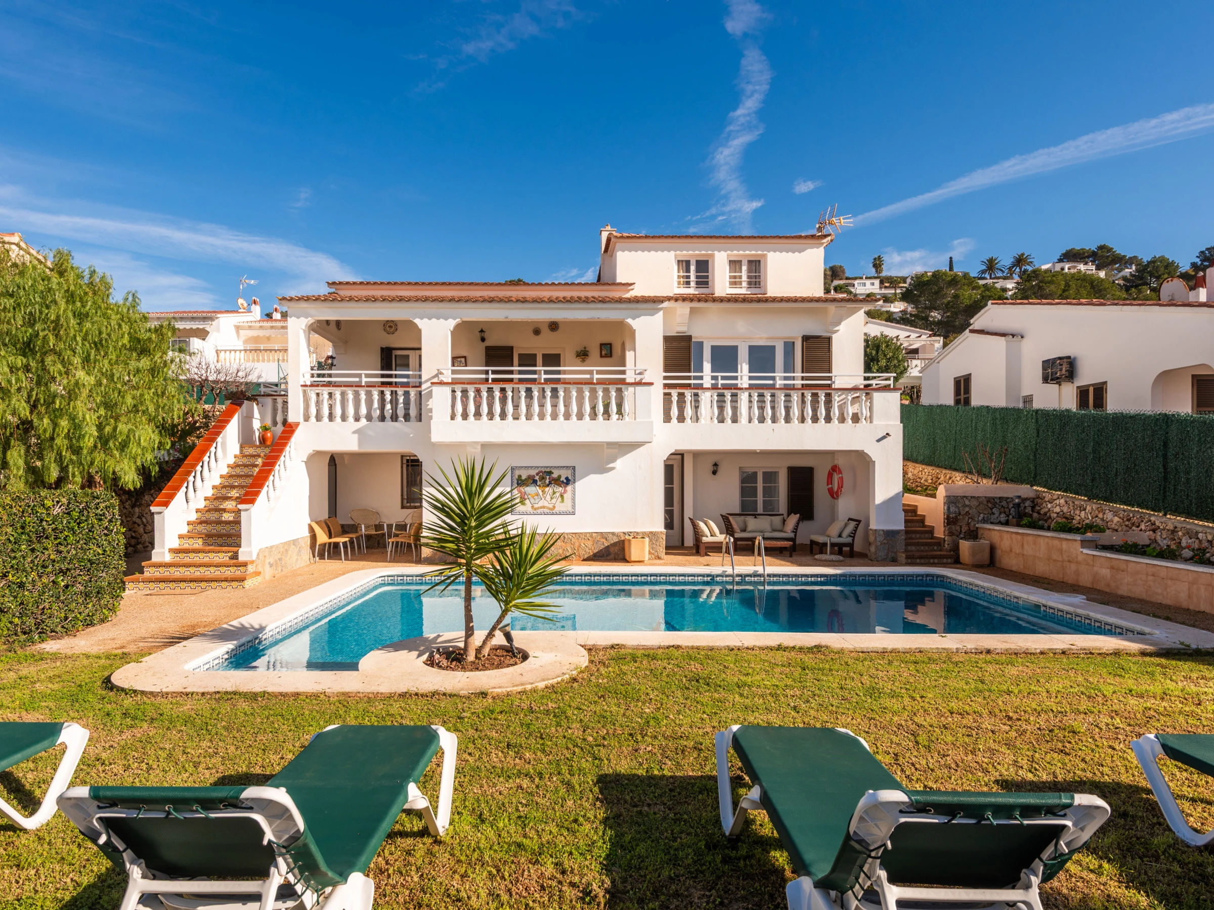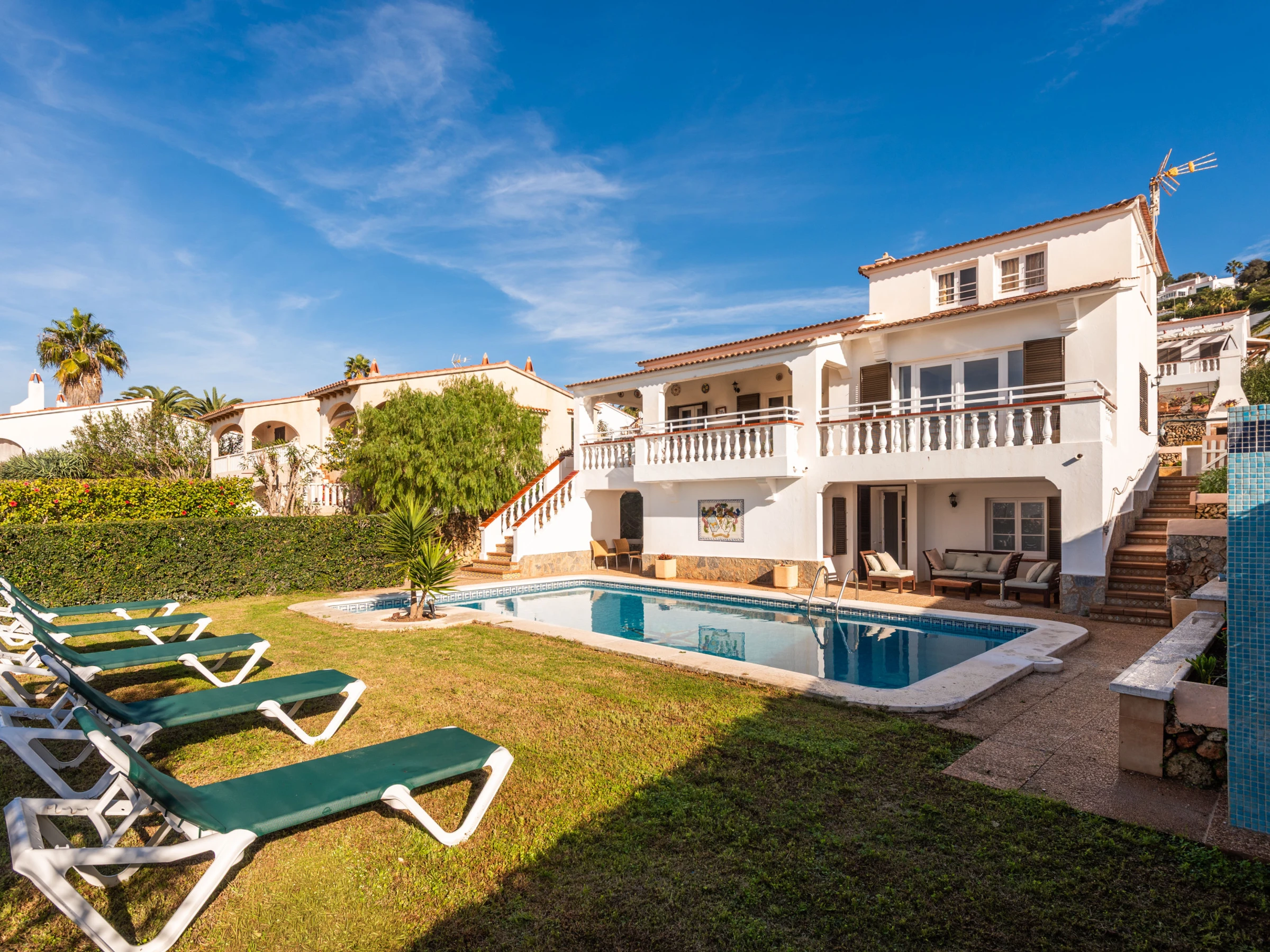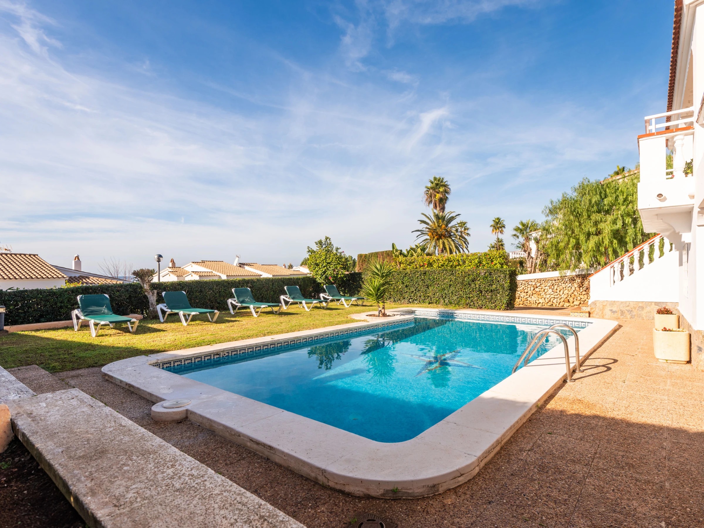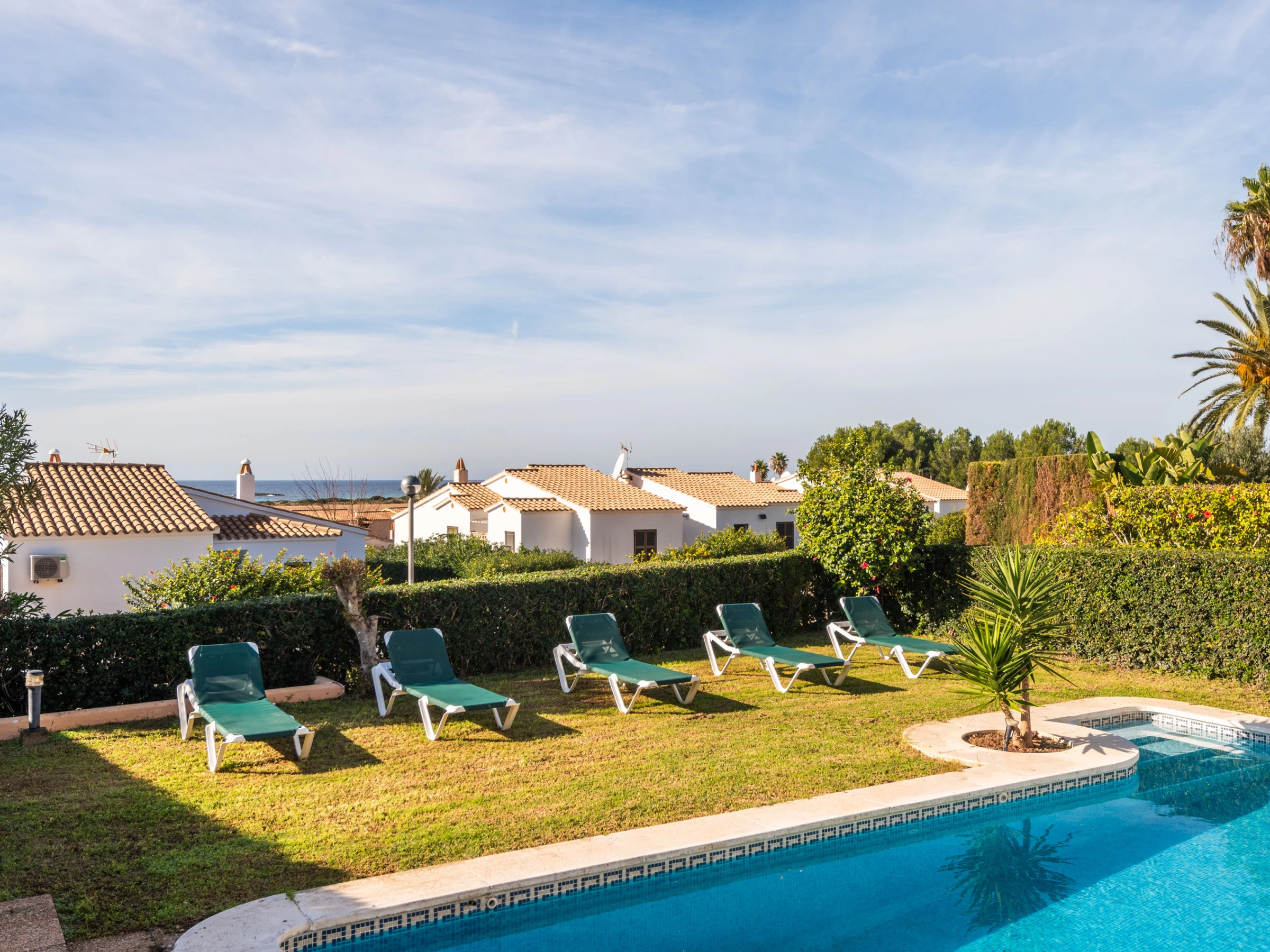 À l'extérieur, la villa offre un jardin soigné avec une grande piscine privée, entourée de transats pour bronzer, et une zone couverte avec un canapé et des chaises, parfaite pour des moments de détente. À l'arrière se trouve un barbecue en maçonnerie, à côté d'une table avec des chaises et un auvent, conçue pour profiter de repas et de dîners agréables en plein air.