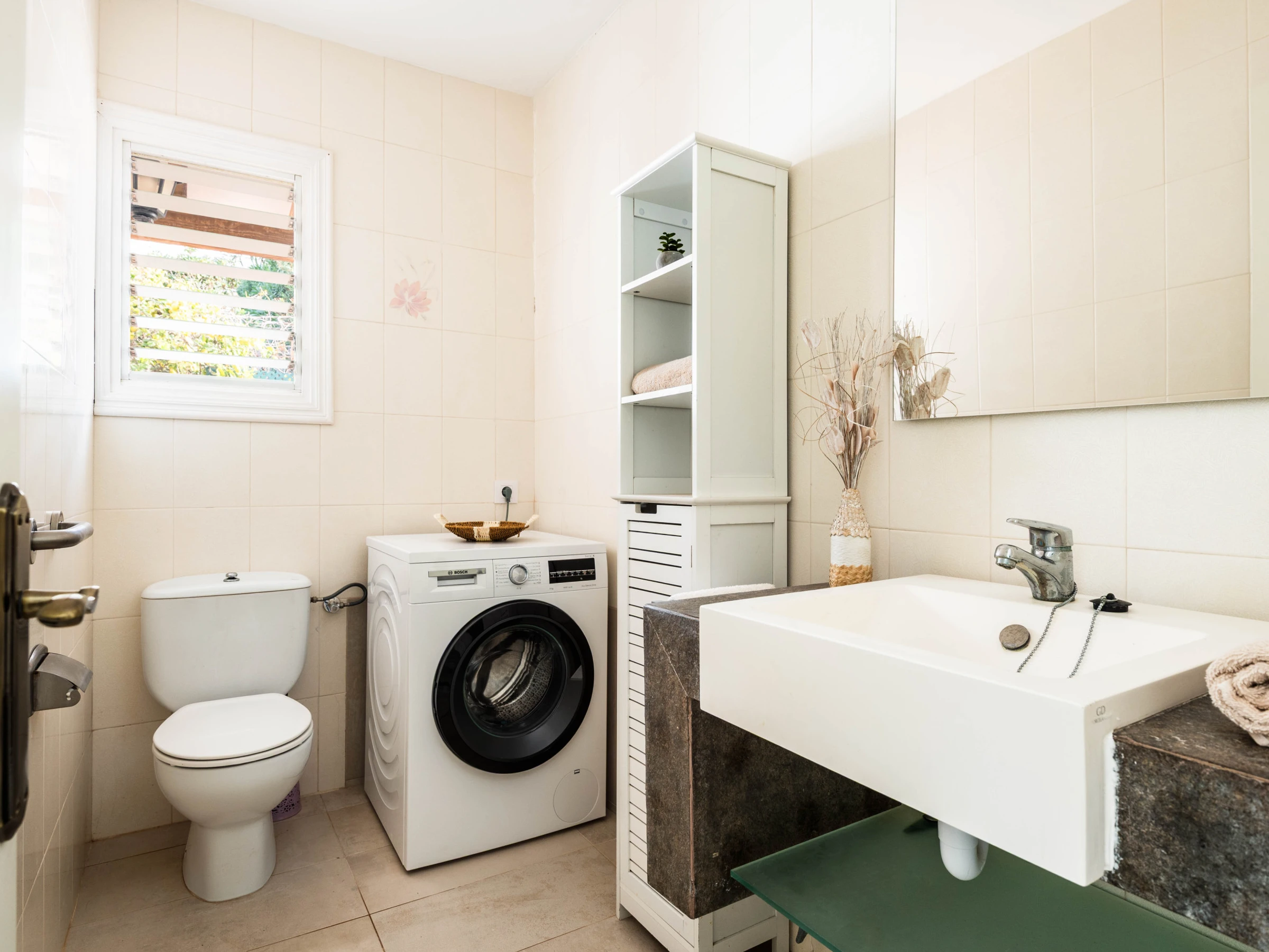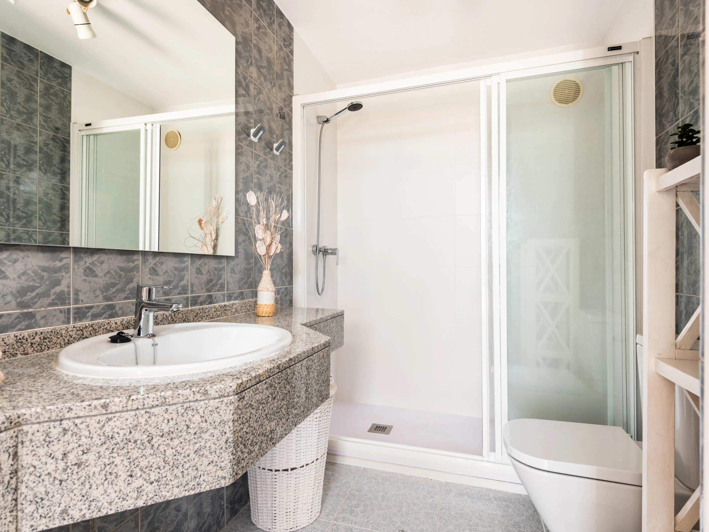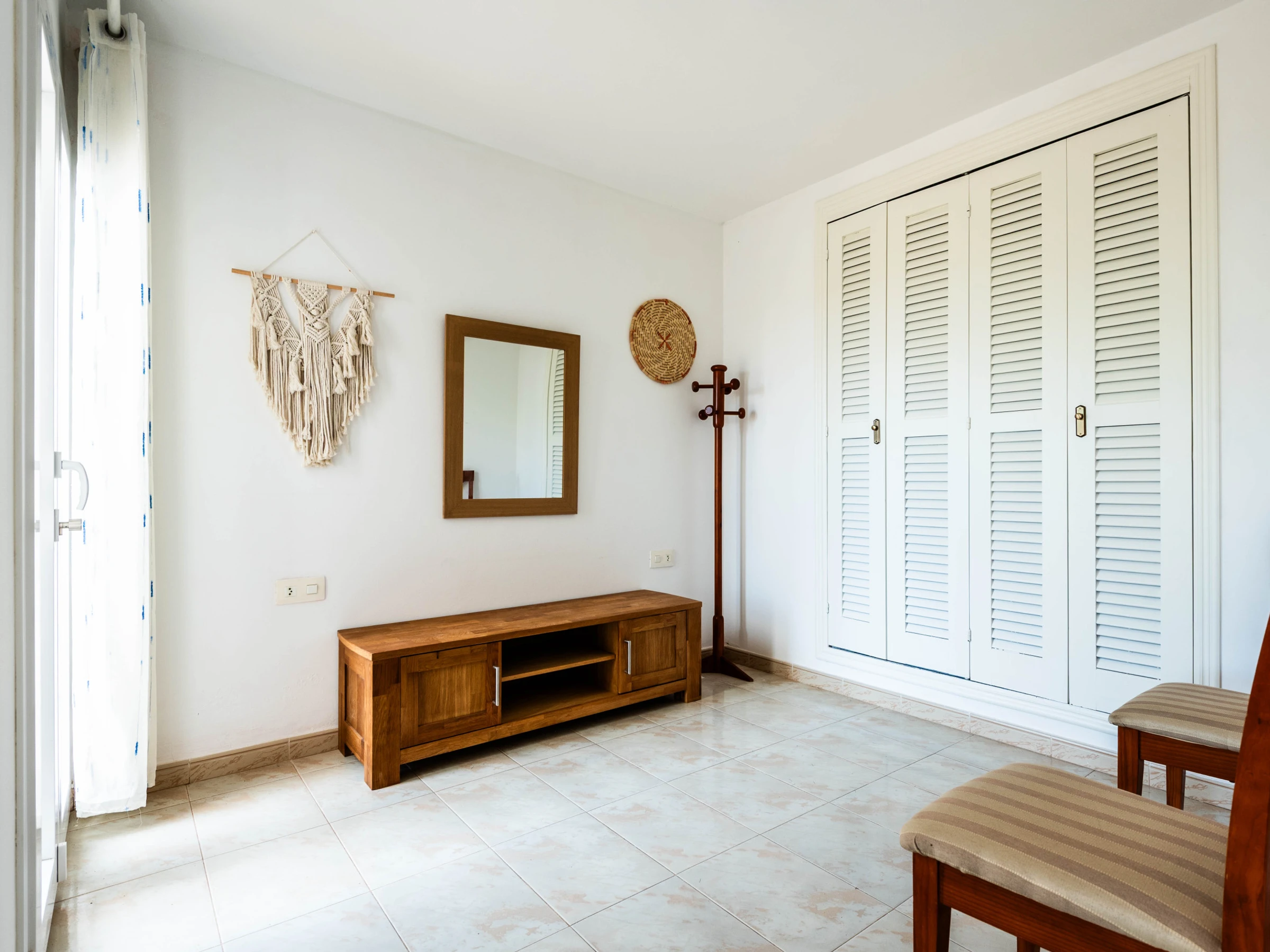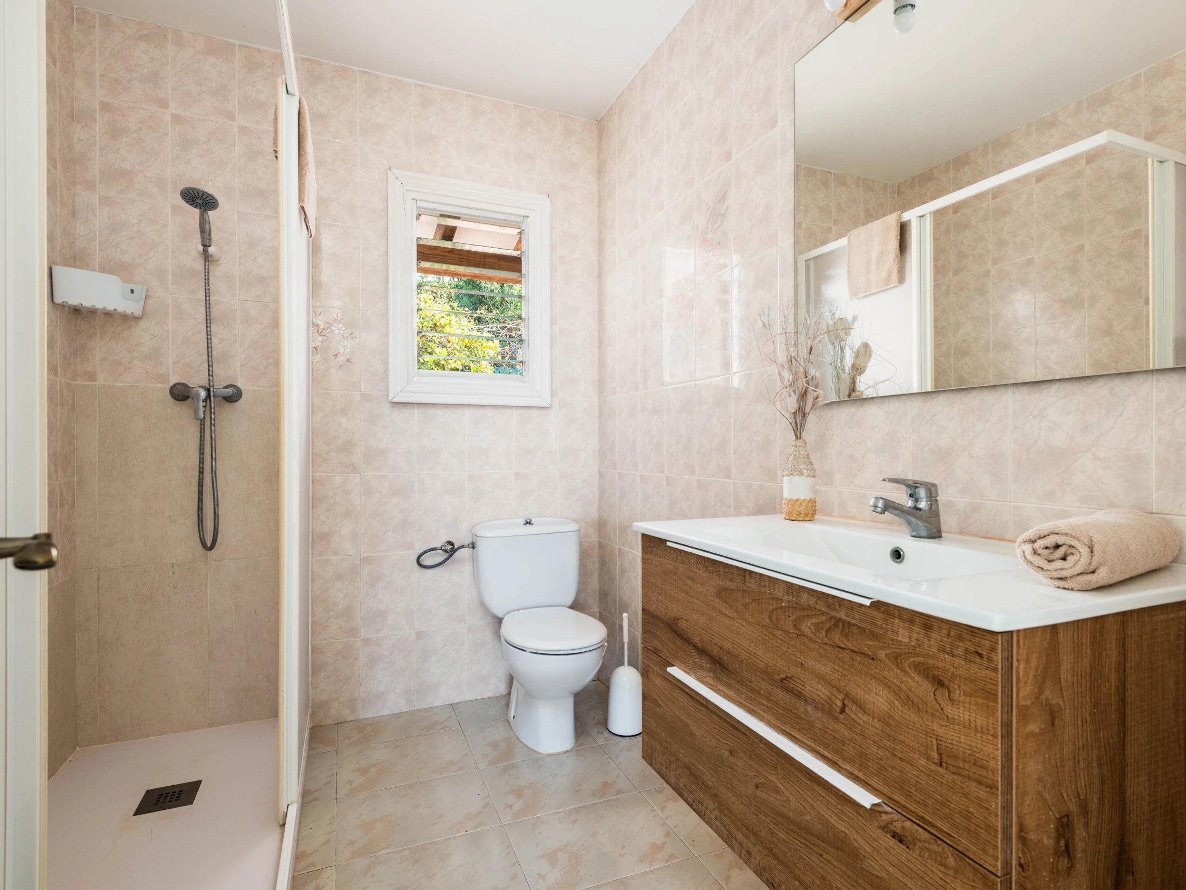 Le rez-de-chaussée abrite deux chambres doubles, toutes deux climatisées. L'une dispose d'un lit de mariage et l'autre de deux lits individuels. À cet étage se trouve également une salle de bain complète indépendante avec douche.