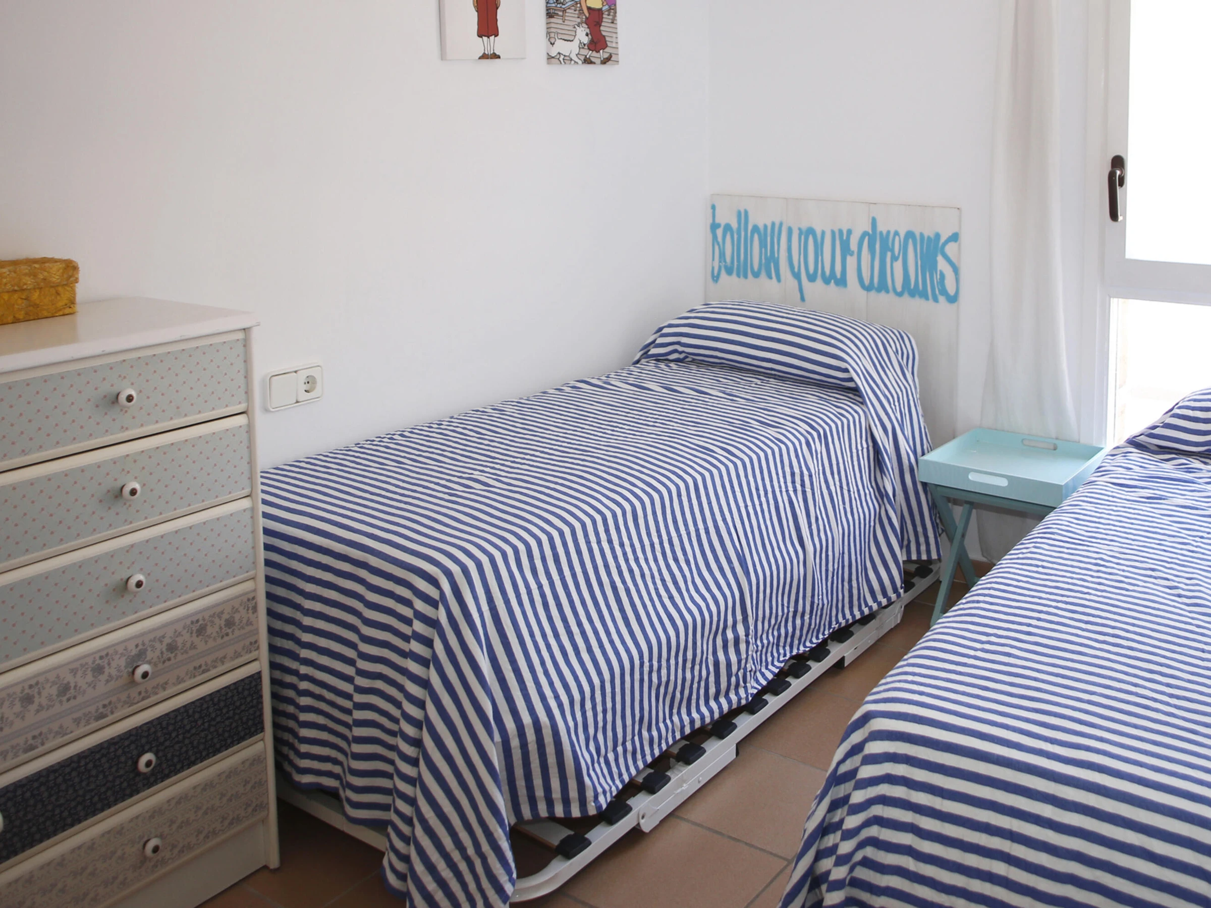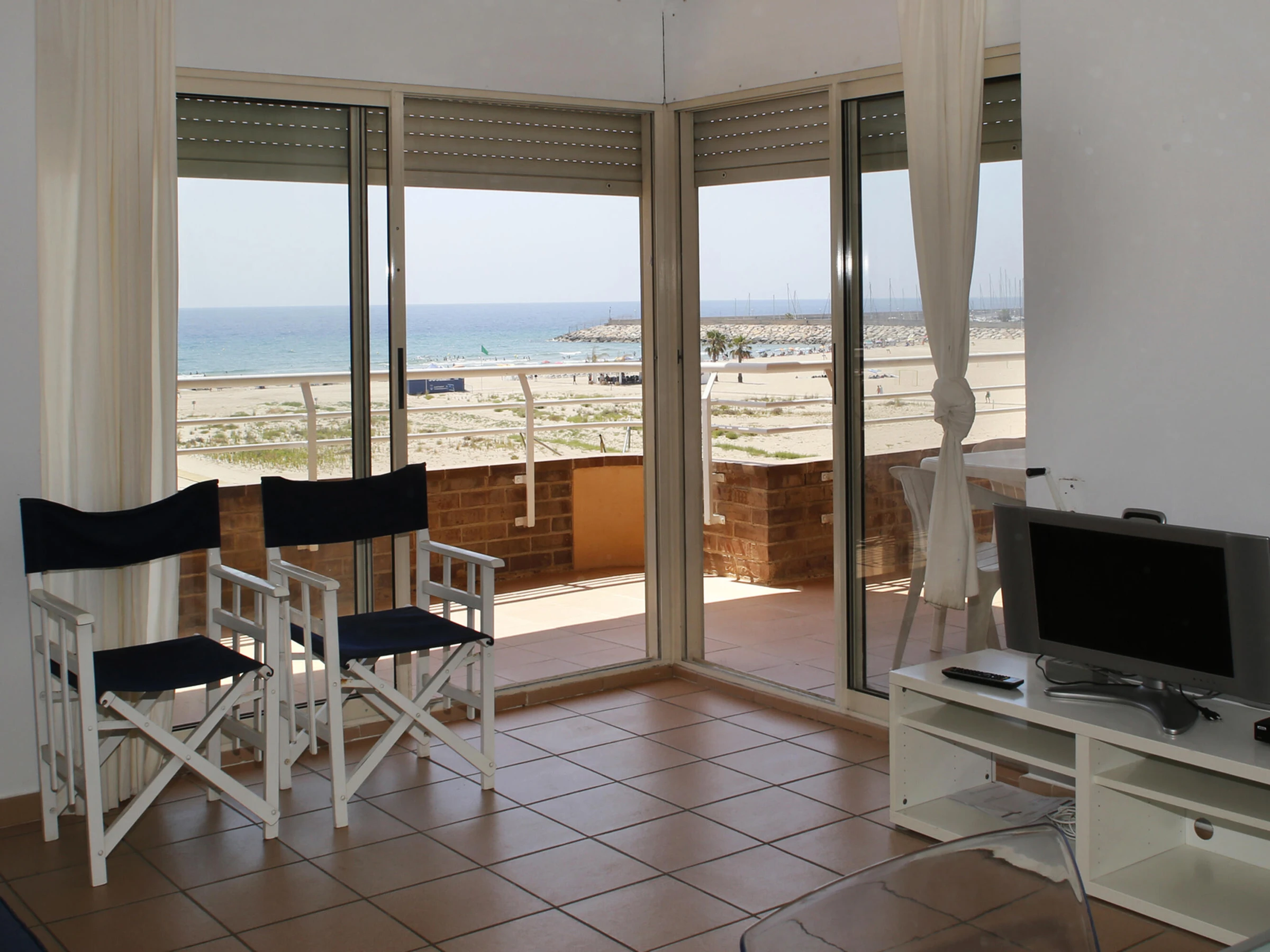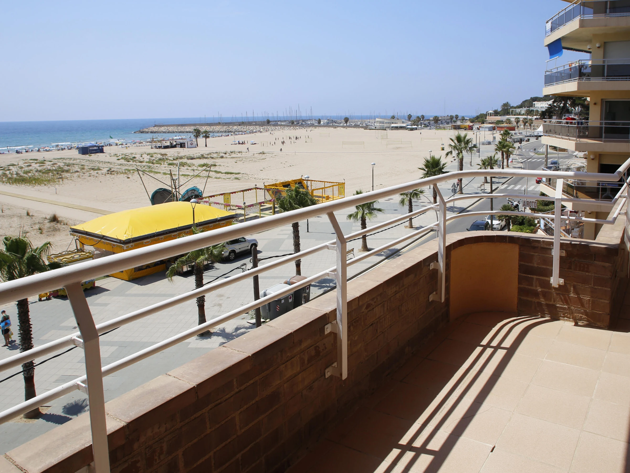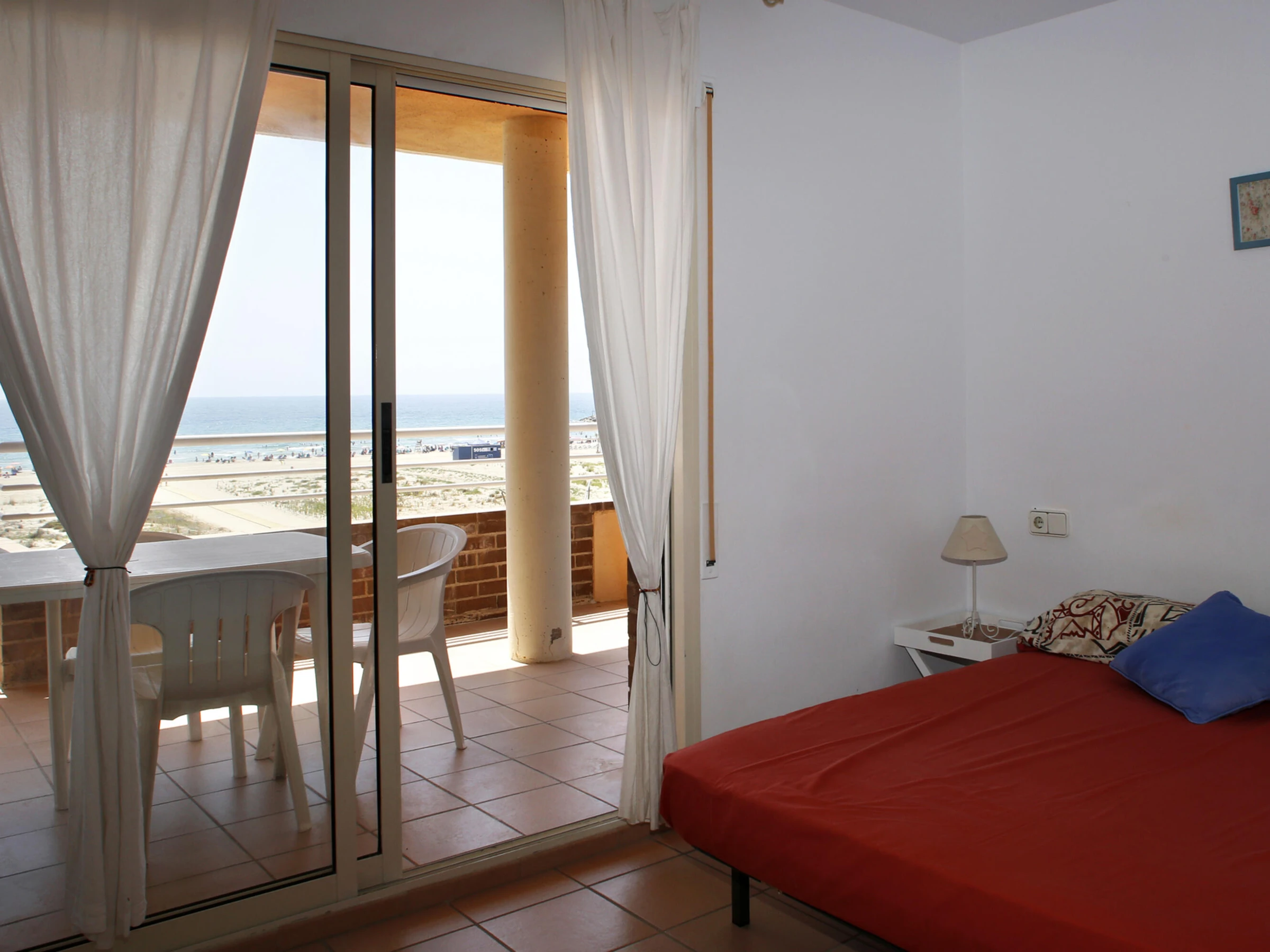 AT038 Les Palmeres: Appartement pour 6 personnes en face de la plage « La Paella ». Le logement est au troisième étage et dispose d'un salon avec terrasse avec vue frontale sur la mer et équipé avec des meubles de jardin, une cuisine séparée, trois chambres (une avec un lit double, une avec deux lits simples et une avec un lit simple et un lit gigogne) et deux salles de bain complètes avec une baignoire. Le prix de location comprend l'utilisation d'un espace de stationnement privé dans l'enceinte et la piscine commune (ouverte toute l'année). Le logement dispose d'une connexion internet. À proximité se trouvent le port de plaisance et de la promenade où il y a des restaurants, un supermarché et un espace dans le sable de beach-volley. Les réservations de groupe composées de jeunes âgés de 16 à 26 ans ne sont pas acceptées.