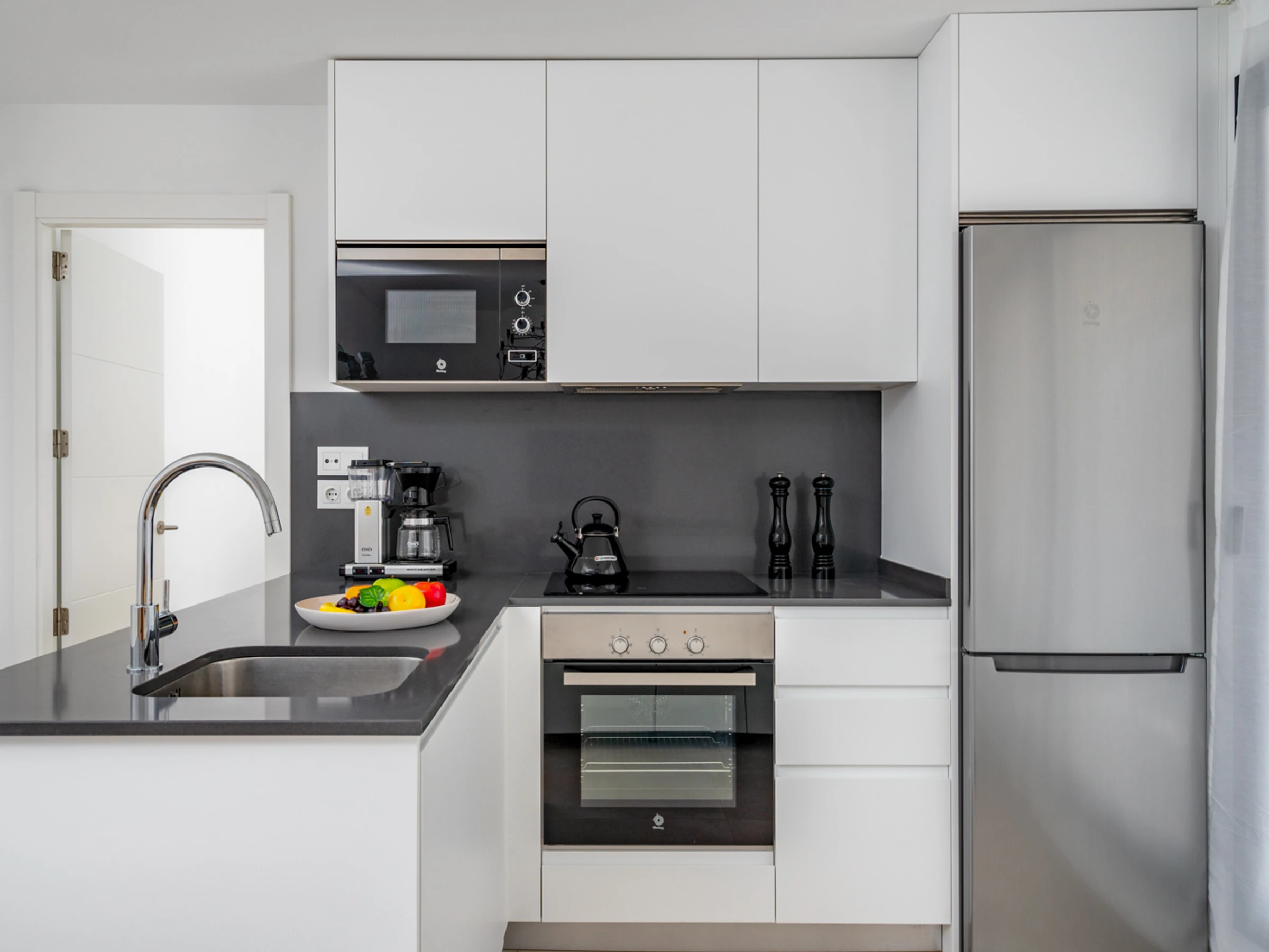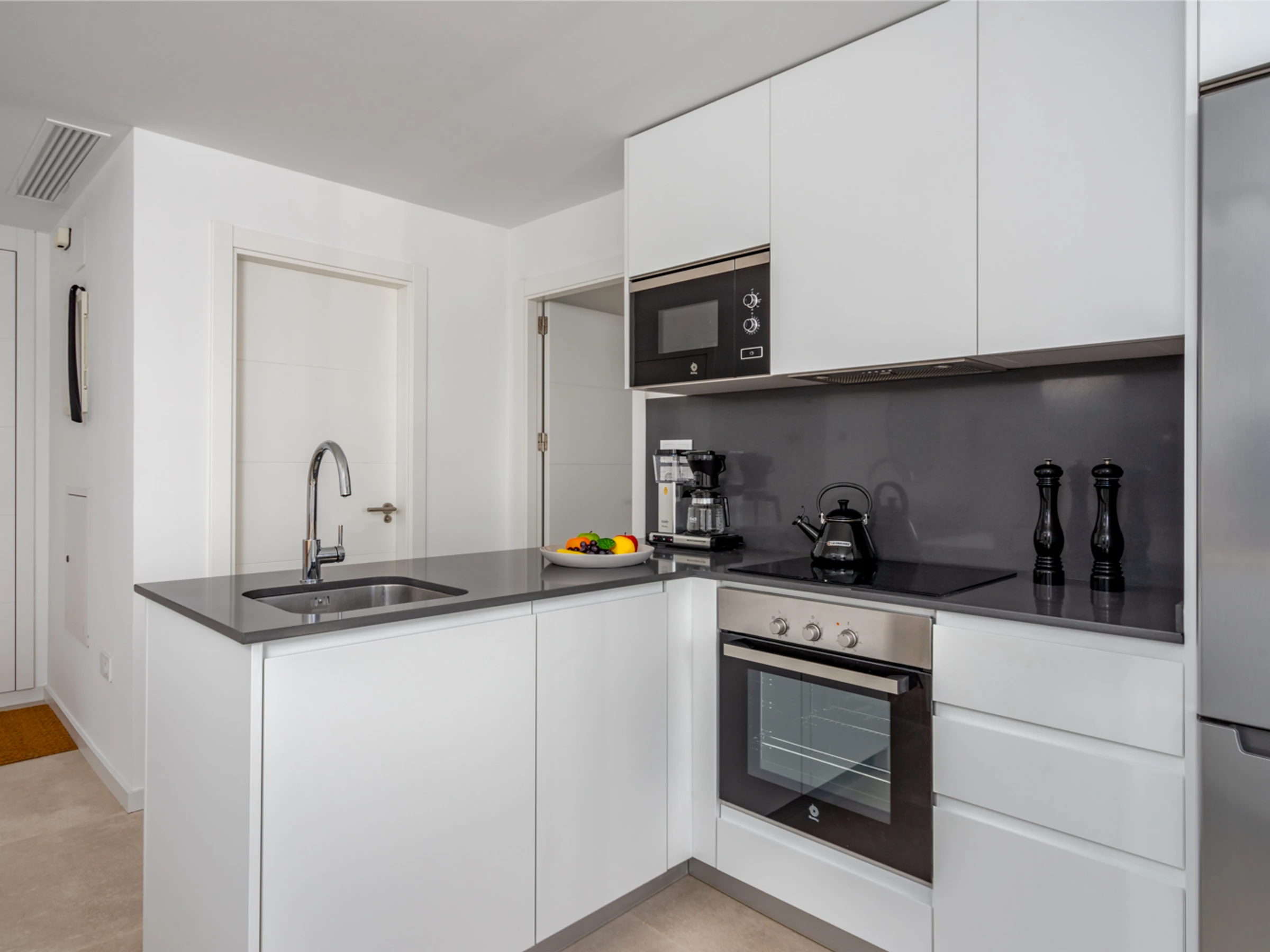 La cuisine, est équipée avec réfrigérateur, micro-ondes, four, congélateur, lave-vaisselle, ustensiles/cuisine, cafetière, grille pain et bouilloire.
