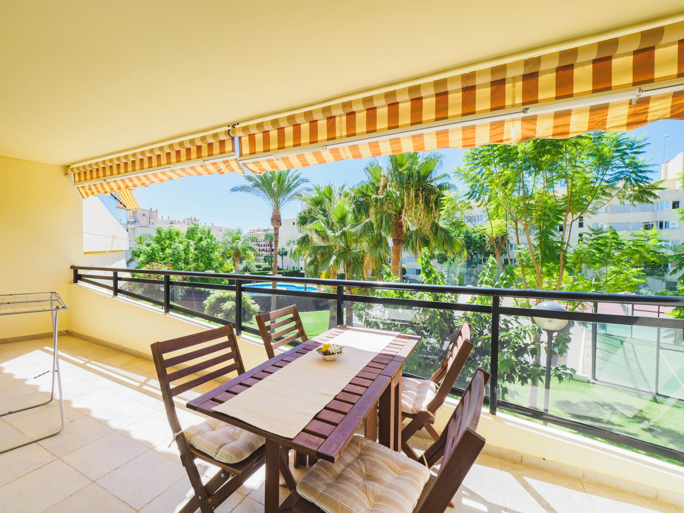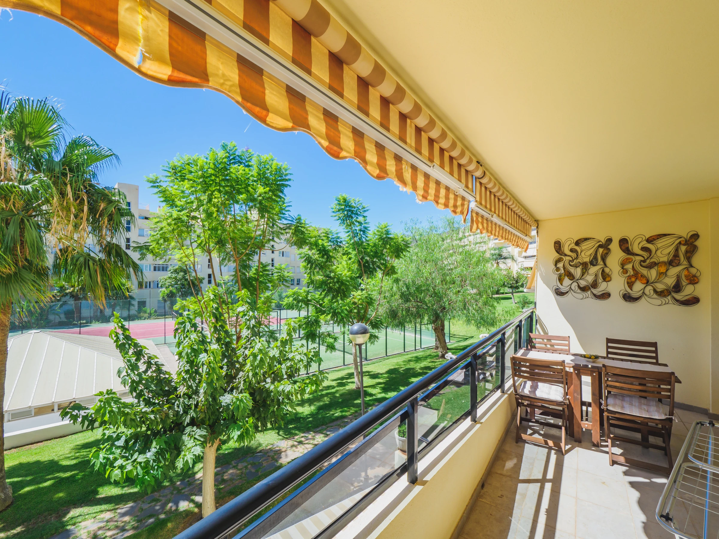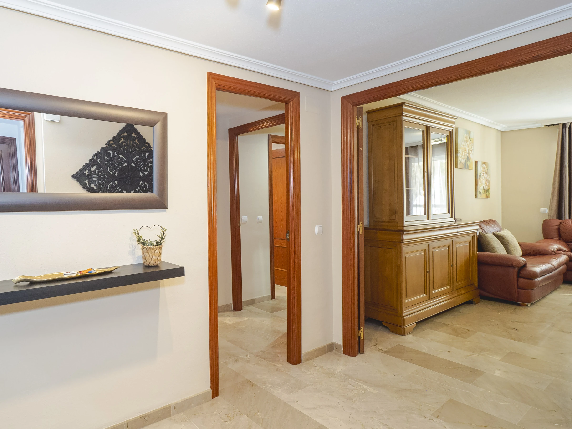 L'appartement est situé au premier étage, avec vue sur le jardin et la piscine. En entrant, vous trouverez un hall d'entrée qui mène à la cuisine à gauche et au salon-salle à manger à droite. La terrasse meublée est idéale pour les petits-déjeuners, déjeuners ou dîners en plein air, profitant du calme et des belles vues.