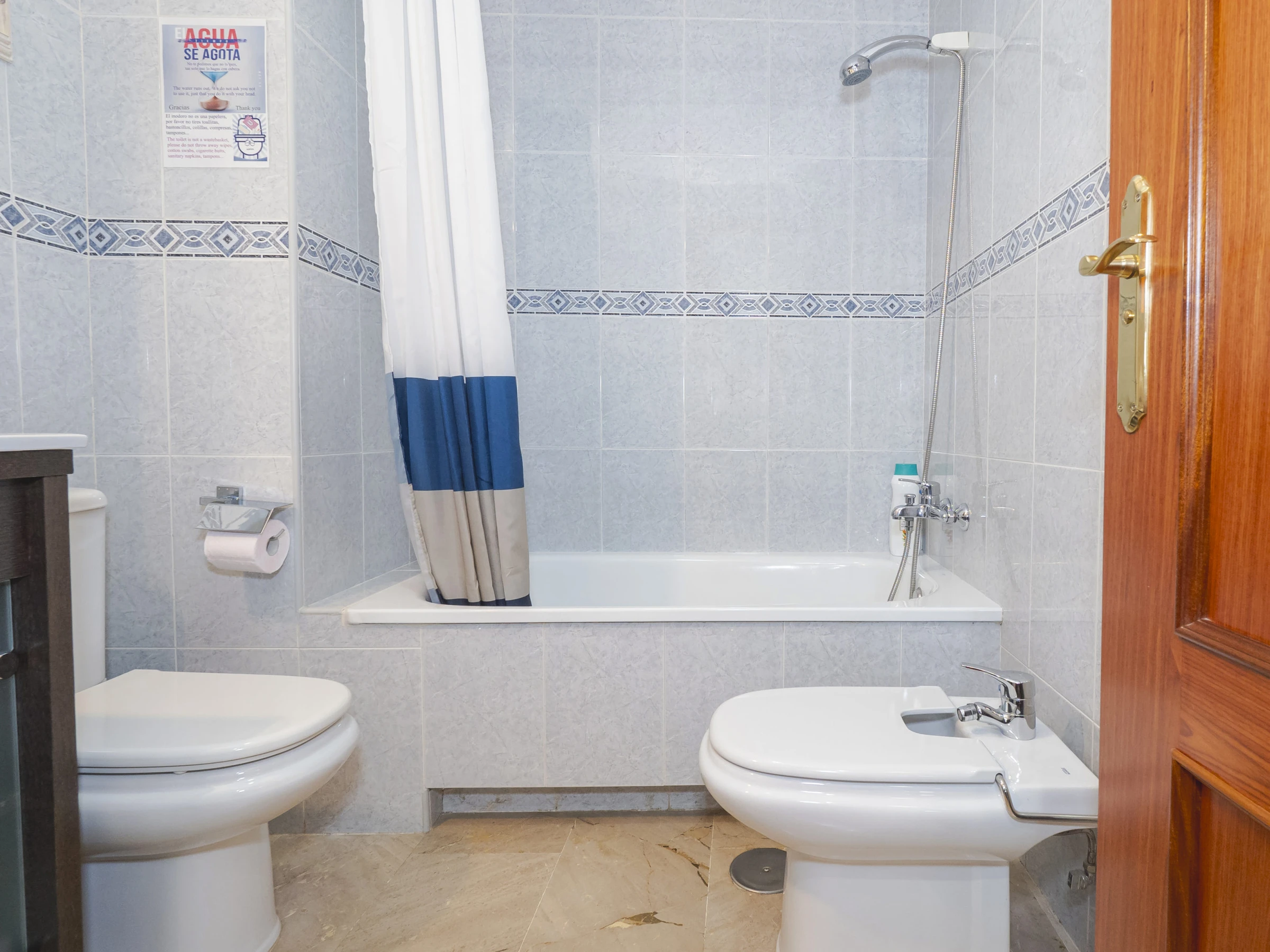 L'appartement dispose de deux chambres : l'une avec deux lits individuels et l'autre avec un lit de matrimoniale avec salle de bain attenante et baignoire. Les deux chambres offrent des fenêtres donnant sur l'extérieur ou sur une cour intérieure et suffisamment d'espace pour ranger les bagages confortablement. De plus, il y a une deuxième salle de bain avec baignoire dans la zone commune.