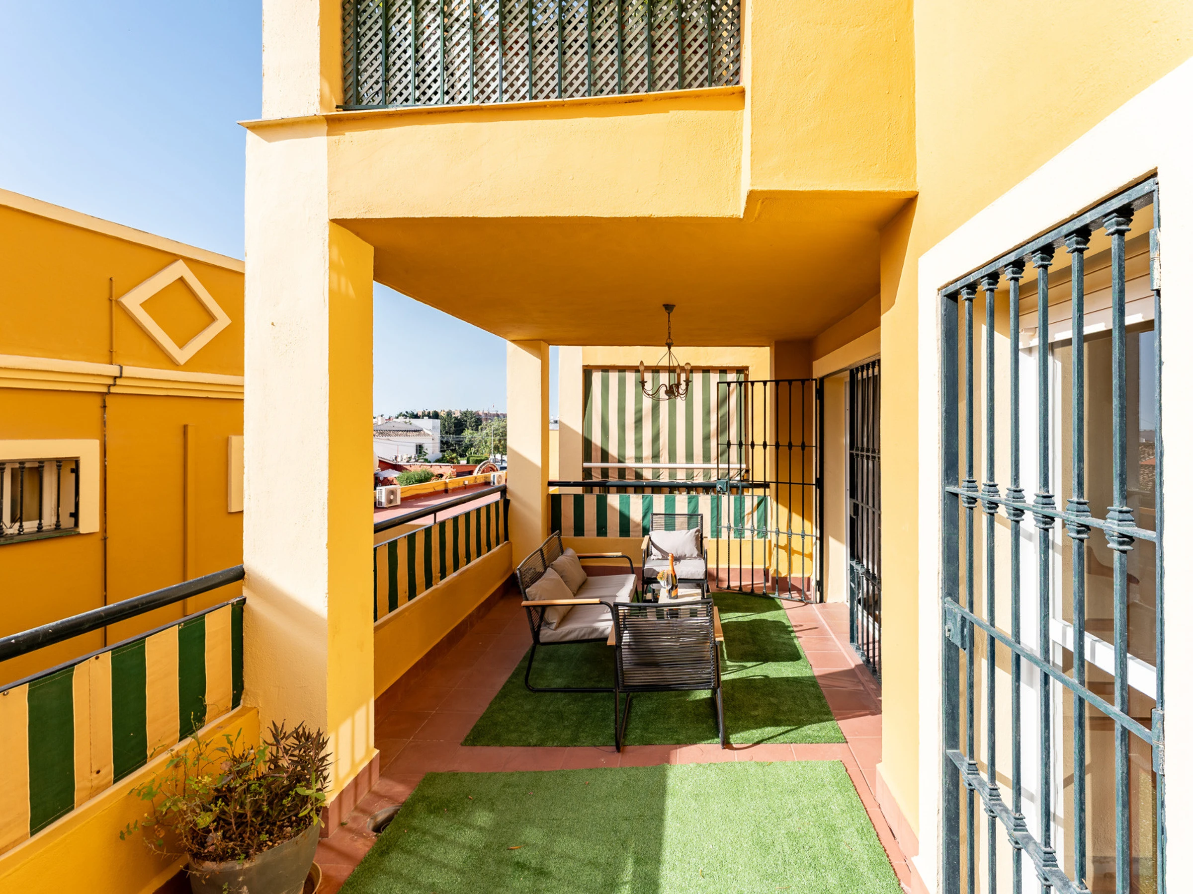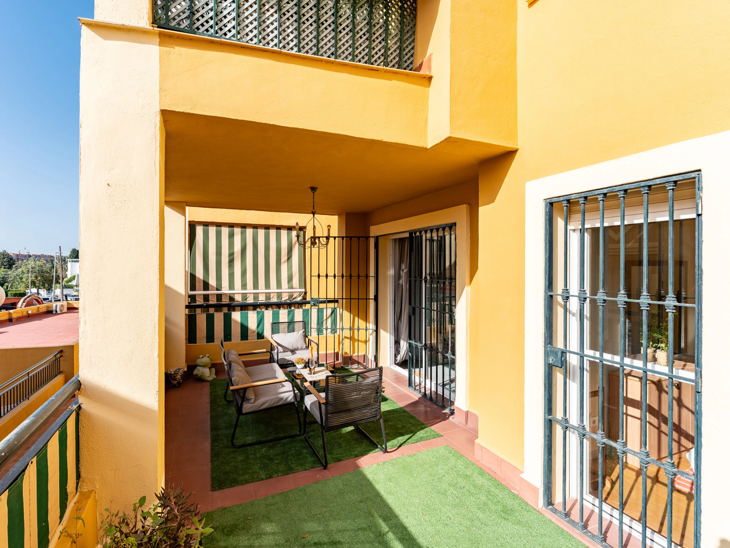 Le salon est spacieux et très lumineux, avec une zone de salle à manger et un accès direct à une grande terrasse ensoleillée, idéale pour profiter de l'air frais, prendre le soleil ou partager des repas à l'extérieur.