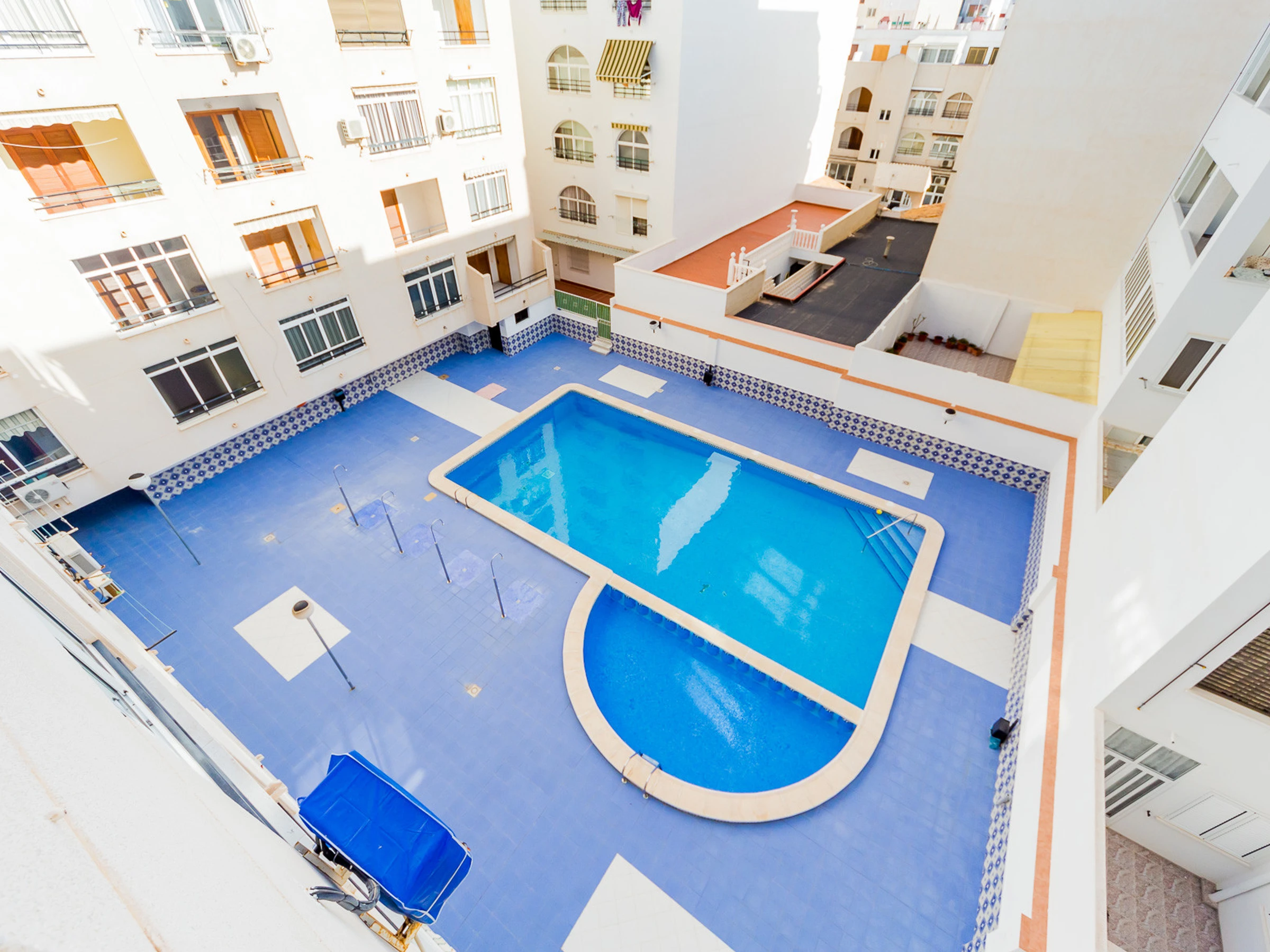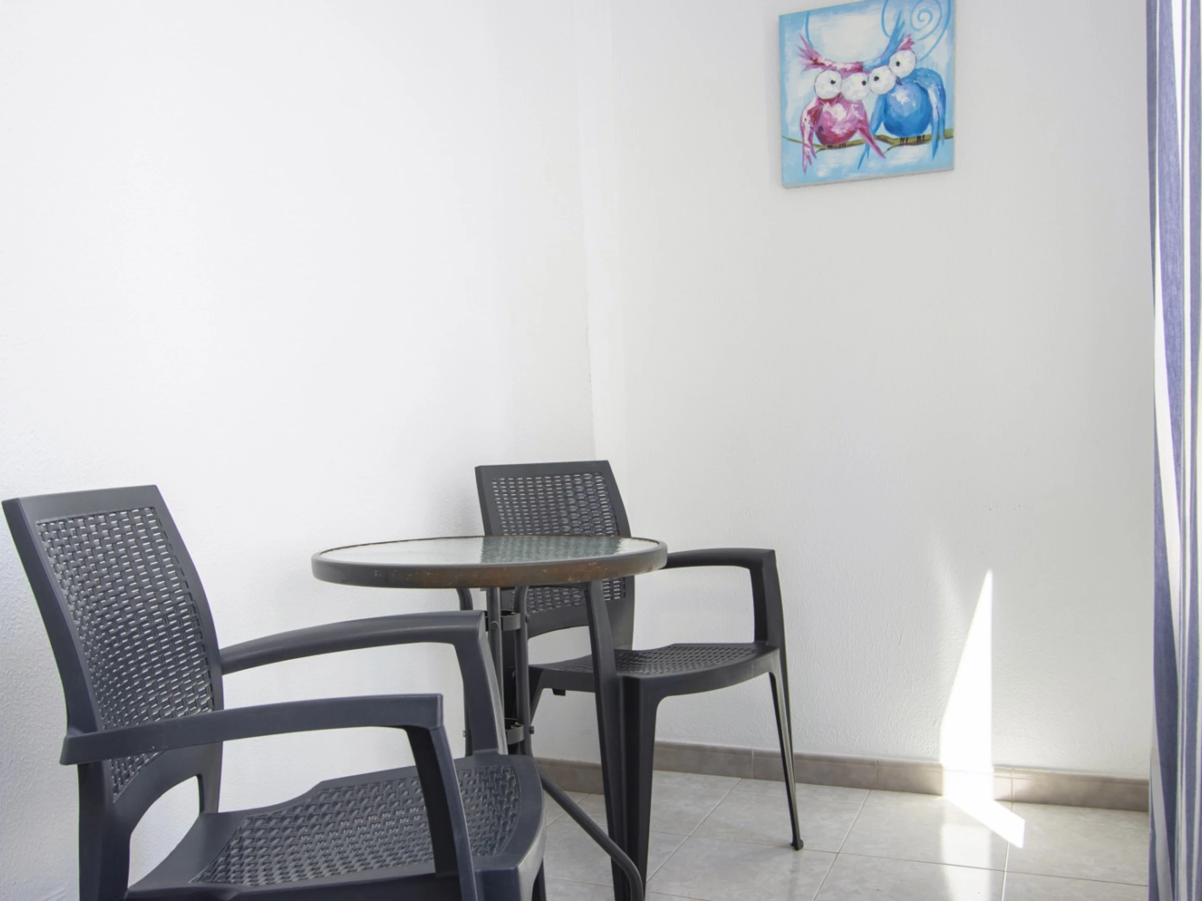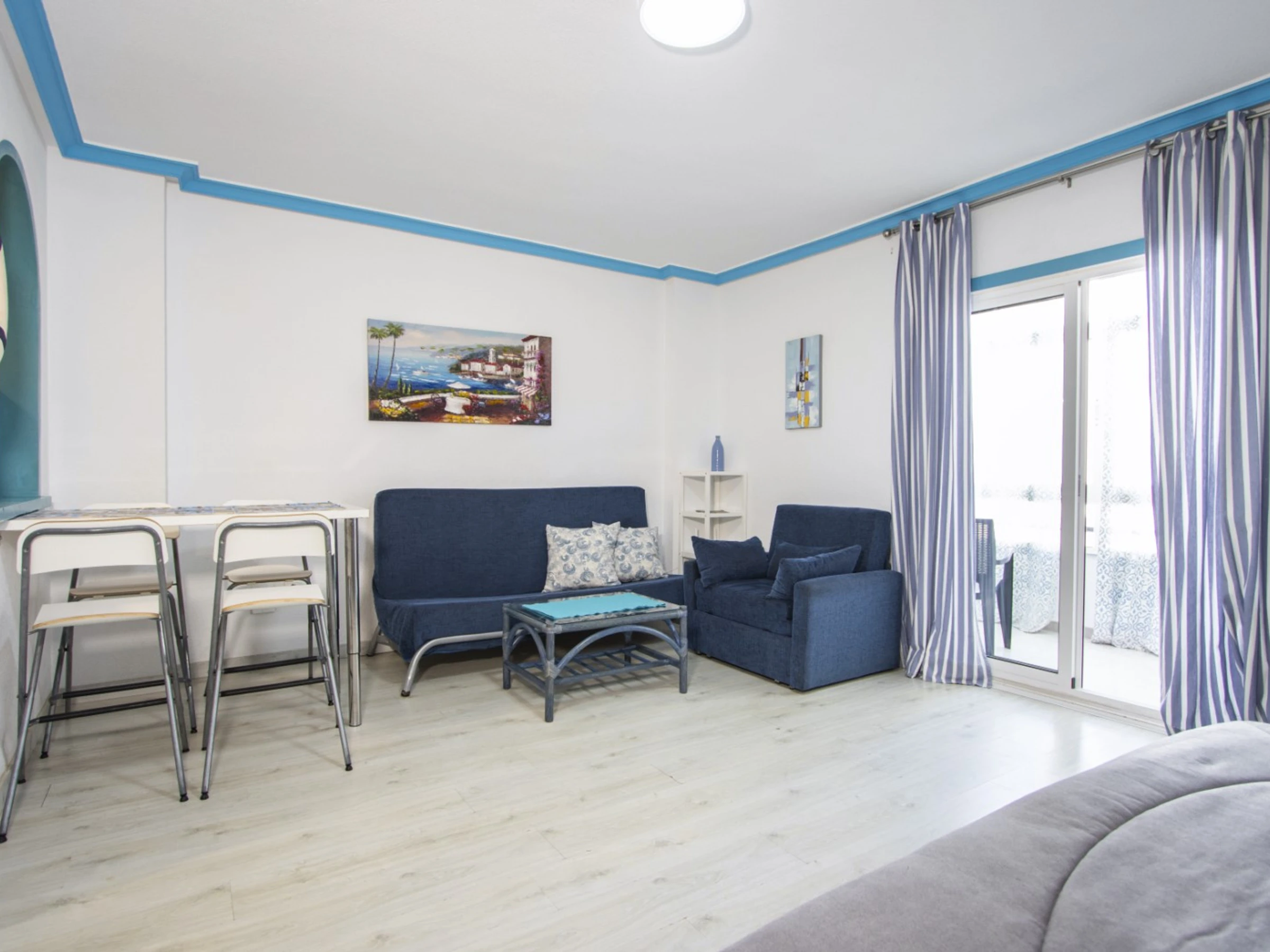 Un studio cosy à louer dans un immeuble avec piscine ! La superficie de l'appartement est de 47 m2 et se compose d'un salon, d'une salle de bain, d'une cuisine à la française et d'un balcon vitré donnant sur la piscine. Il y a tout le nécessaire pour vivre et se détendre : meubles neufs, appareils électroménagers, vaisselle, linge de lit et serviettes. Le salon est équipé de la climatisation et de la télévision espagnole. Le prix de la location de sept jours ou plus comprend Internet (moins de sept jours - 20 euros). Il y a du mobilier d'été sur le balcon. Dans la cour de la maison se trouve une grande piscine avec son propre territoire.