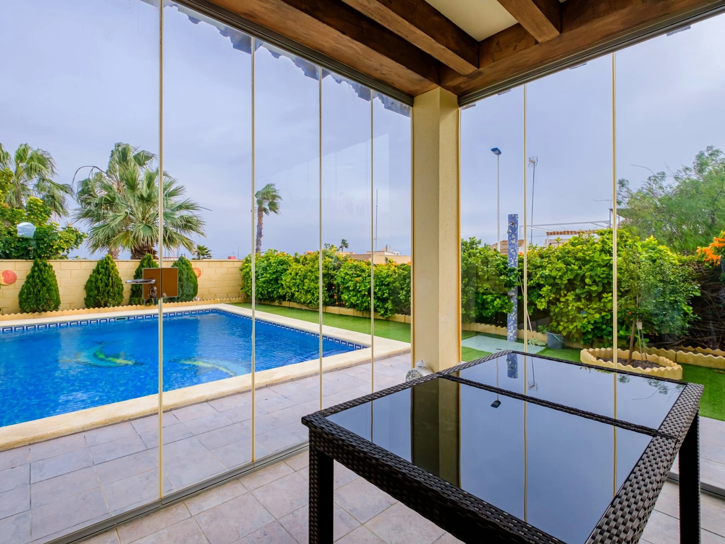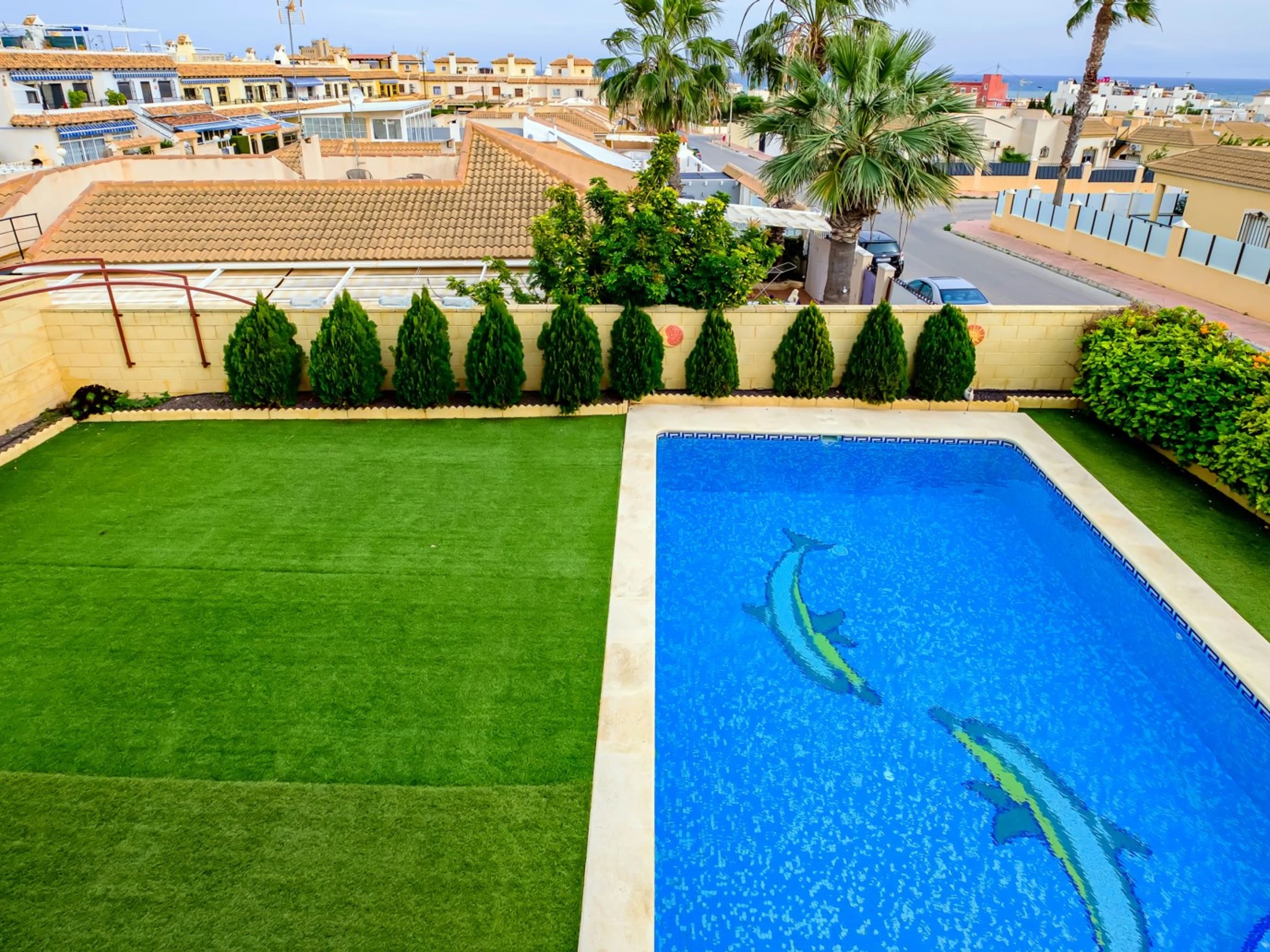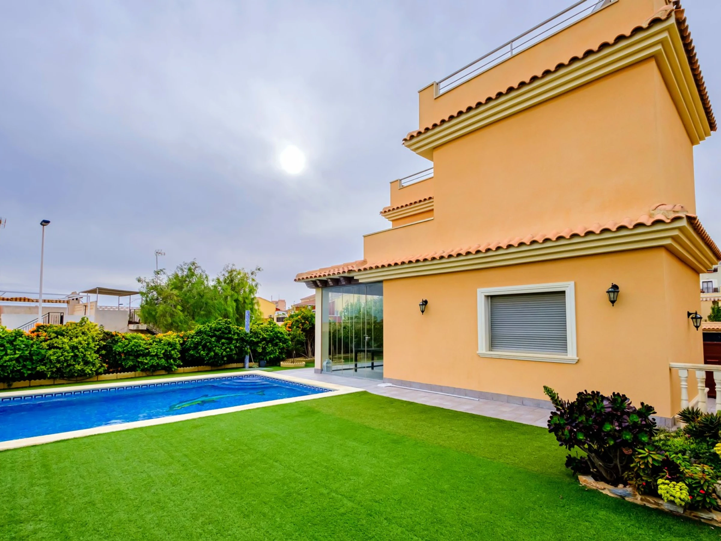 Nous proposons à la location touristique une villa de deux étages avec une piscine et un grand espace vert à 400 mètres de la mer. La villa se compose de deux salons, trois chambres, une cuisine séparée, trois salles de bain, une terrasse vitrée, un balcon, deux solariums. La maison a tout ce dont vous avez besoin pour vivre et vous divertir : meubles, appareils électroménagers (y compris une cafetière), vaisselle, draps et serviettes. Climatisation centrale, TV espagnole, Internet sans fil. Le quartier dispose d'une infrastructure bien développée : à 200 mètres se trouve le supermarché "Consum", le café le plus proche est à 50 mètres. La mer est à 400 mètres, mais la plage de Los Locos elle-même est à environ 650 mètres. Possibilité d'hébergement - jusqu'à 7 personnes (pas d'animaux !). Fumer n'est autorisé que dans les espaces ouverts!