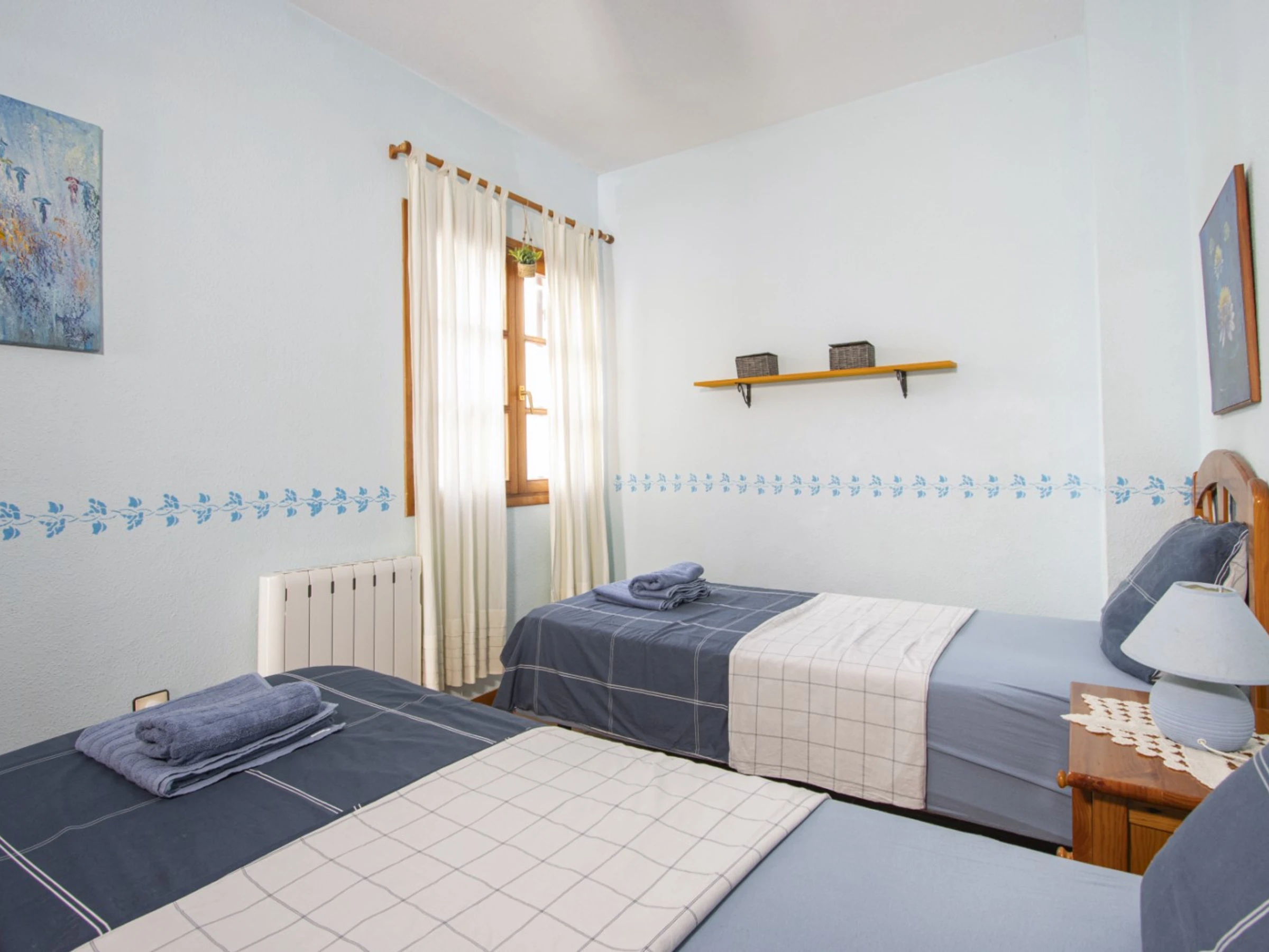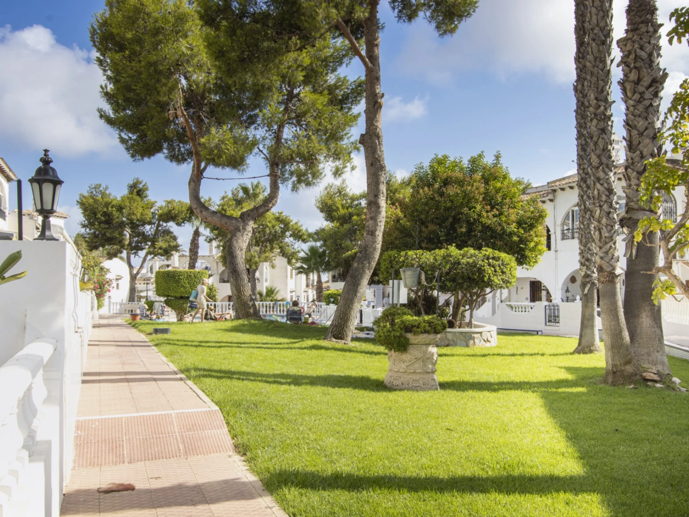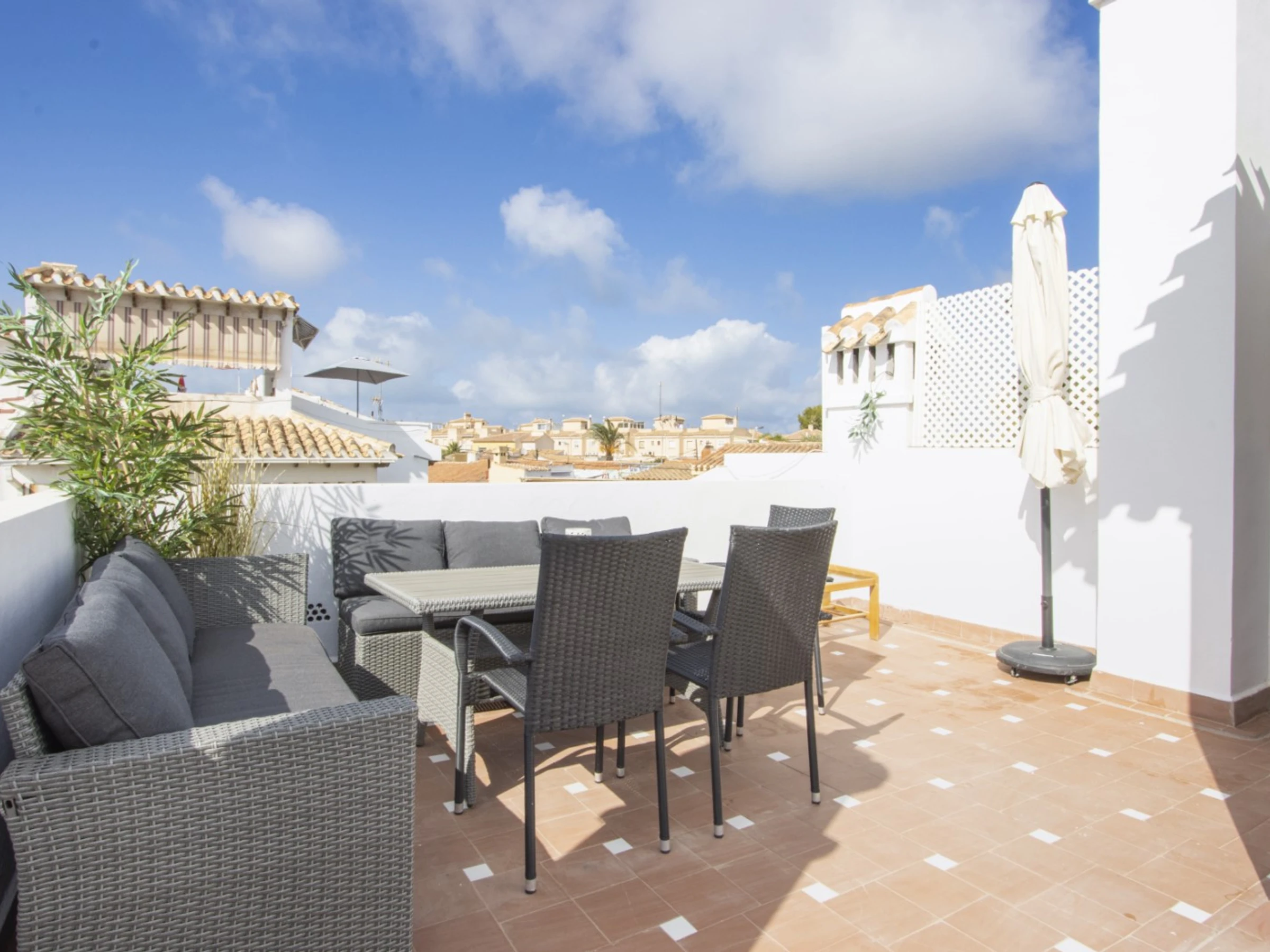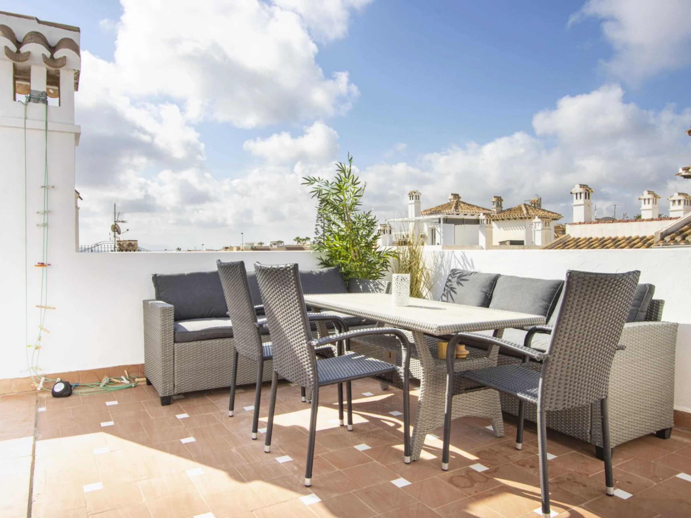Nous proposons à la location touristique un duplex dans une urbanisation avec piscine et son propre espace vert. L'appartement a une superficie de 87 mètres et se compose d'un séjour avec une véritable cheminée, d'une cuisine à la française et de toilettes à l'étage inférieur, de deux chambres et d'une salle de bain avec baignoire à l'étage supérieur. Il y a aussi un solarium privé avec mobilier de jardin et une terrasse vitrée. Il y a tout ce dont vous avez besoin pour vivre et vous détendre : meubles, électroménager (dont une cafetière et un lave-vaisselle), vaisselle, linge de lit et serviettes. La climatisation est installée dans le salon. Télévision espagnole, Internet sans fil. La région dispose d'infrastructures bien développées. Le supermarché Mercadona se trouve à environ 500 mètres. Il y a aussi des cafés et des bars. La mer et la plage de La Mata sont à environ 1,5 km. Possibilité d'hébergement – jusqu'à 4 personnes (pas d'animaux !). Il est permis de fumer uniquement dans le solarium !