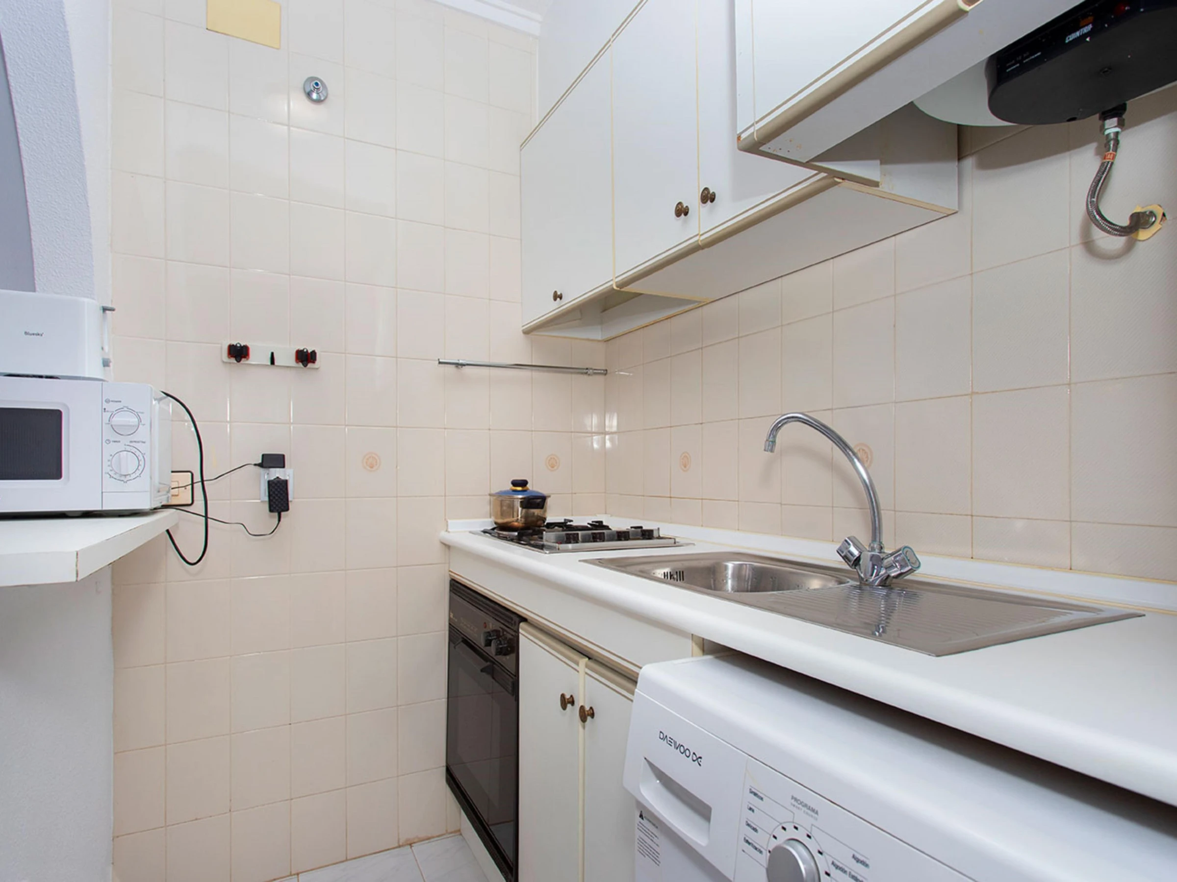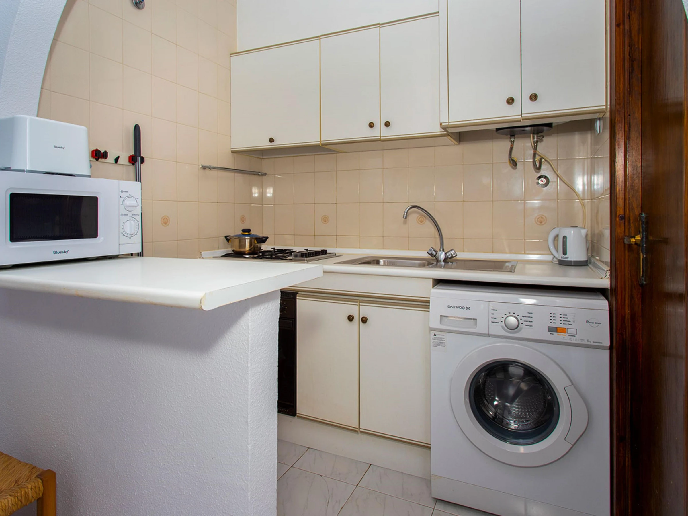 La cuisine, est équipée avec réfrigérateur, micro-ondes, four, congélateur et grille pain.