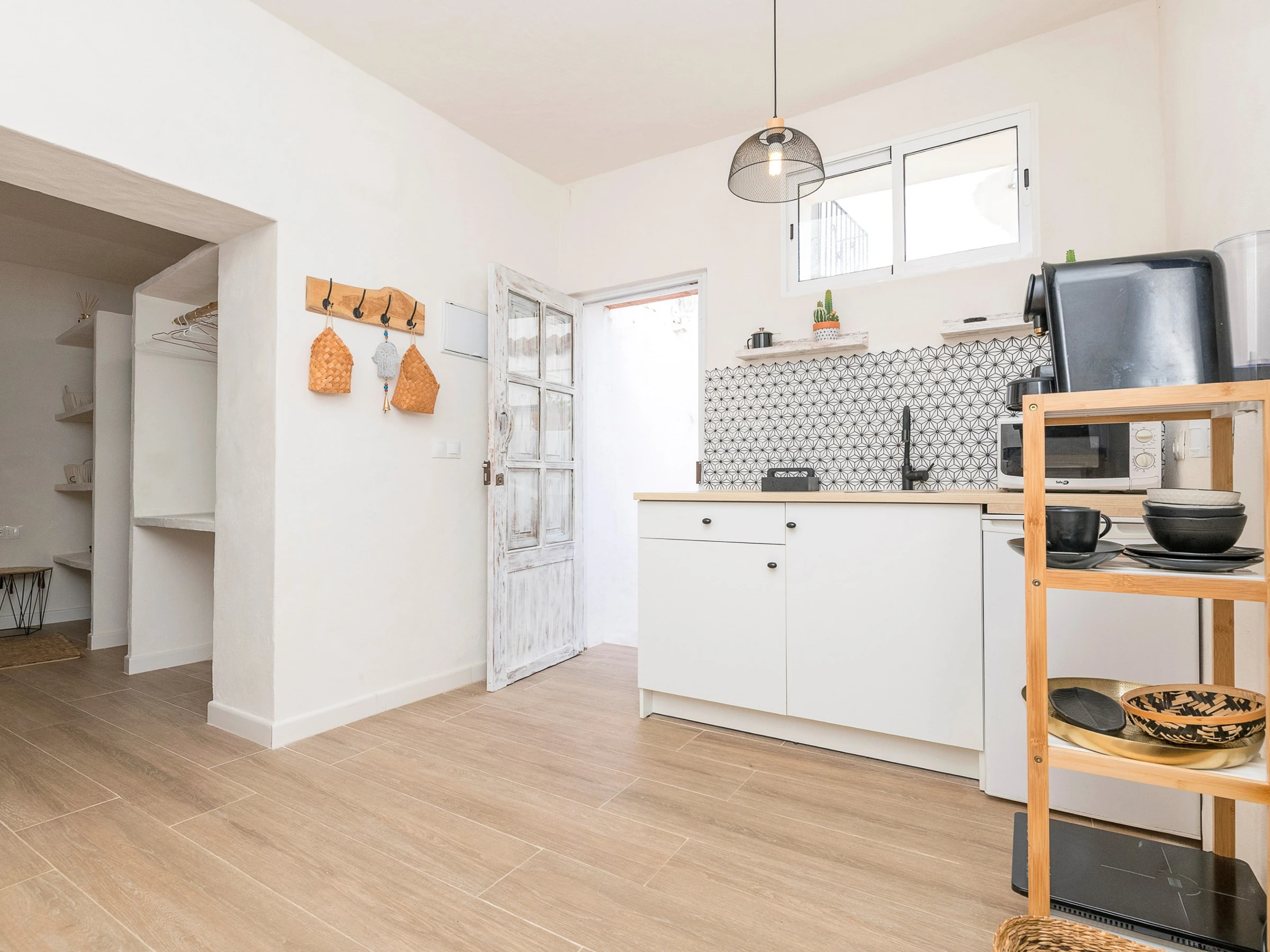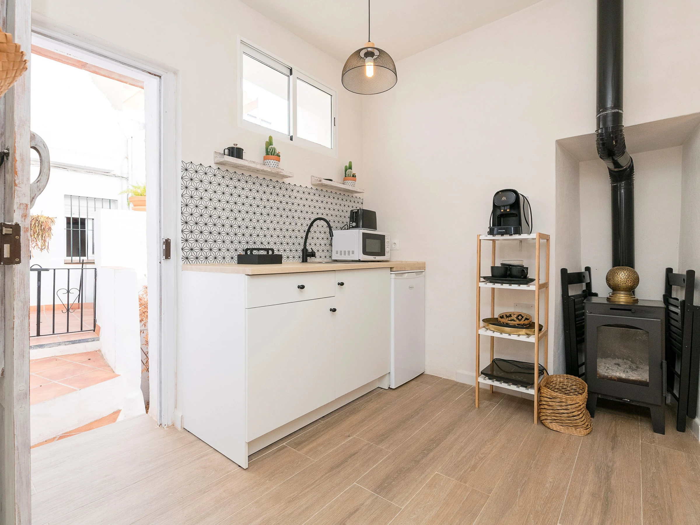 La cuisine, est équipée avec micro-ondes, congélateur, cafetière et grille pain.